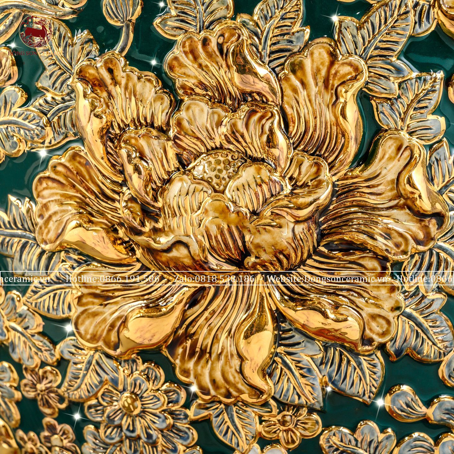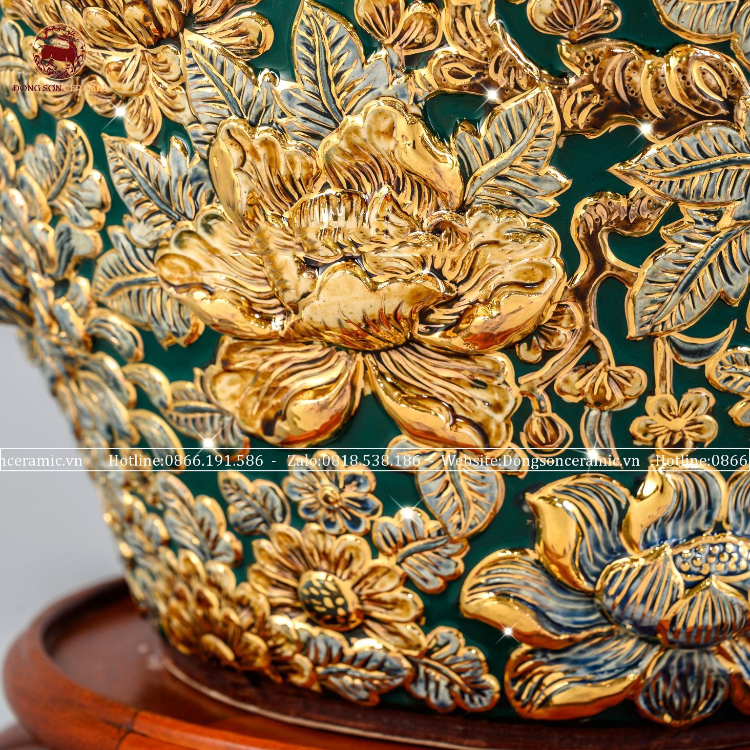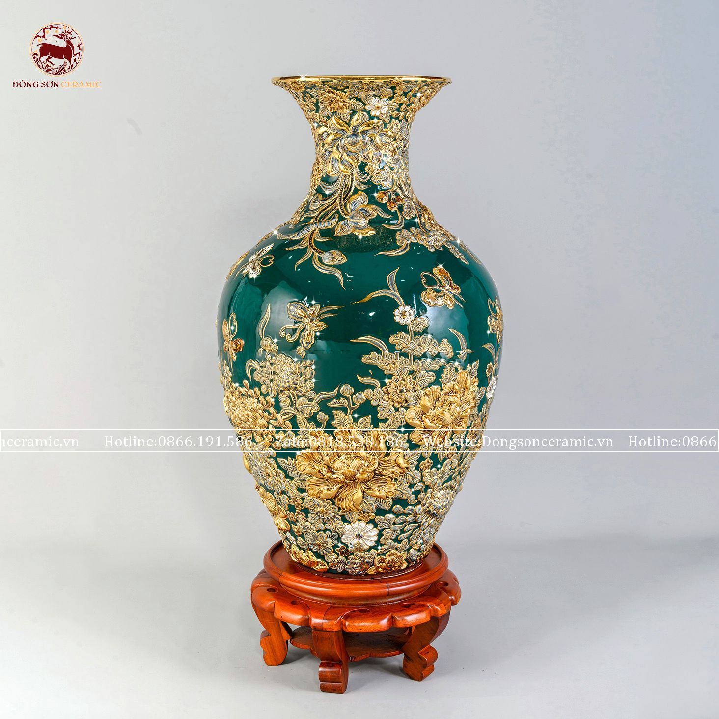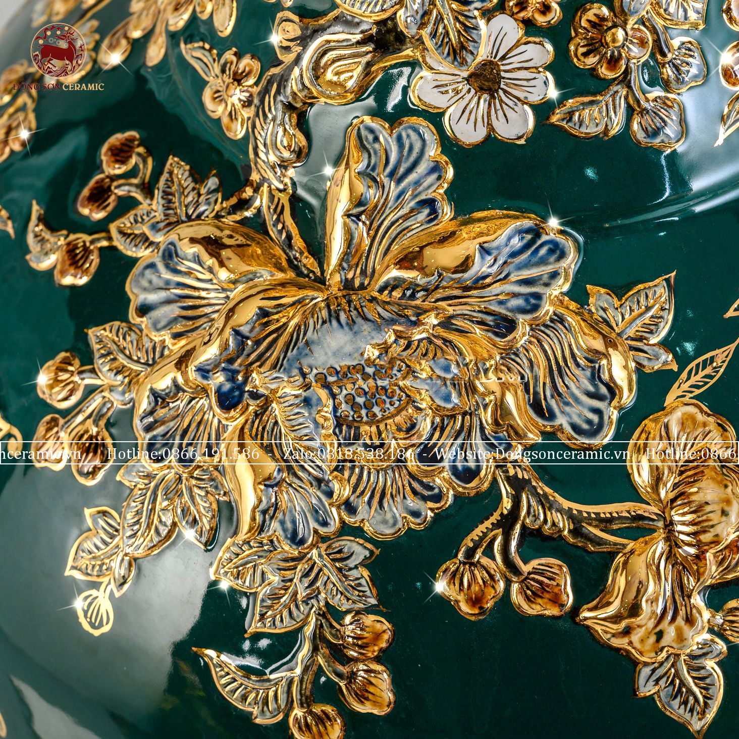 Bảo bình trăm hoa đua nở men sứ xanh lục bảo kích thước cao 70cm đắp nổi kênh bong dát vàng