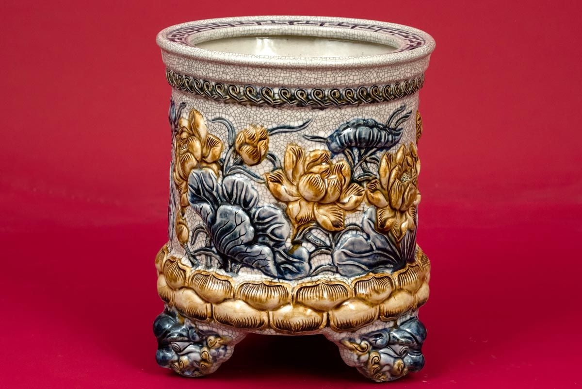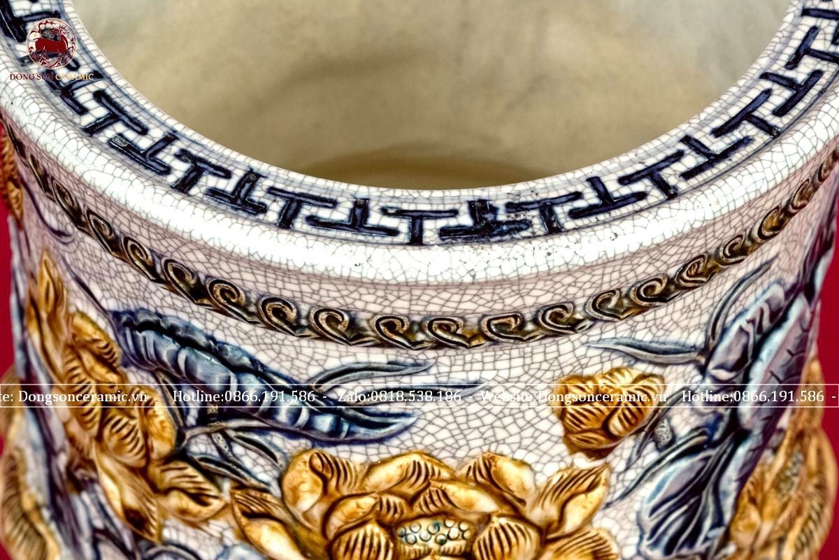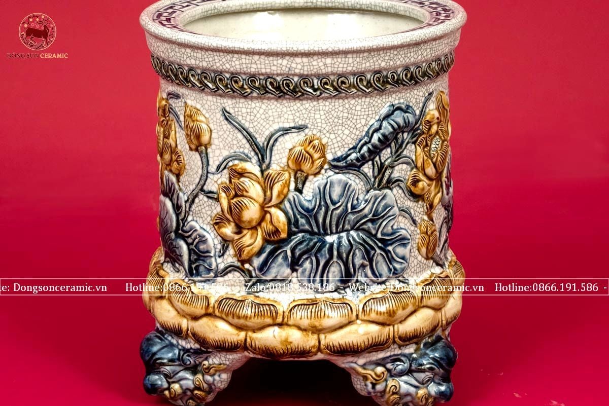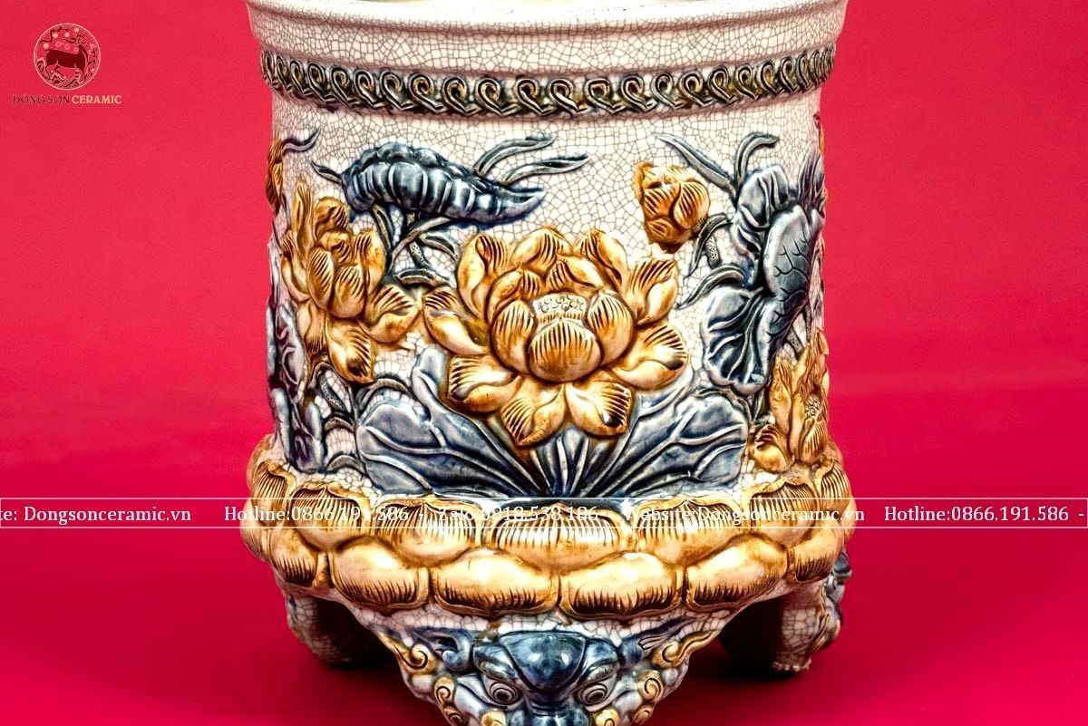 Bát hương họa tiết hoa sen ba chân men rạn xanh lam điểm vàng đường kính 35cm họa tiết đắp nổi