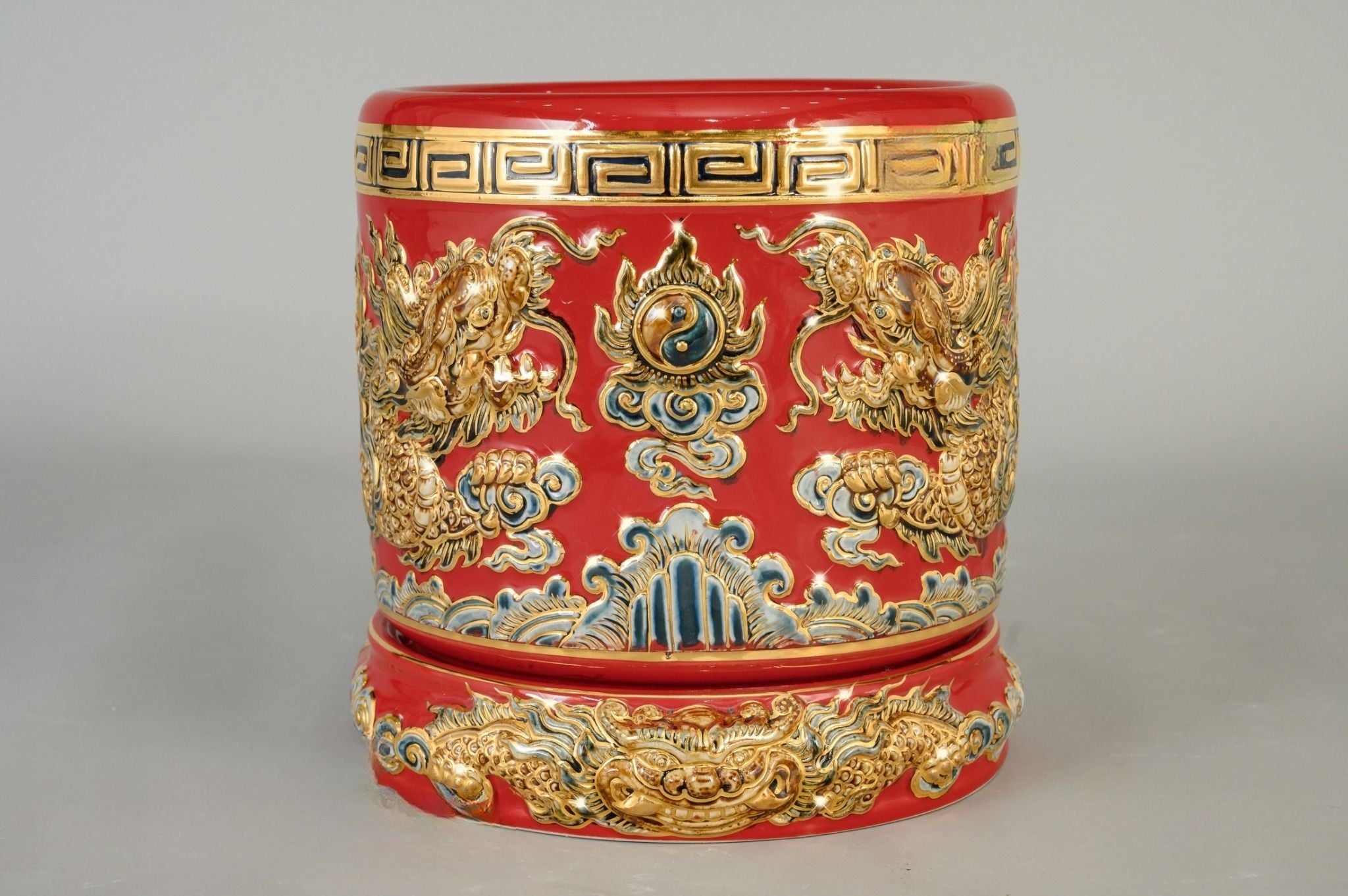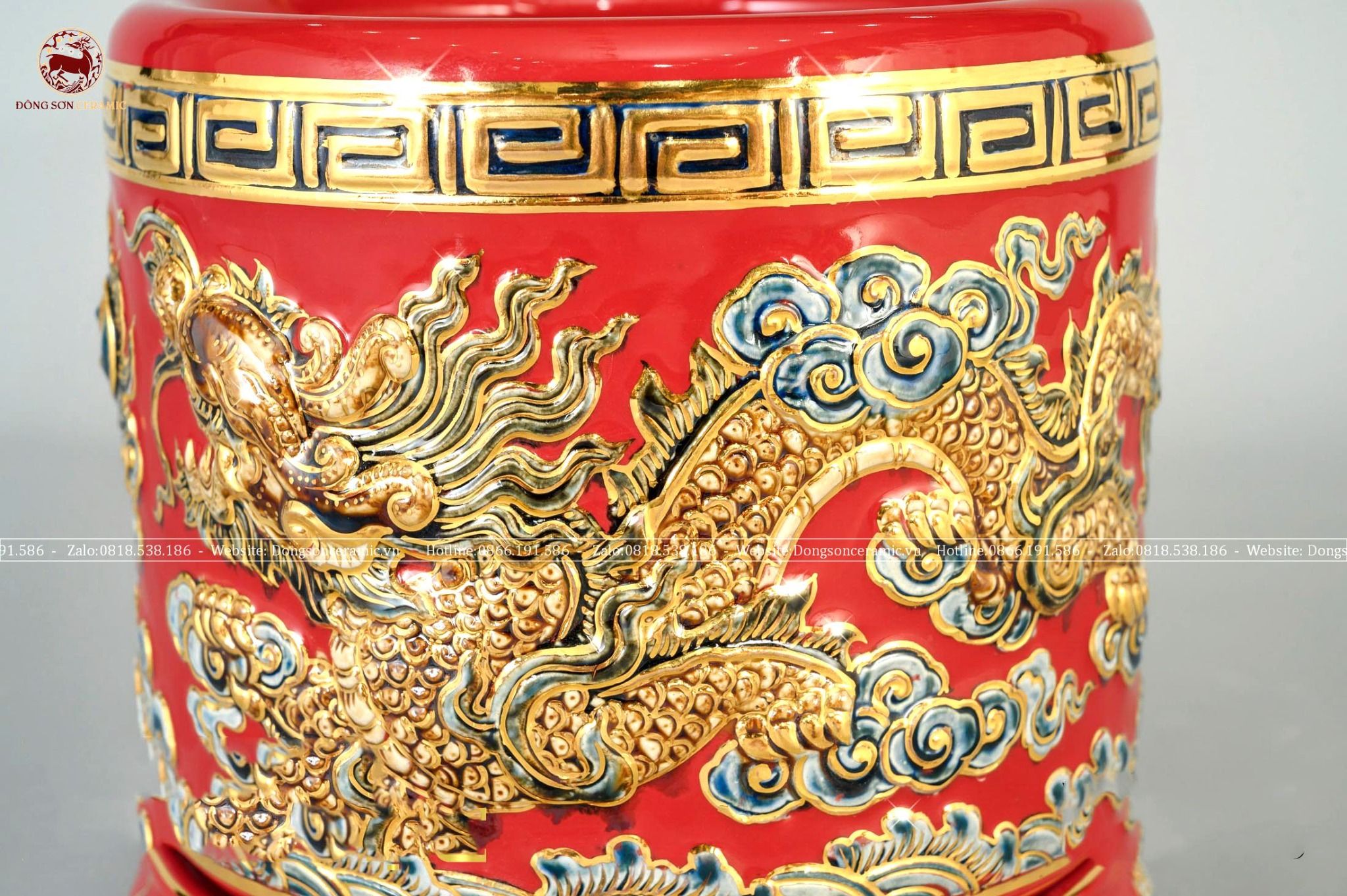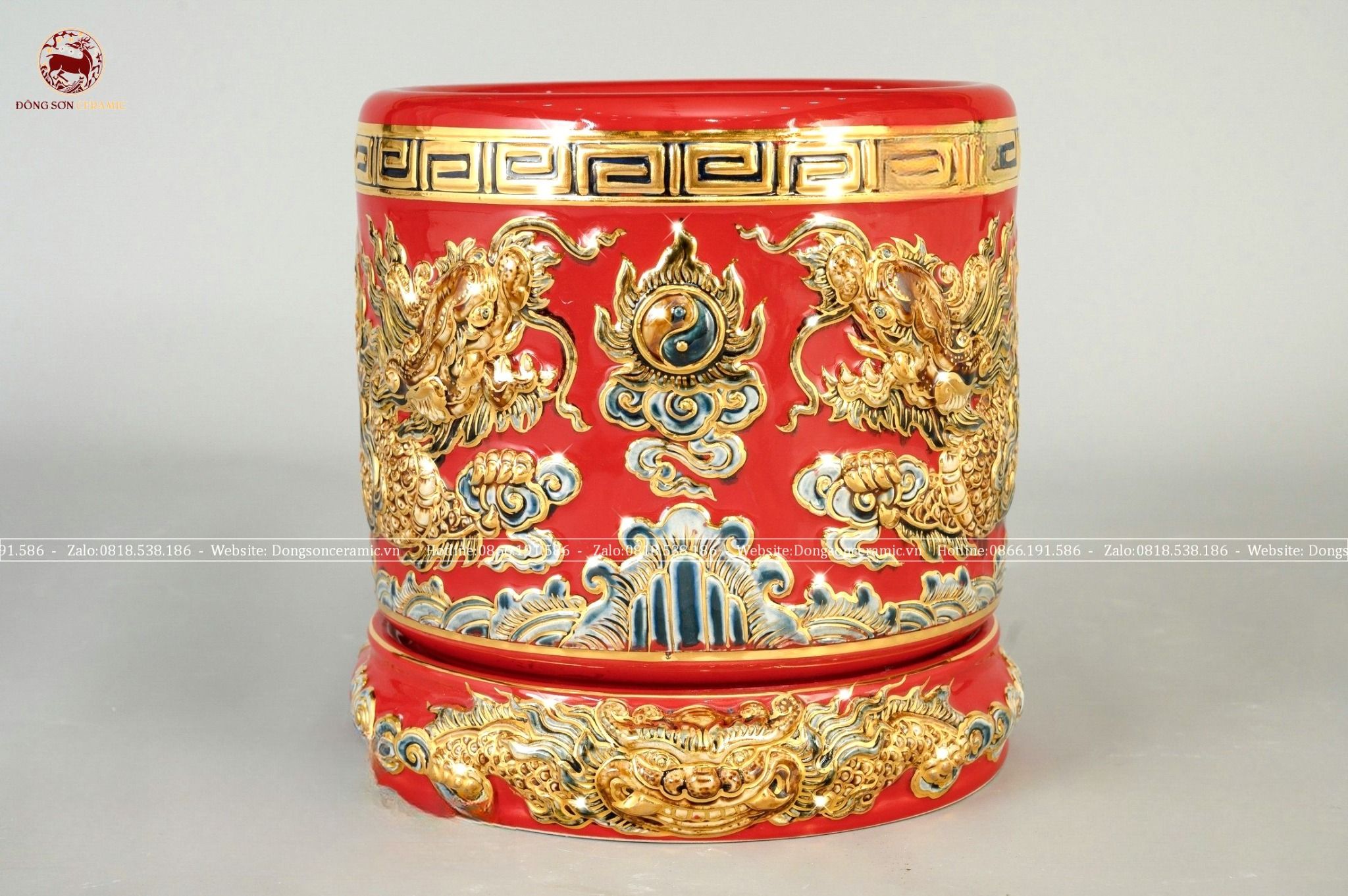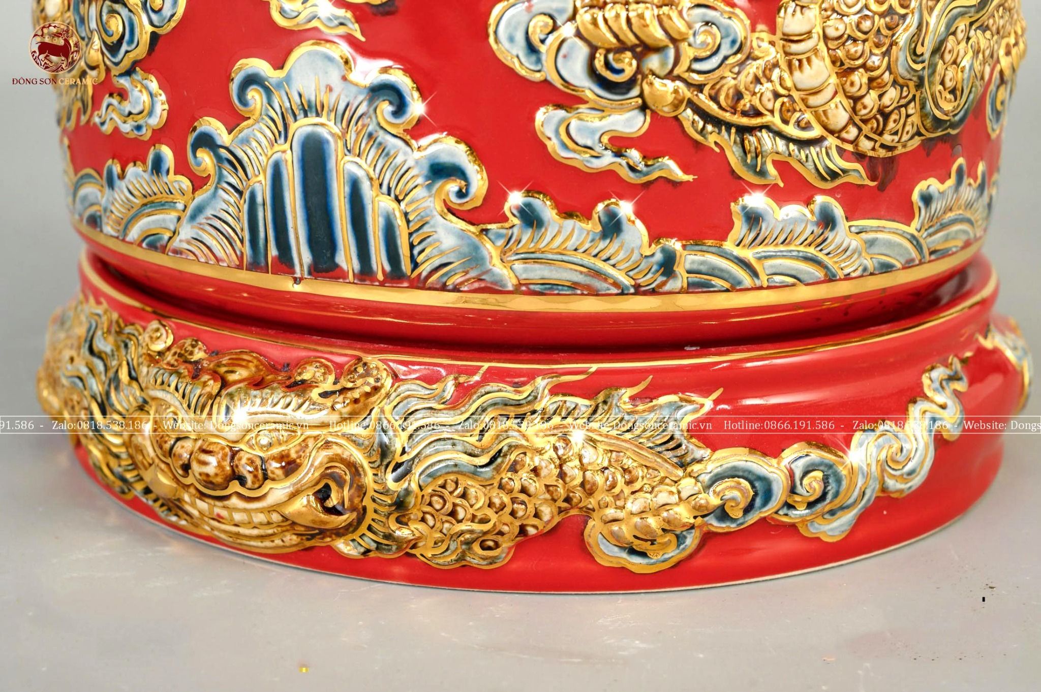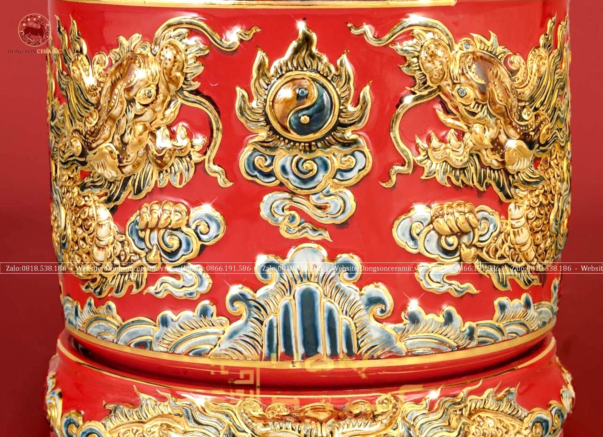 Bát hương song long chầu nguyệt men sứ đỏ đường kính 35cm họa tiết đắp nổi vẽ vàng
