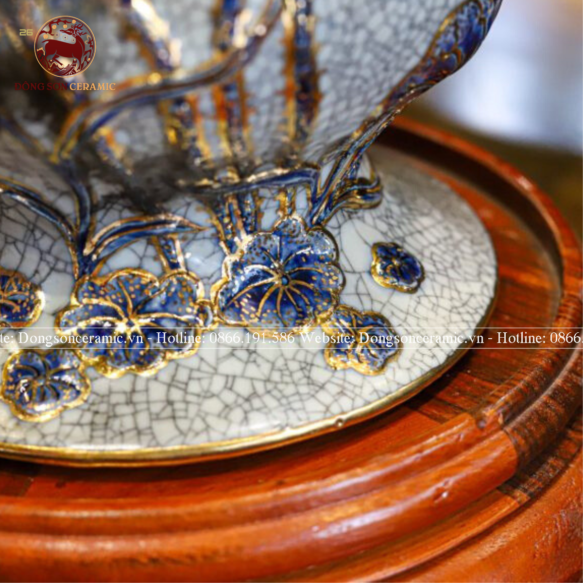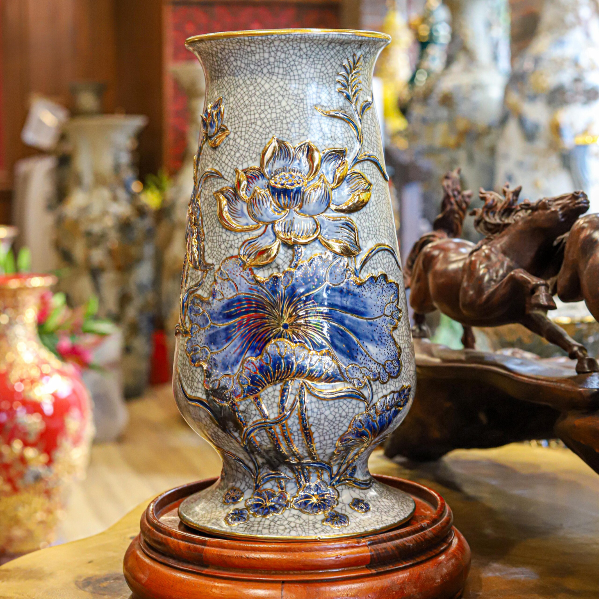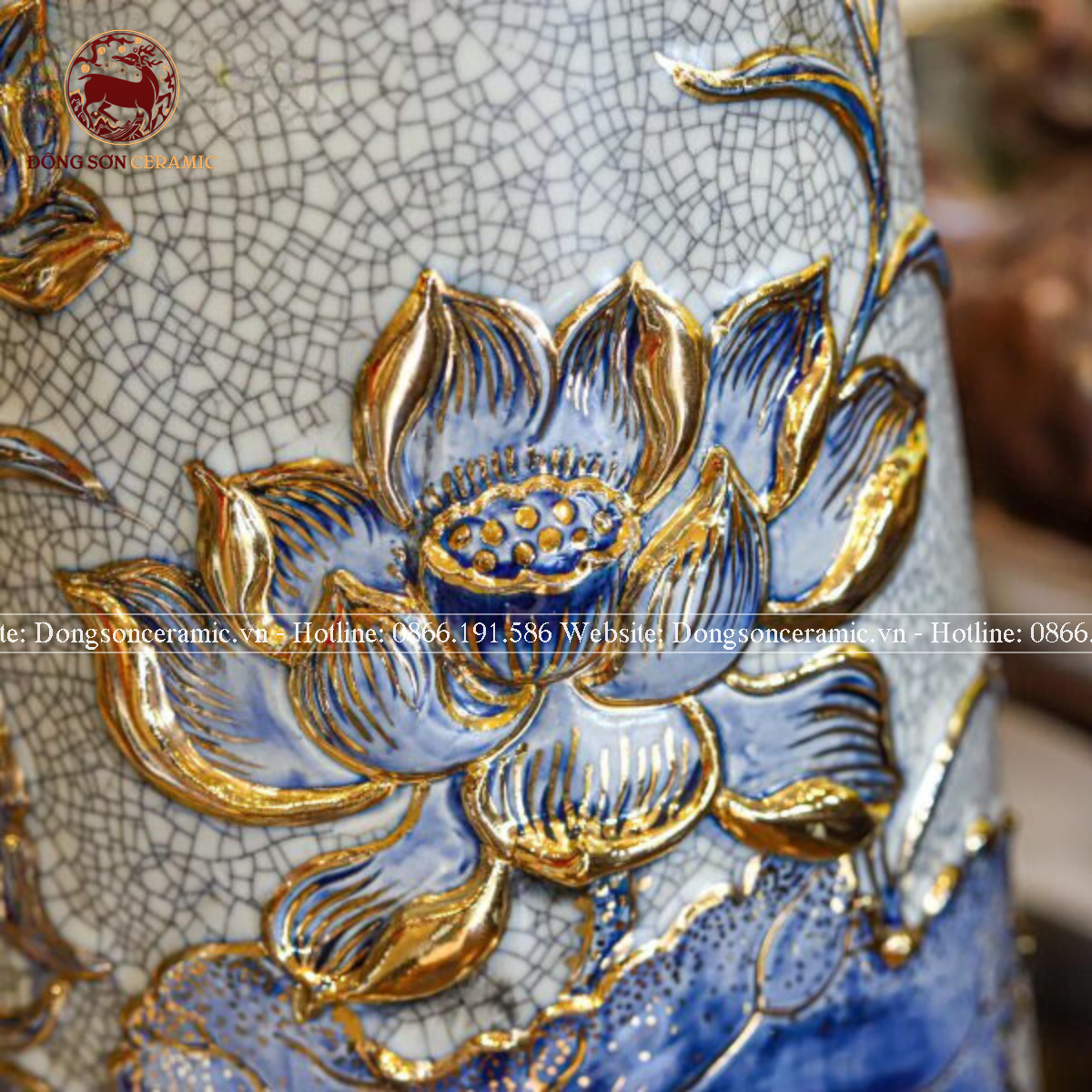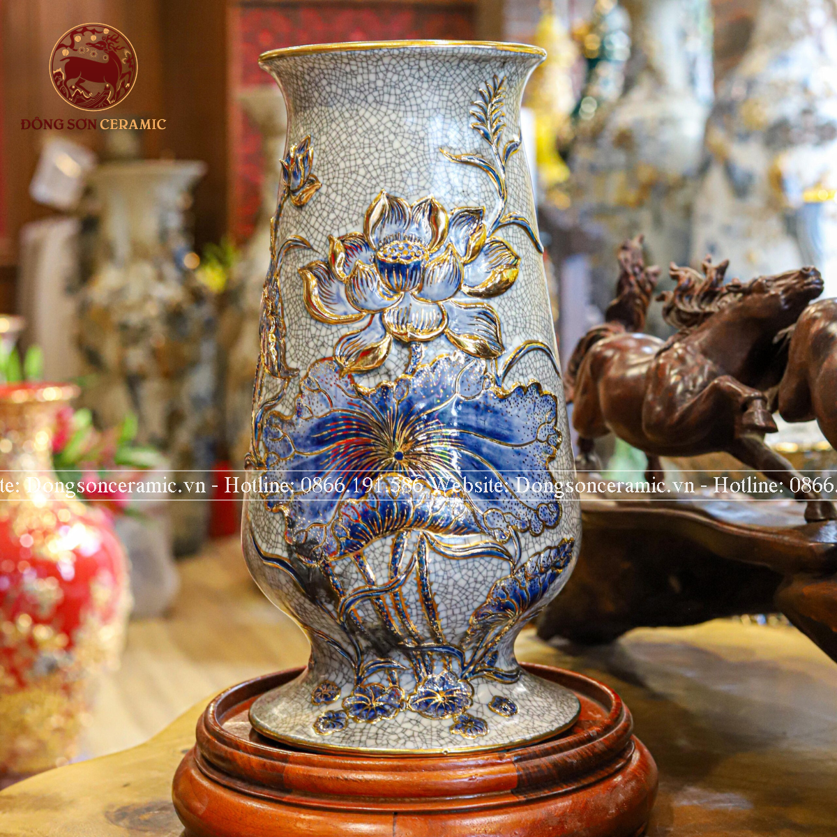 Bình hoa Bát Tràng vuốt tay Liên Hoa Cát Tường men rạn vẽ vàng kích thước 30cm