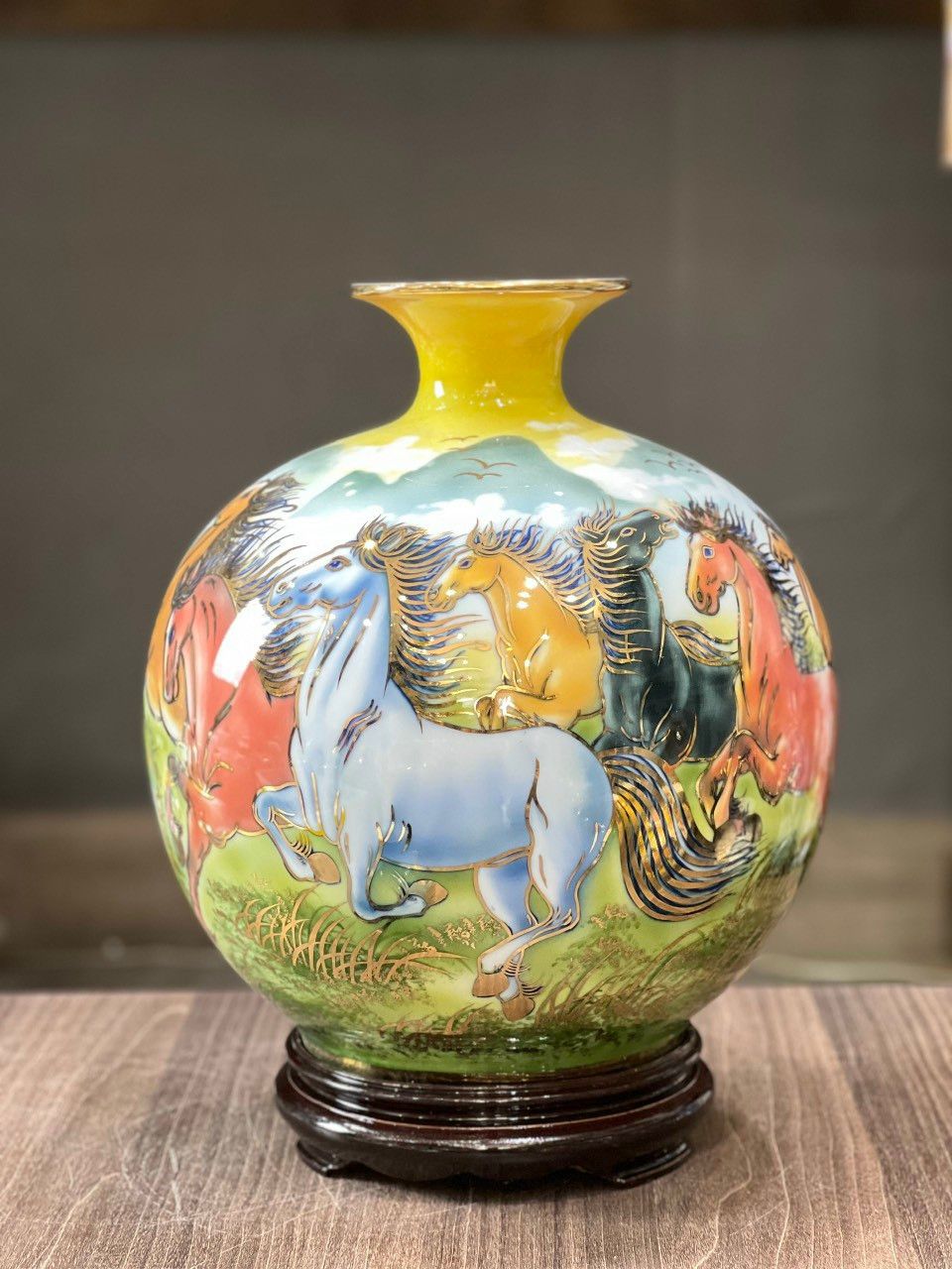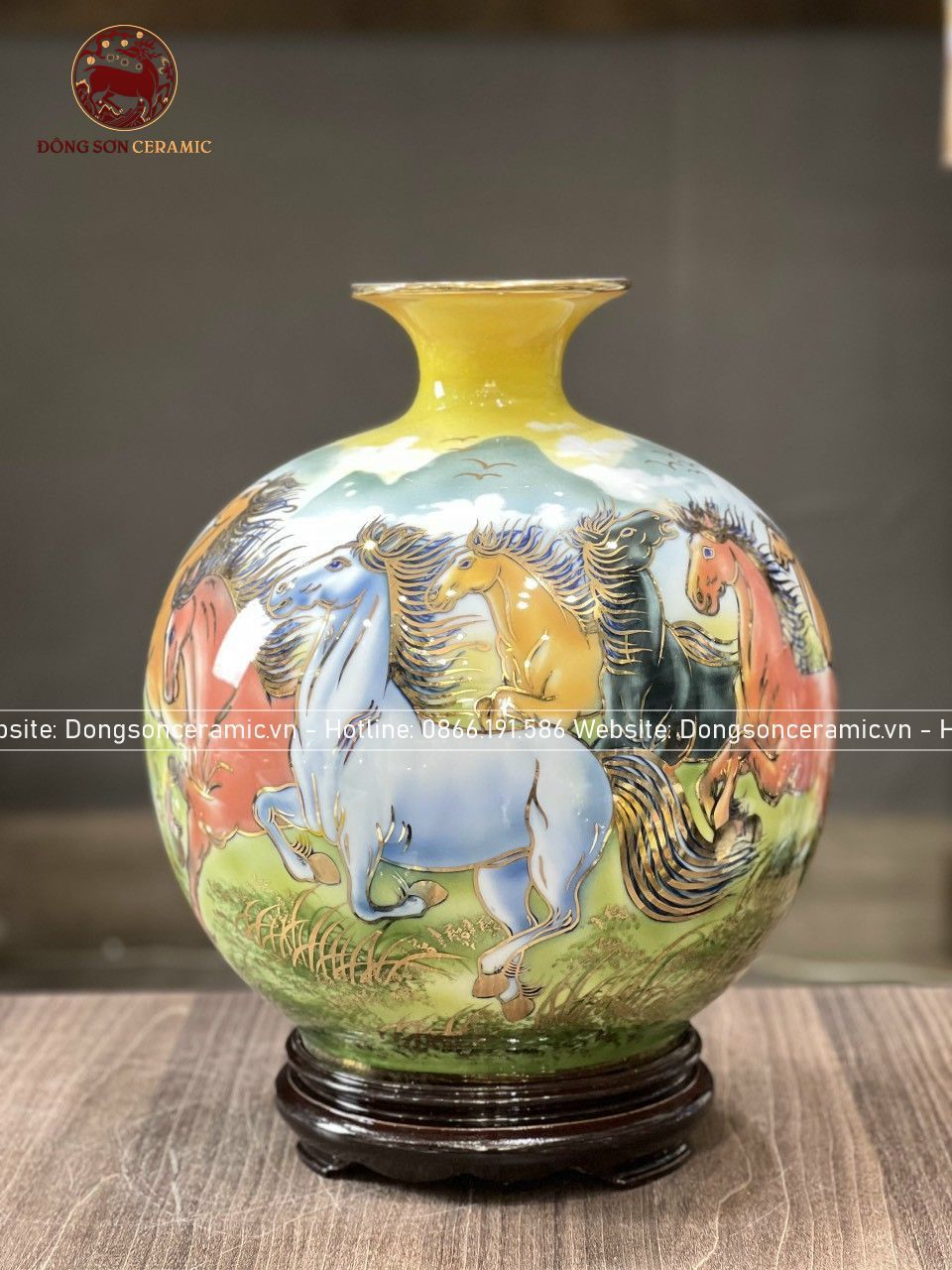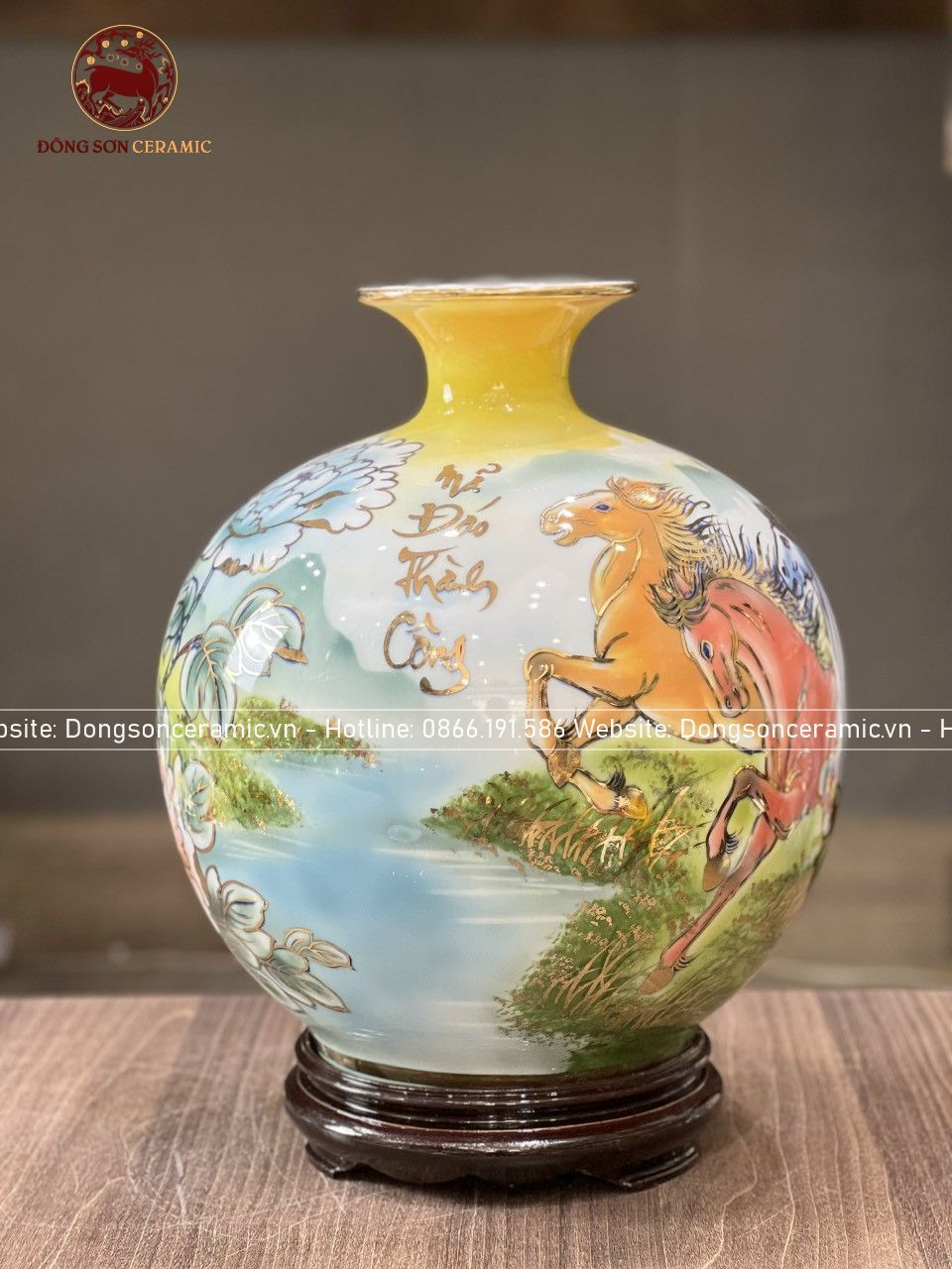 Bình Hút Tài Lộc gốm Bát Tràng mã đáo thành công men màu vẽ vàng kích thước 30cm