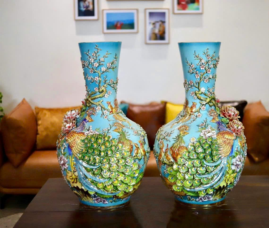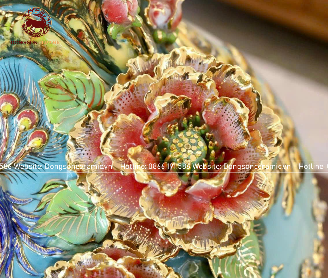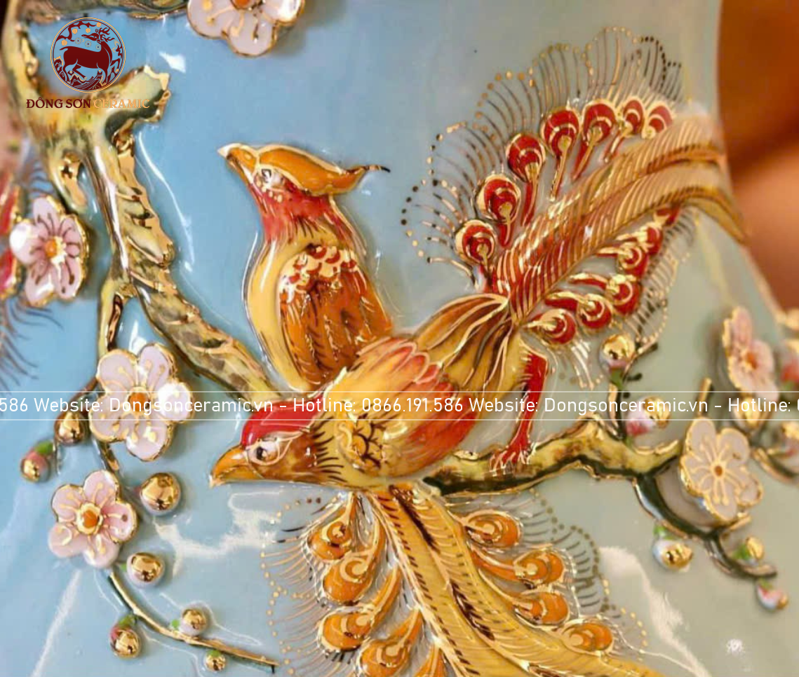 Bình phú quý Bát Tràng công danh phú quý men xanh đắp nổi vẽ vàng kích thước 72cm