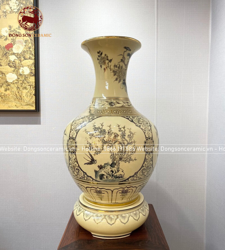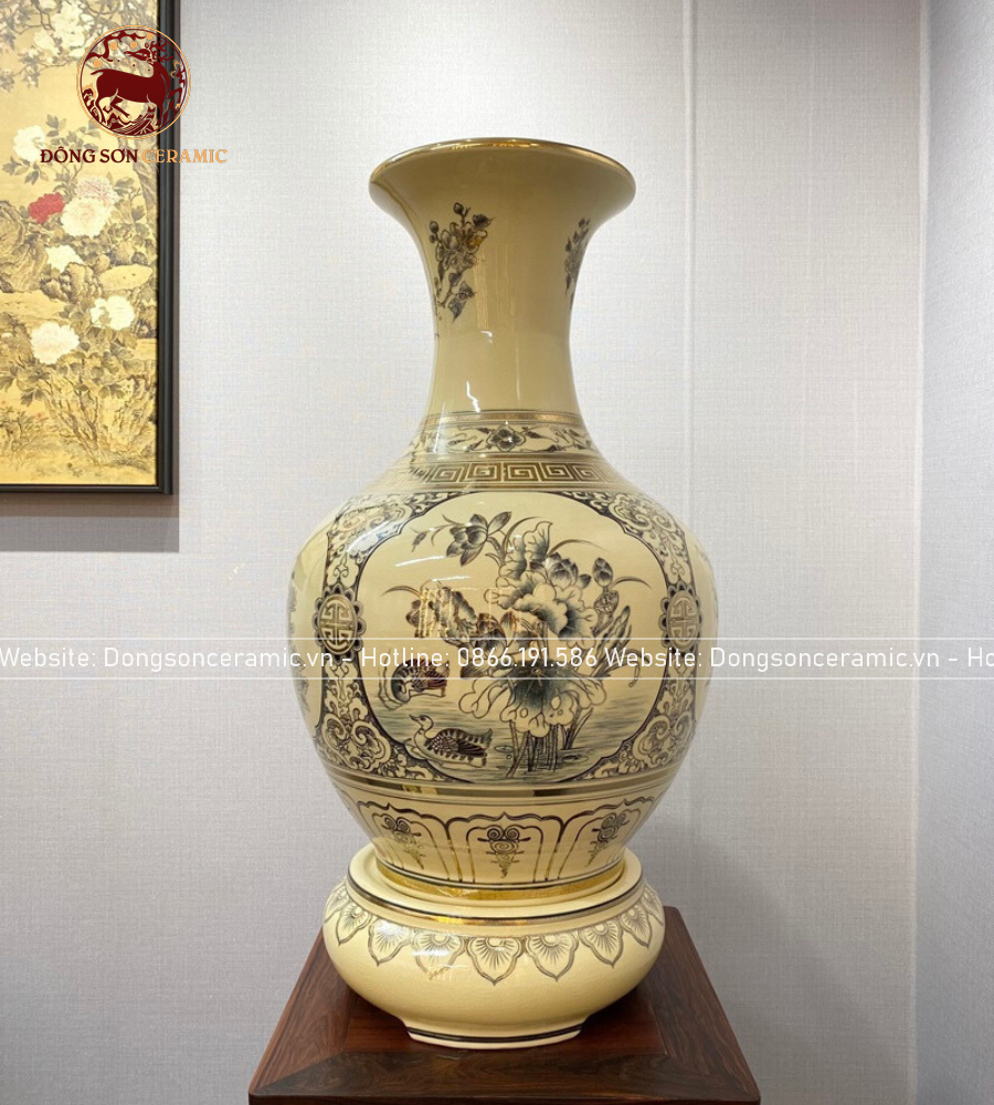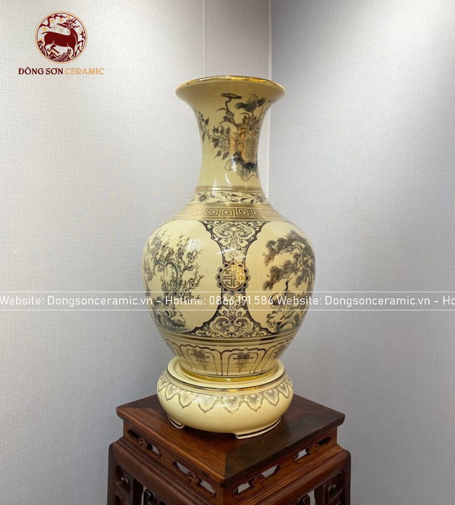 Bình phú quý Chu Đậu tứ cảnh men vàng kem truyền thống vẽ vàng kích thước 65cm