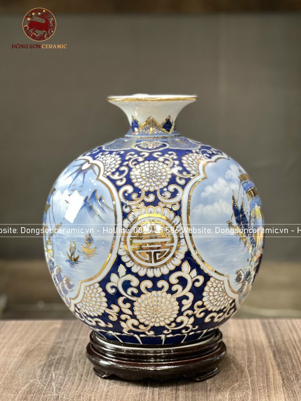 Bình Tài Lộc gốm Bát Tràng thuận buồm xuôi gió men lam vẽ vàng kích thước 30cm