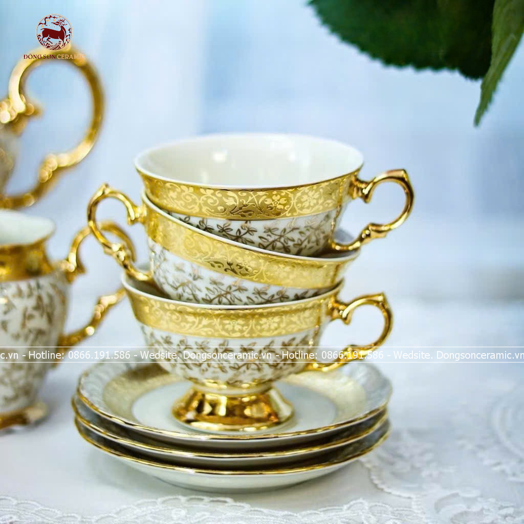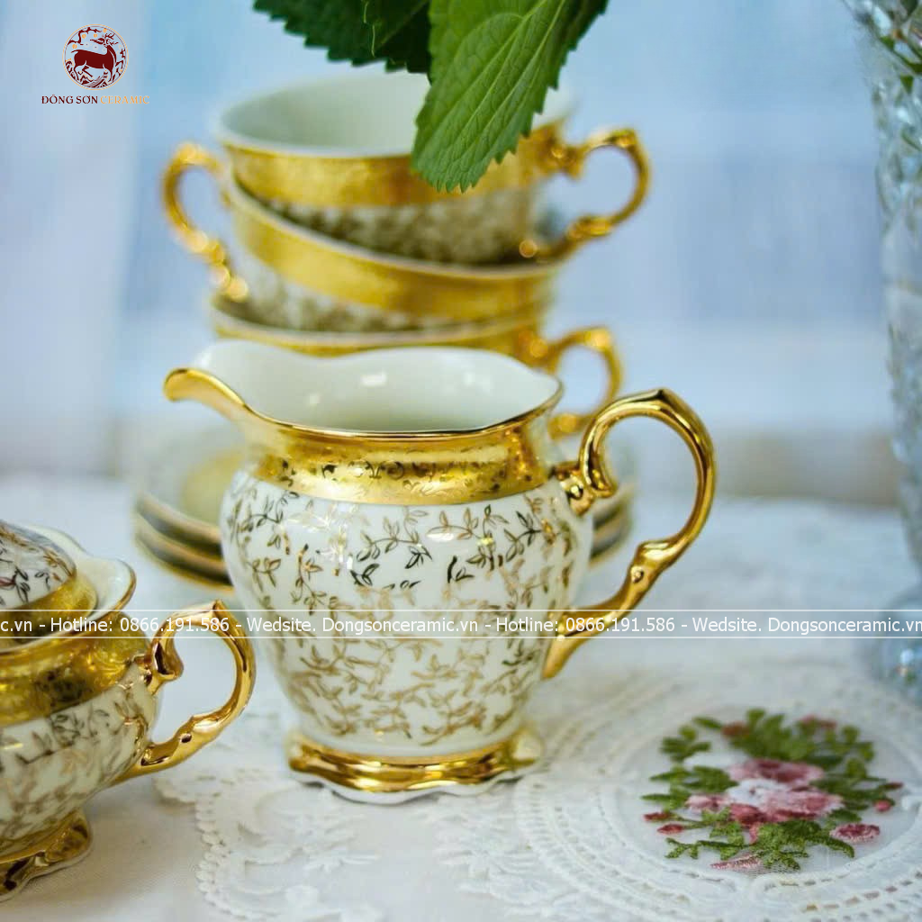 Bộ ấm chén Bát Tràng men trắng ngàn hoa Phú Quý phong cách Châu Âu vẽ vàng 24k đầy đủ 16 vật phẩm cao cấp