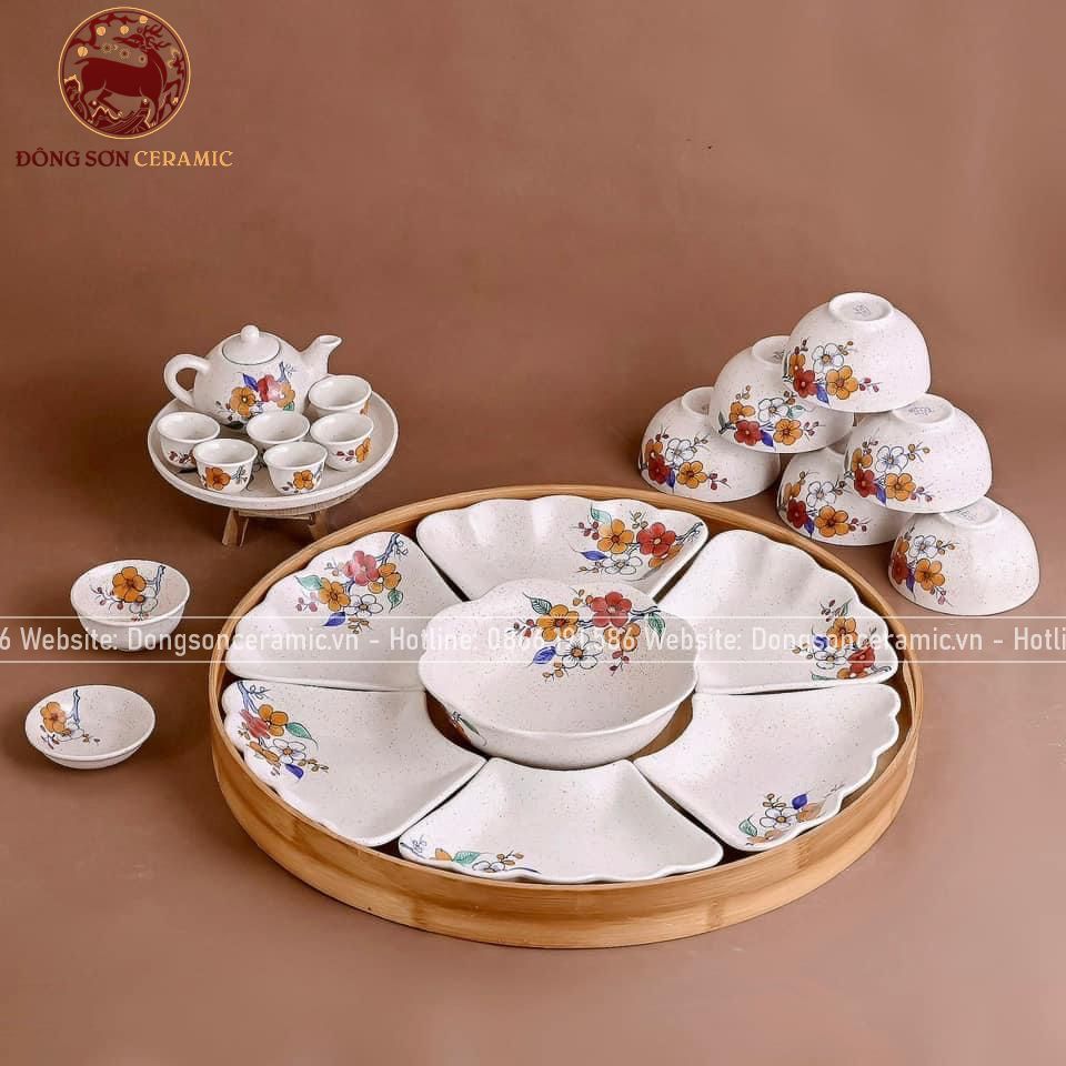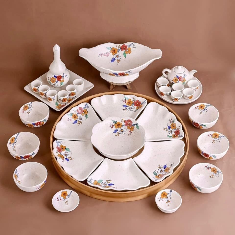 Bộ bát ăn gốm sứ Bát Tràng hoa mặt trời hoa đào men trắng 21 vật phẩm
