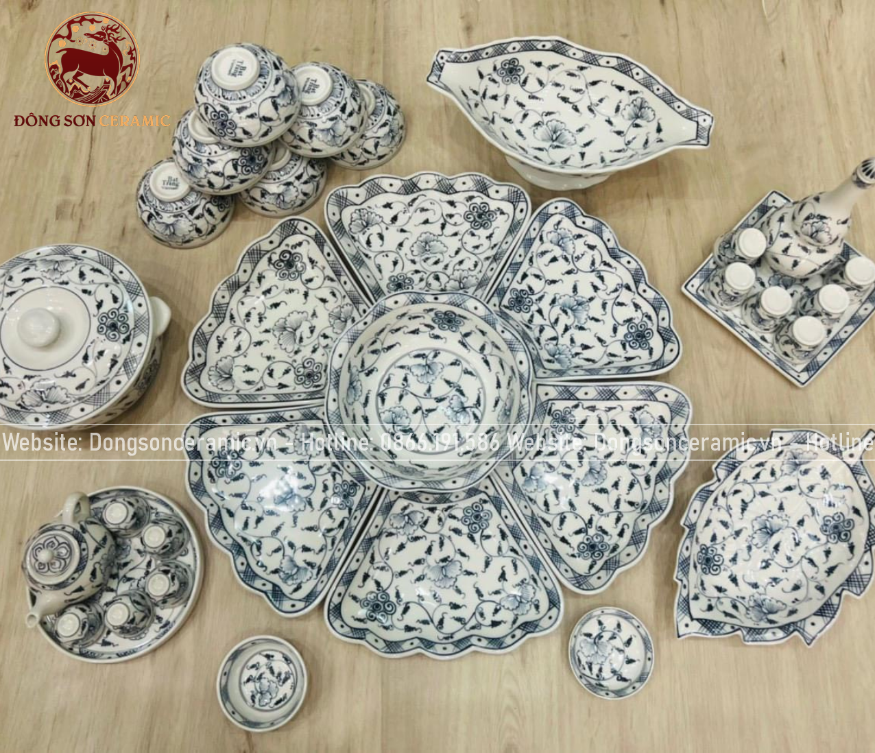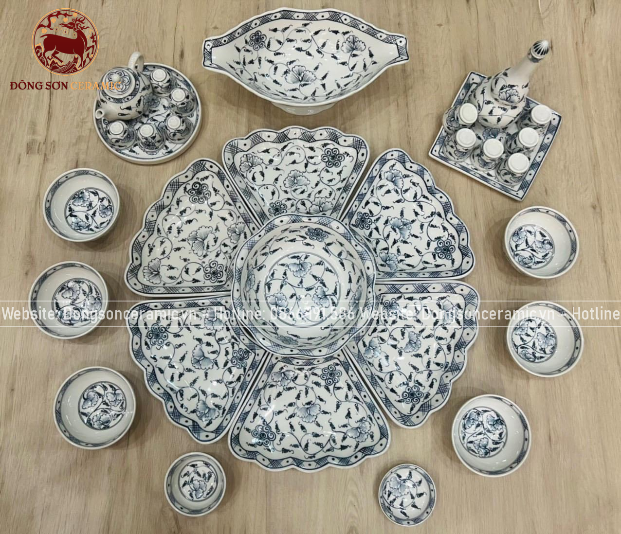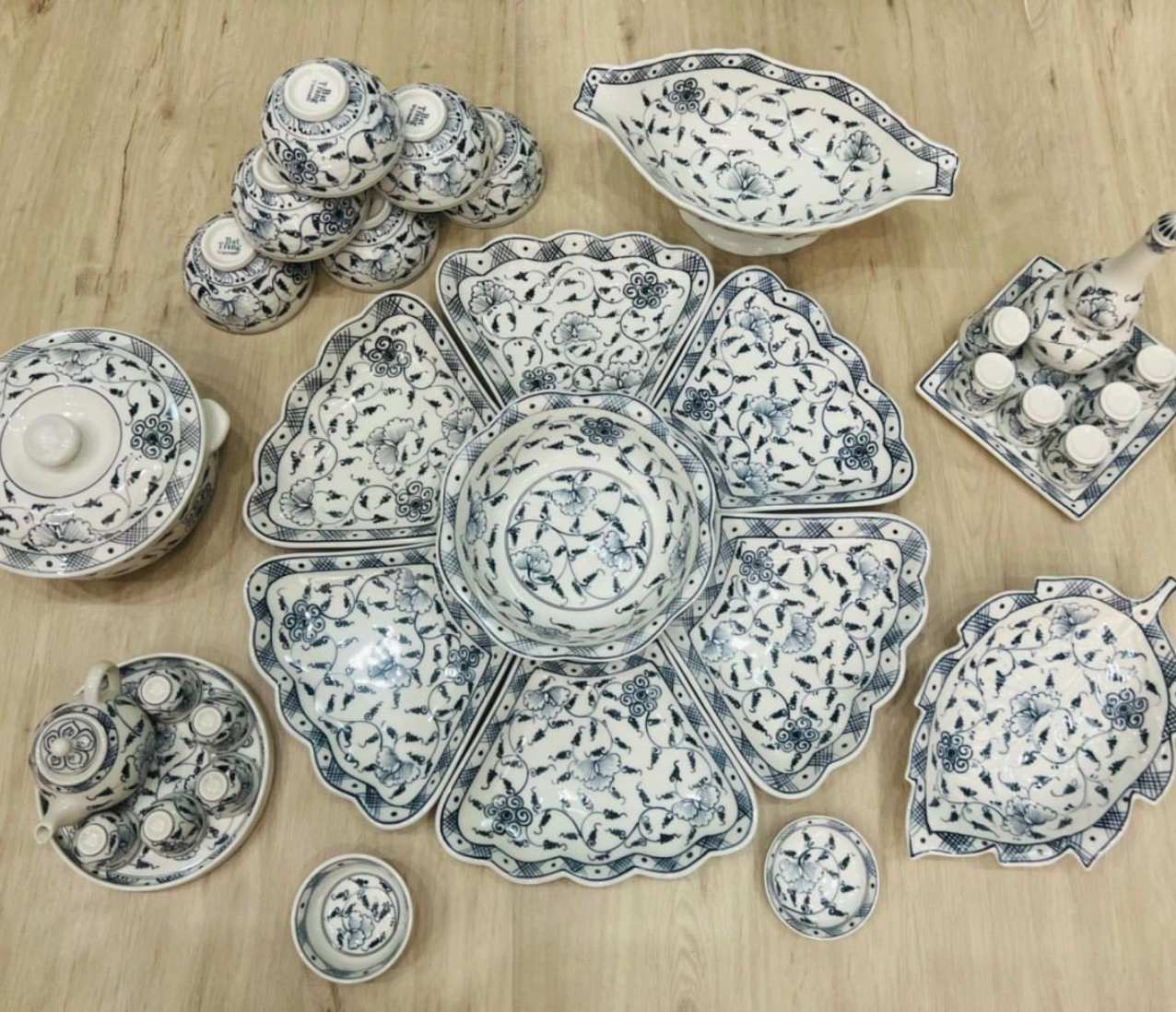 Bộ bát ăn gốm sứ Bát Tràng hoa mặt trời hoa leo men chàm 21 vật phẩm