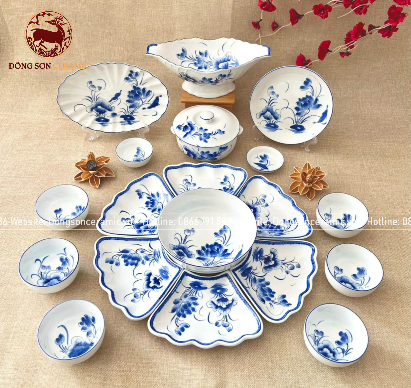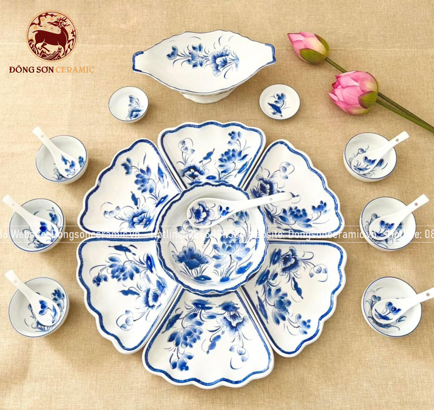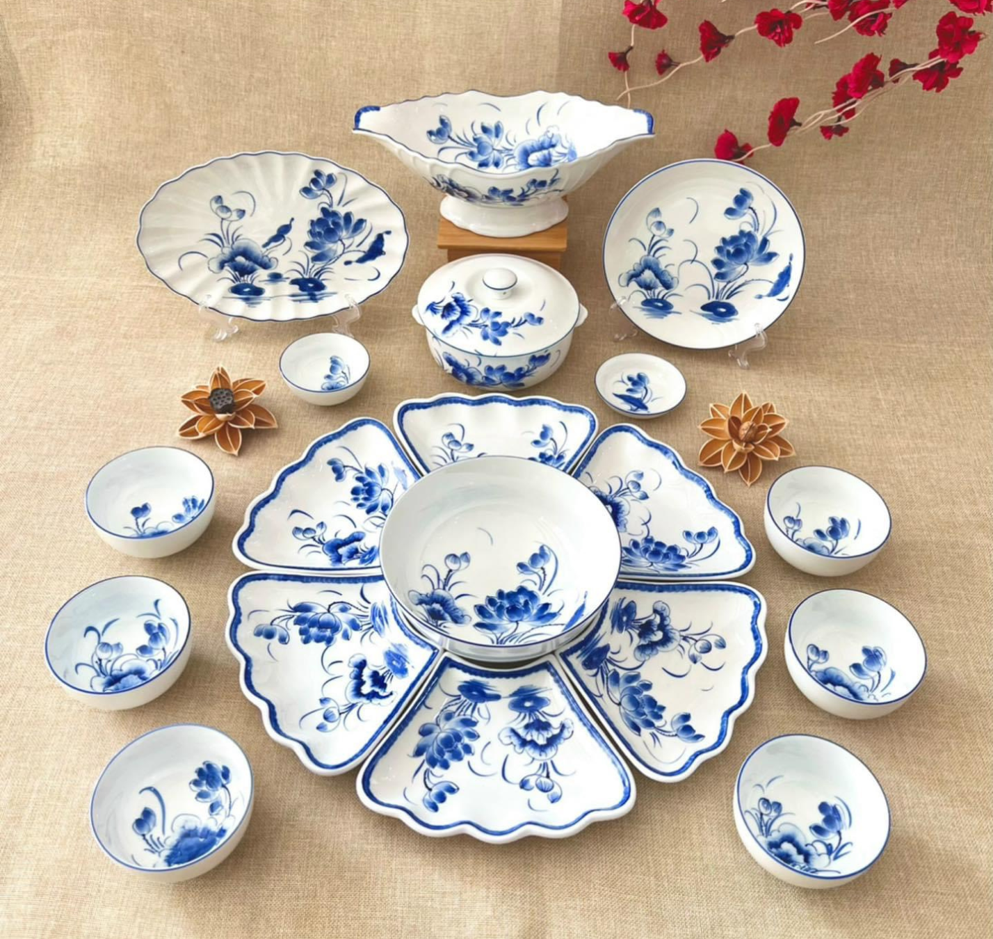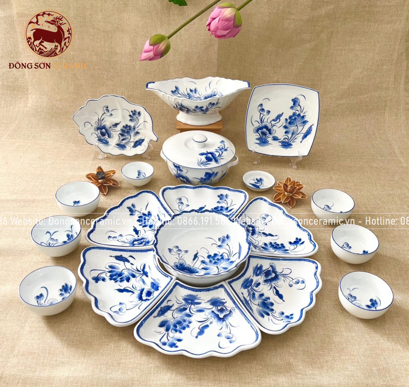 Bộ bát ăn gốm sứ Bát Tràng hoa mặt trời hoa sen men lam 19 vật phẩm