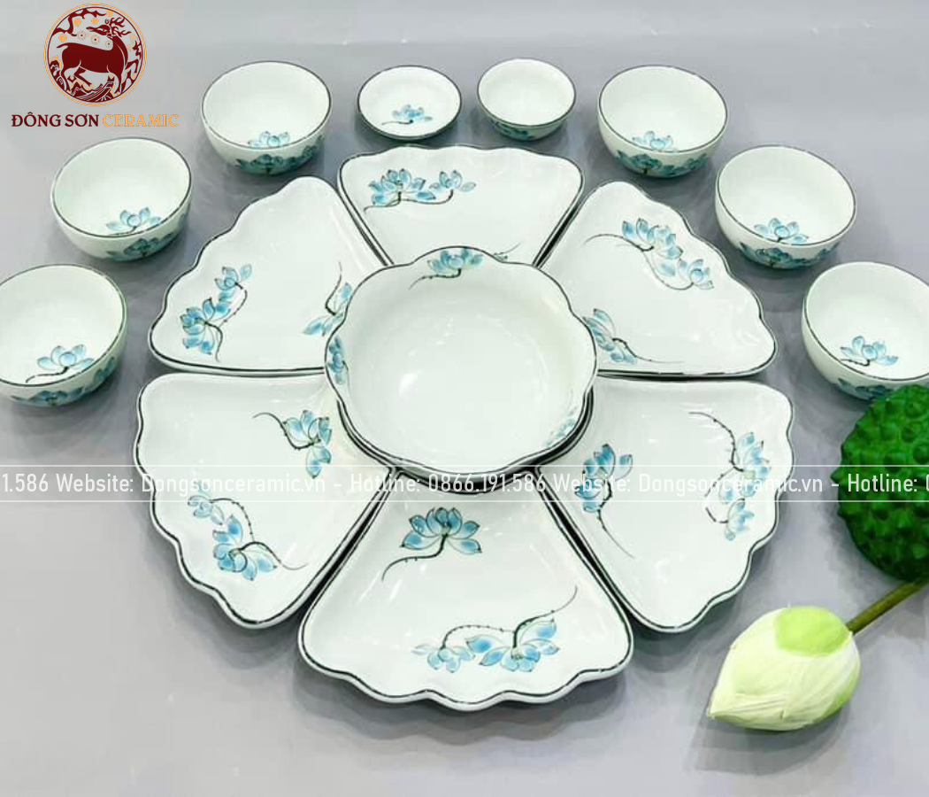 Bộ bát ăn gốm sứ Bát Tràng hoa mặt trời hoa sen men ngọc 19 vật phẩm
