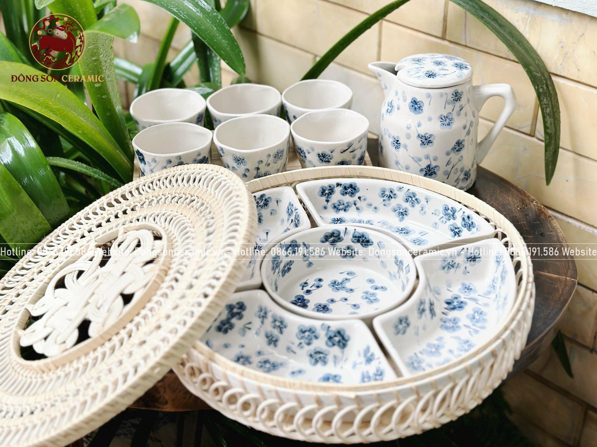 Bộ bát ăn gốm sứ Bát Tràng hoa mặt trời men sứ trắng chấm bi 15 vật phẩm