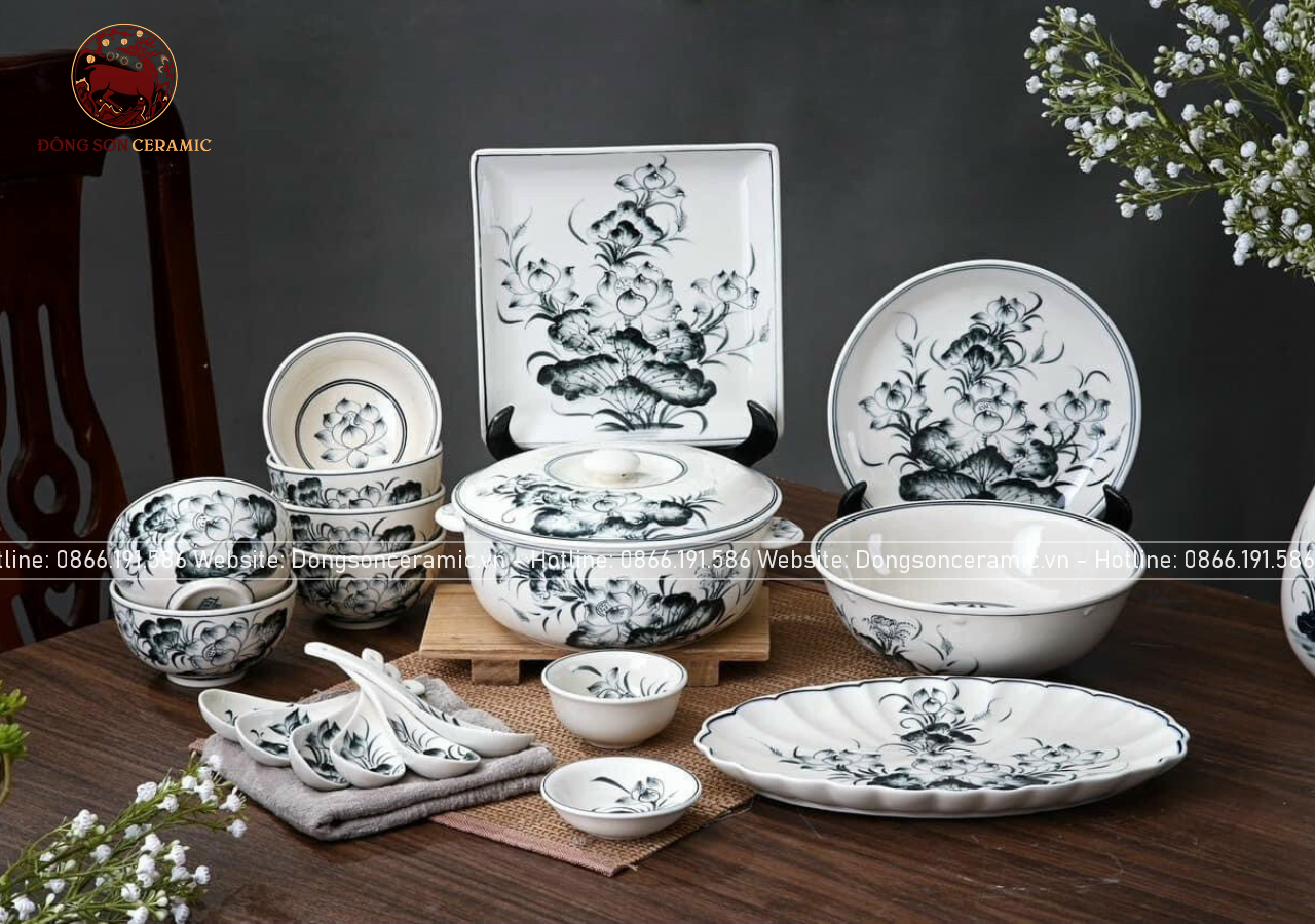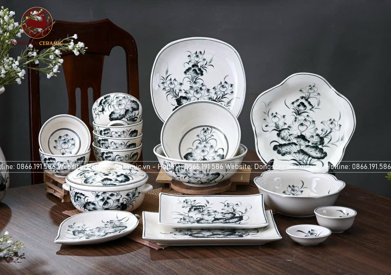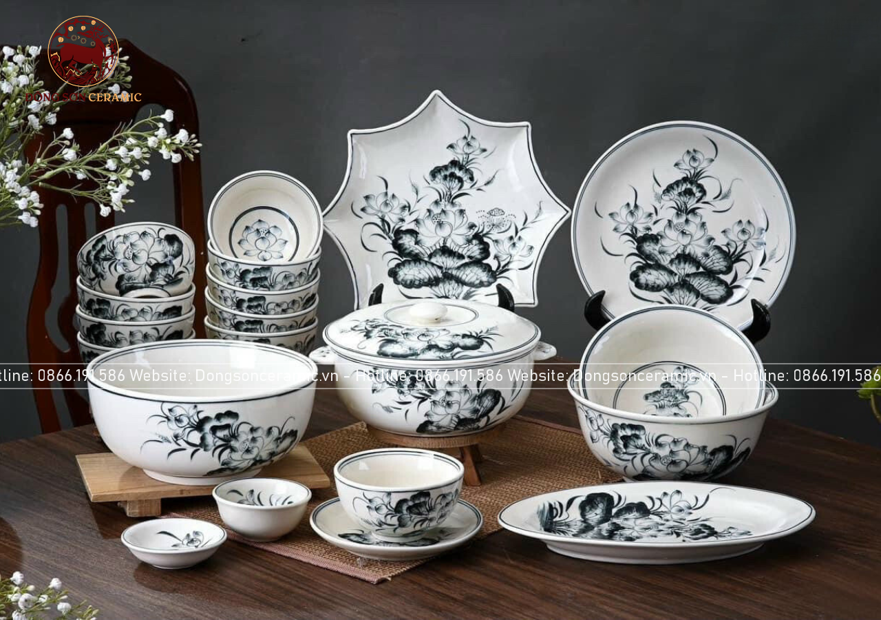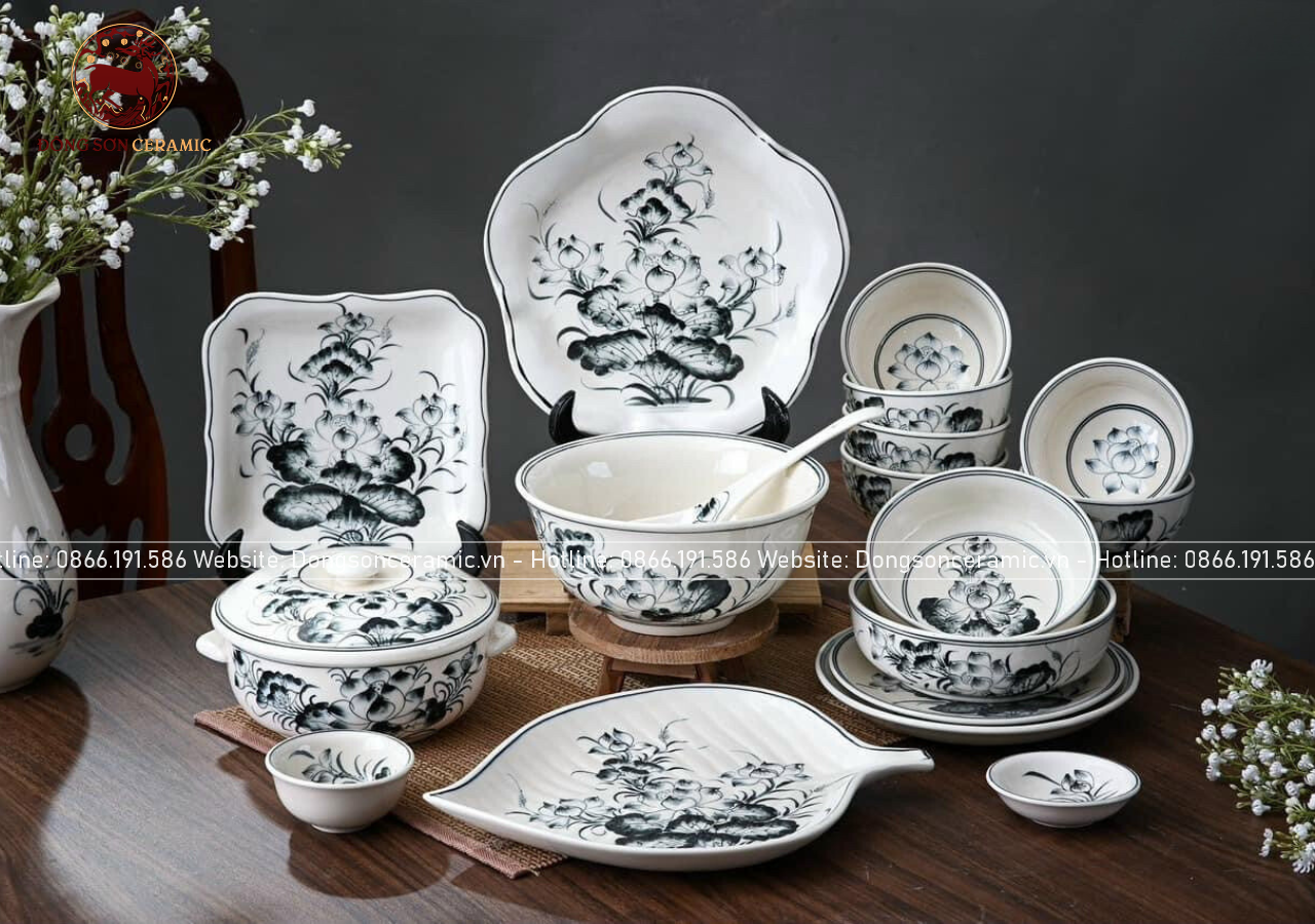 Bộ bát ăn gốm sứ Bát Tràng họa tiết hoa sen men sứ chàm 20 vật phẩm