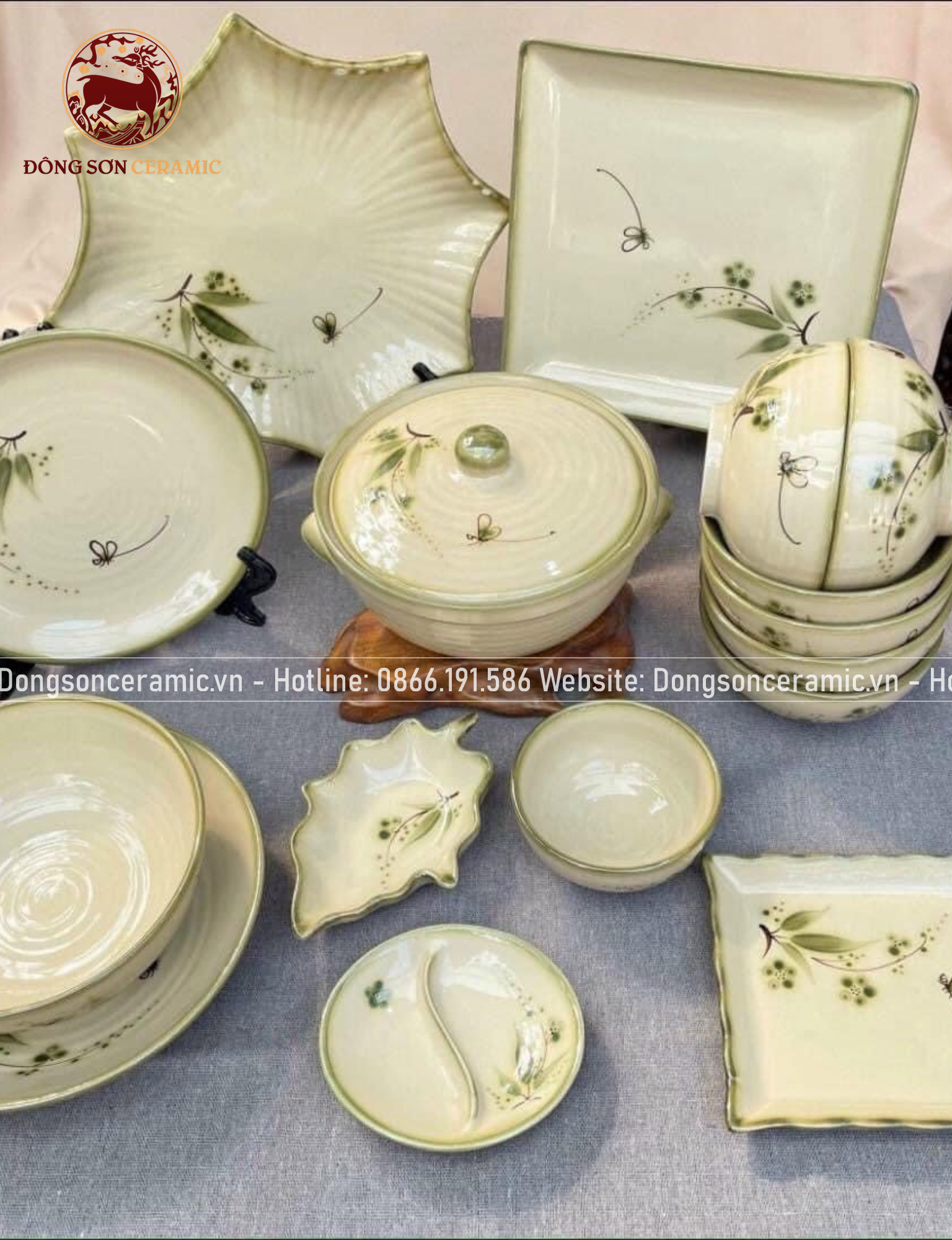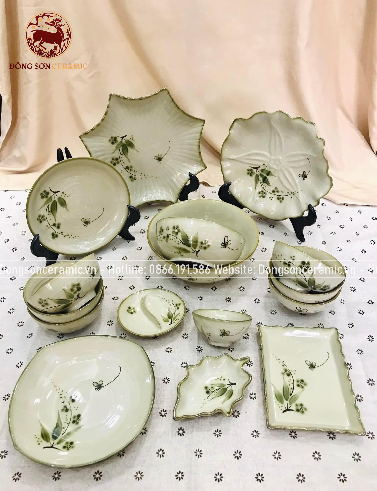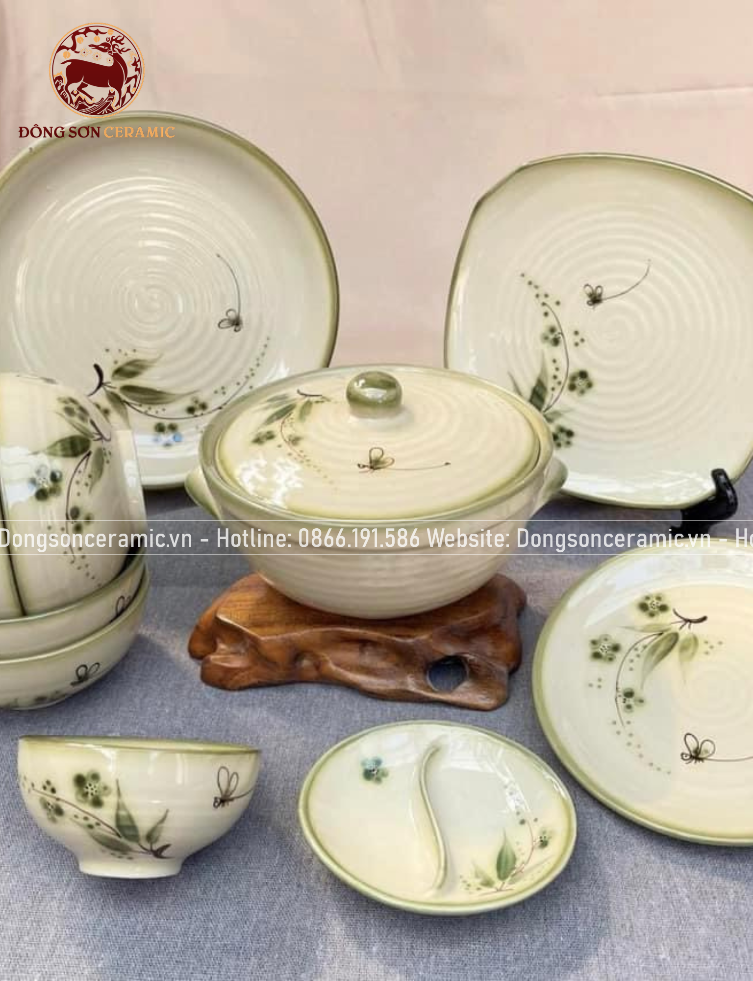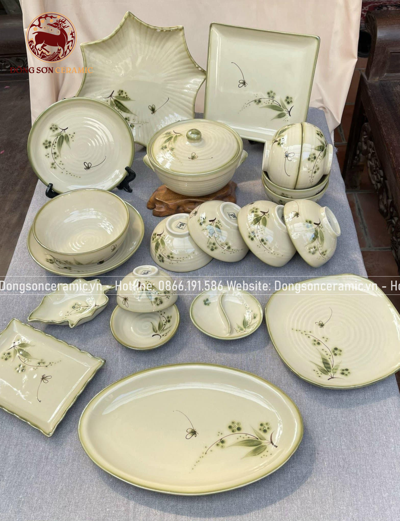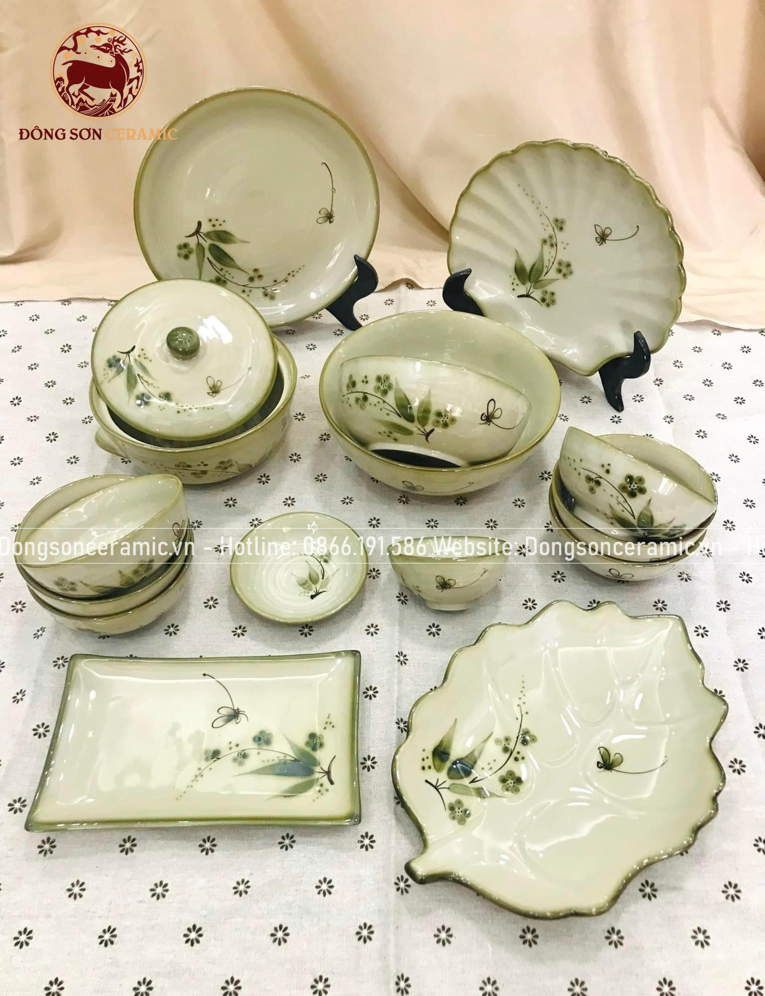 Bộ bát ăn gốm sứ Bát Tràng men ngà ngọc họa tiết chuồn tre 16 vật phẩm