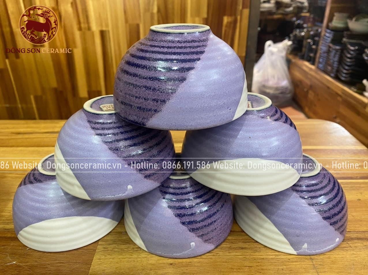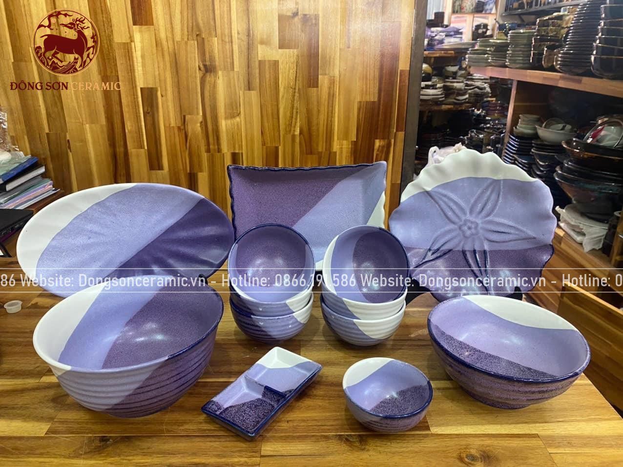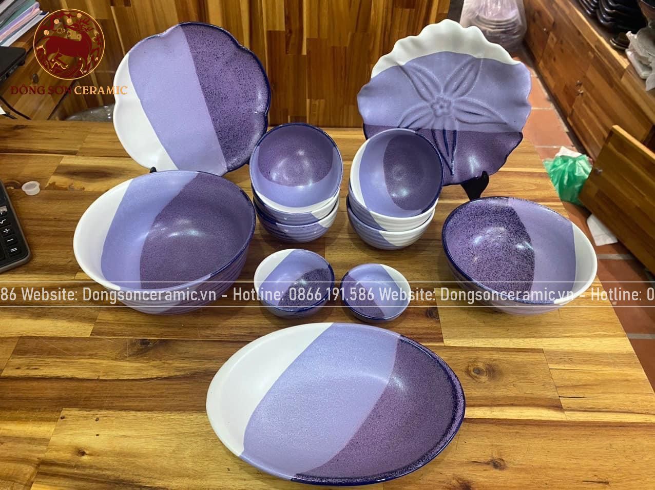 Bộ bát ăn gốm sứ Bát Tràng men sứ trắn tím 21 vật phẩm