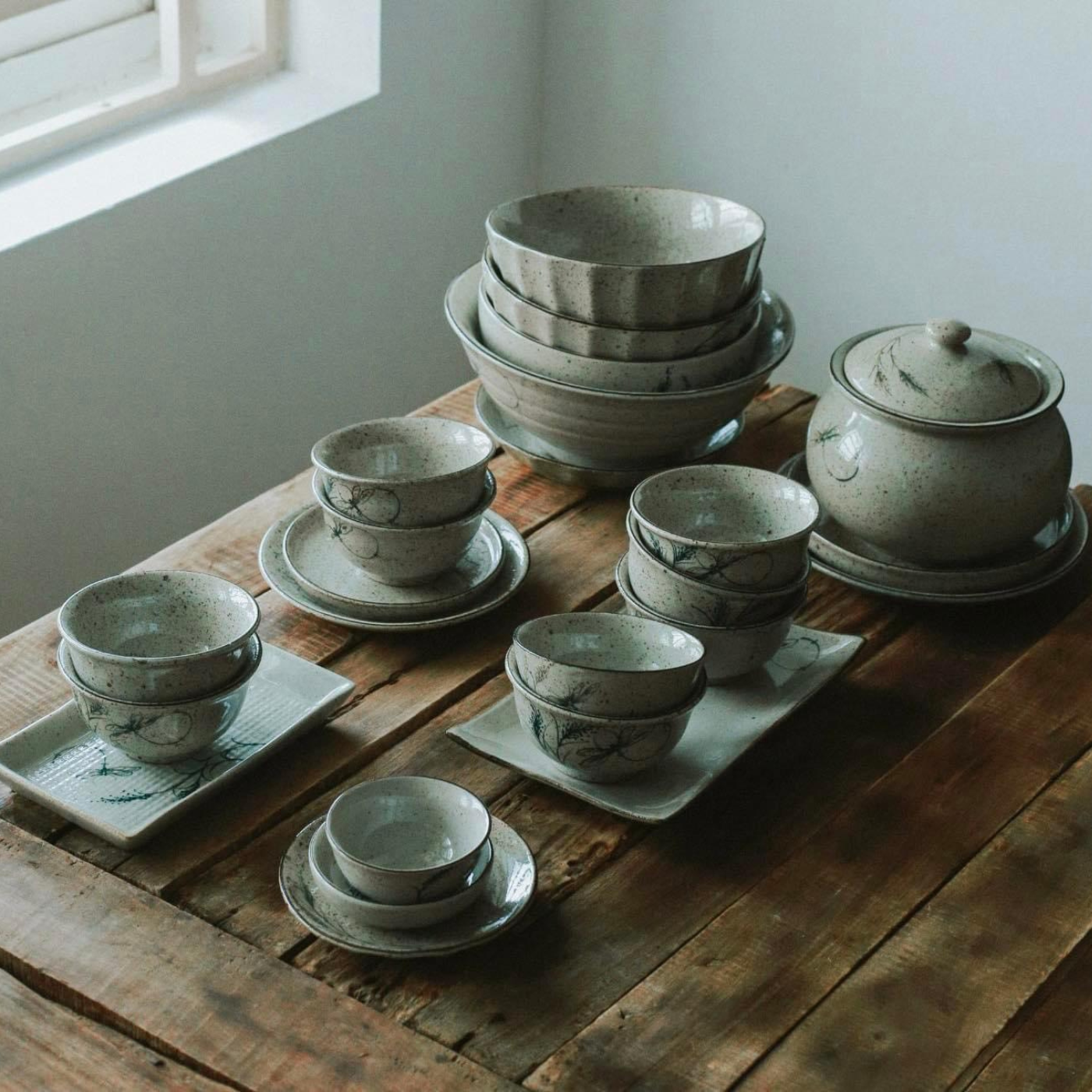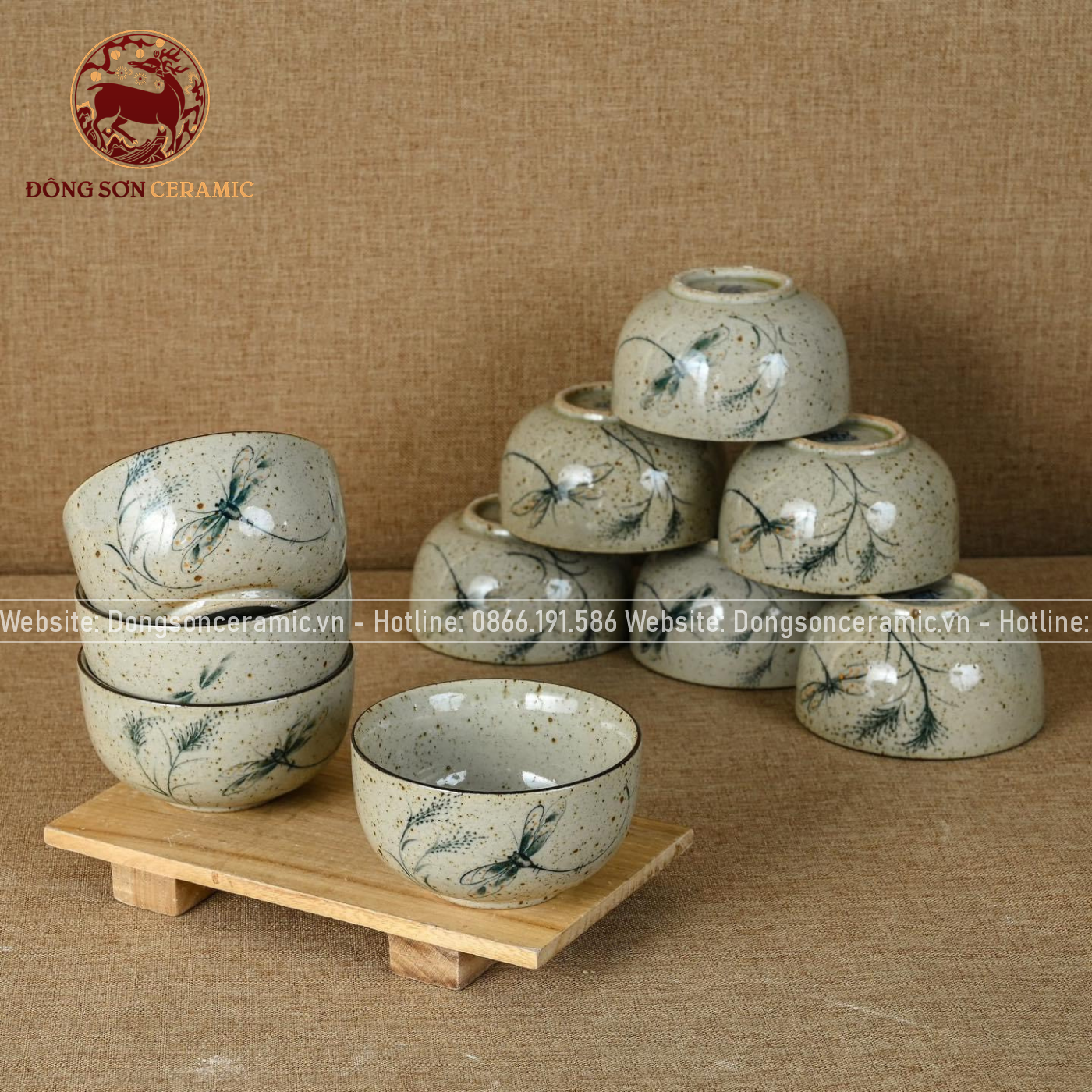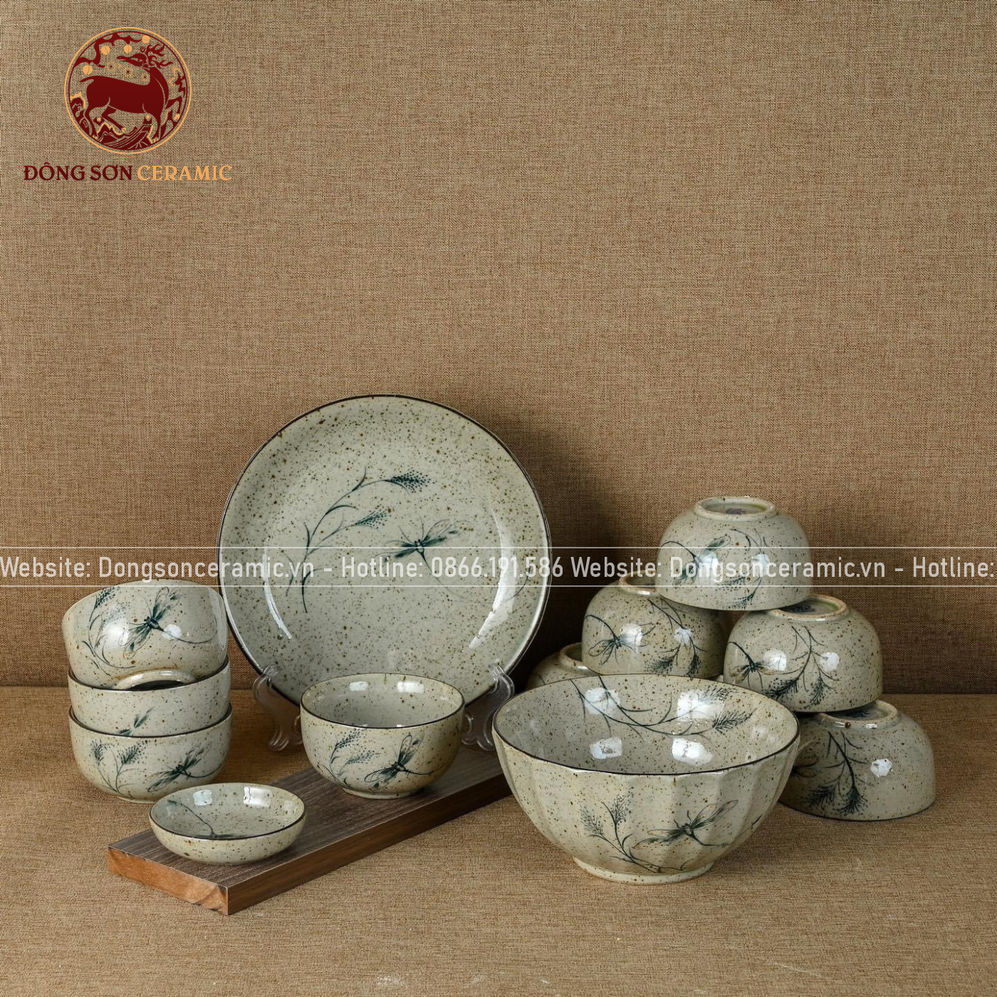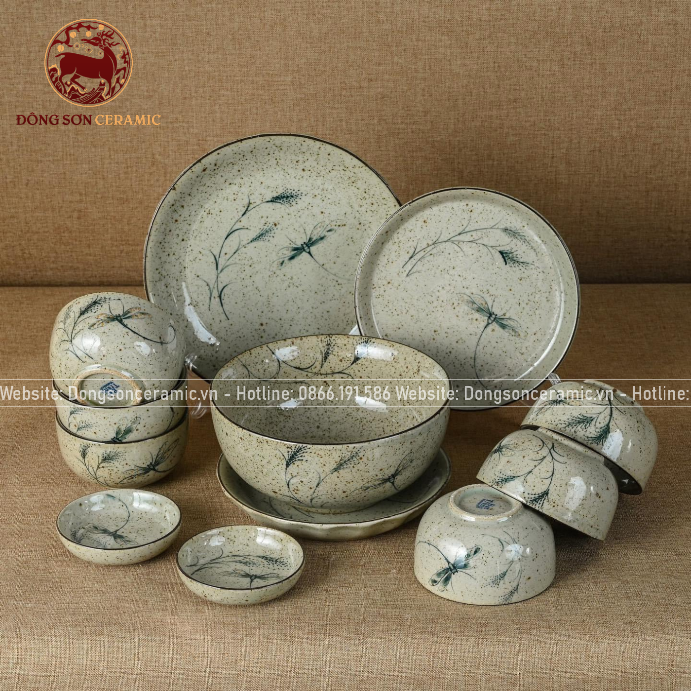 Bộ bát ăn gốm sứ Bát Tràng men tiêu chuồn tre 21 vật phẩm