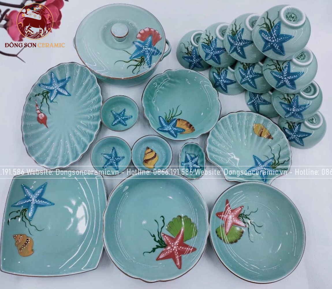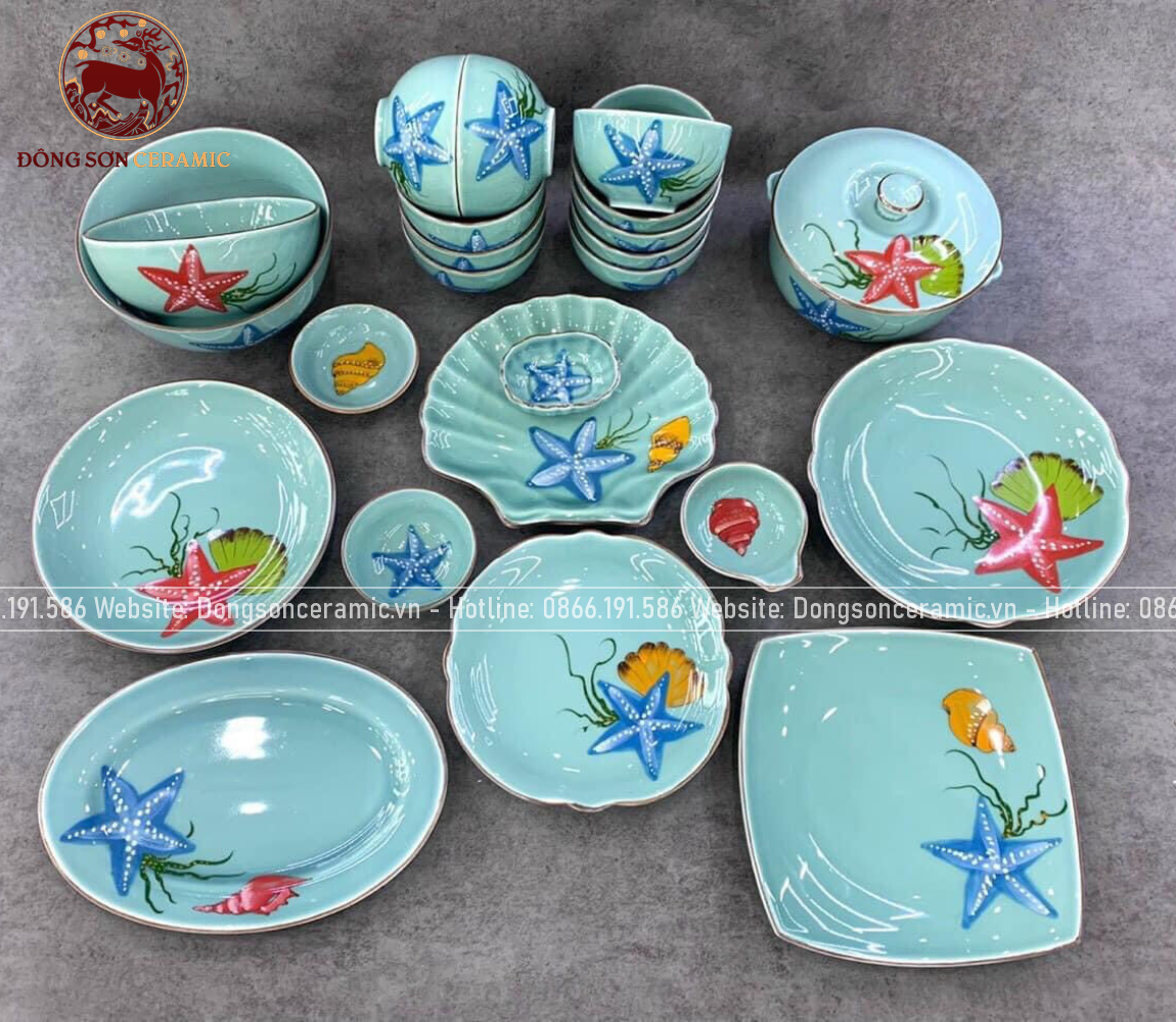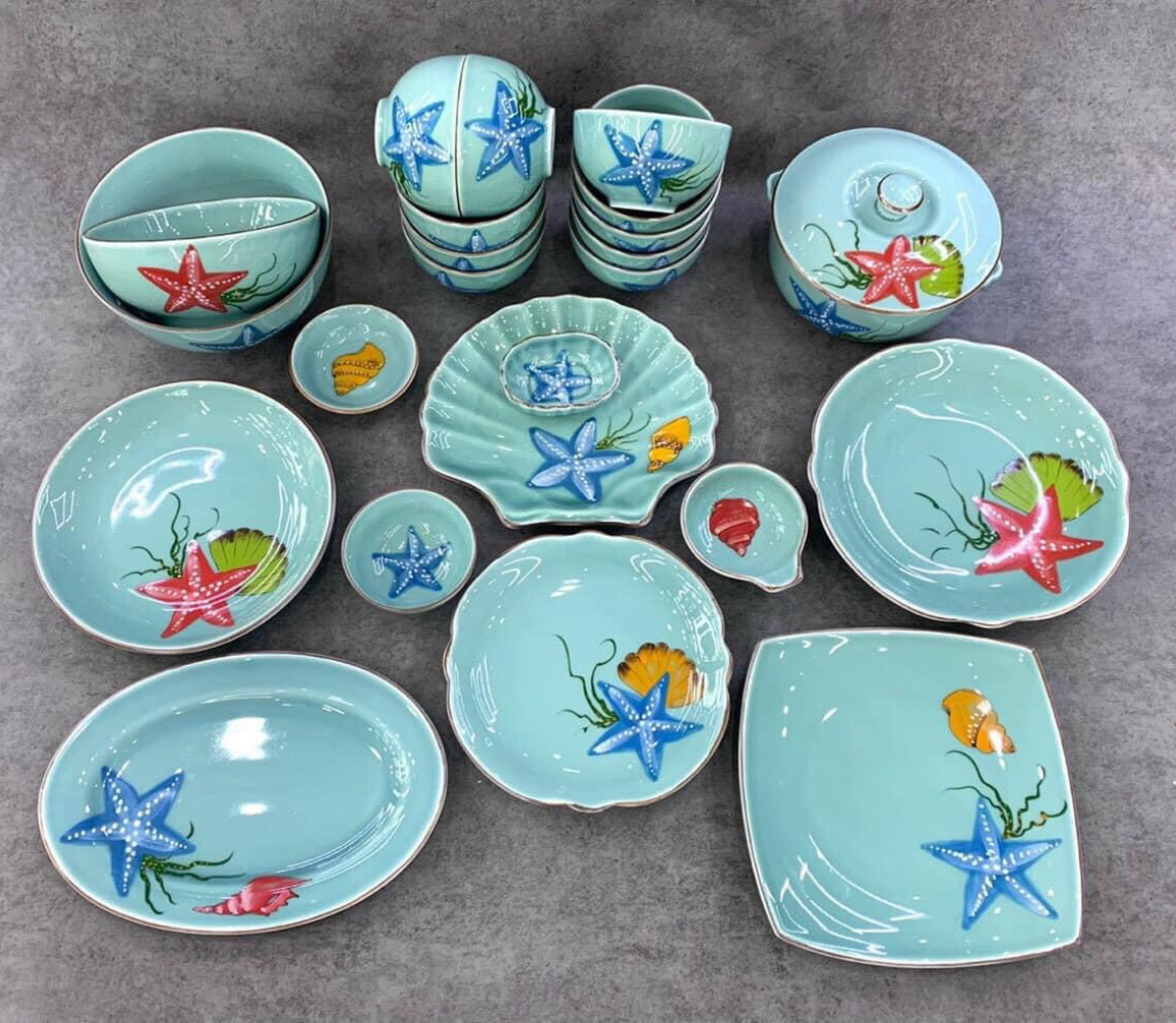 Bộ bát ăn gốm sứ Bát Tràng men xanh biển họa tiết sao biển 23 vật phẩm
