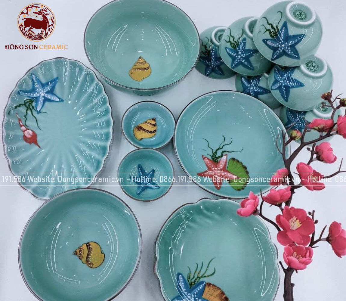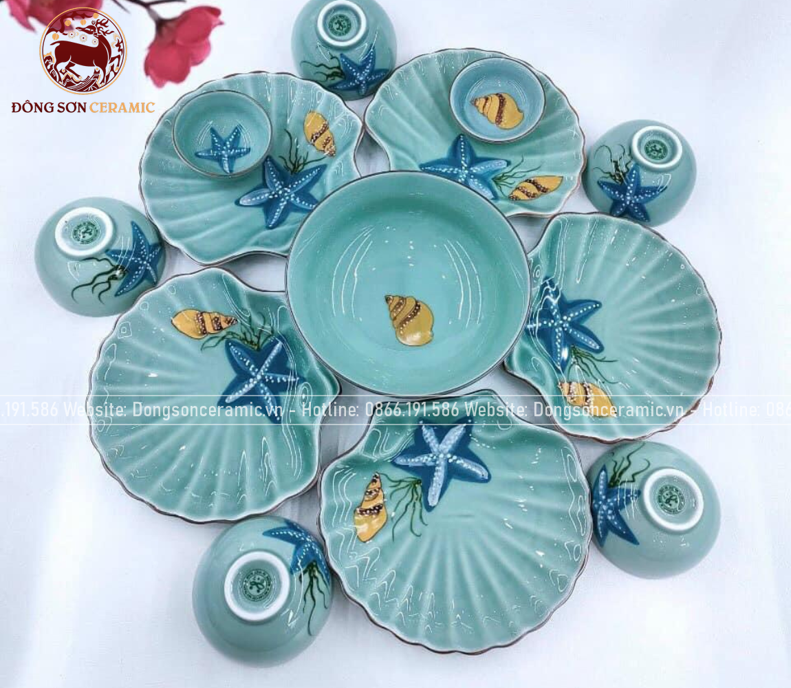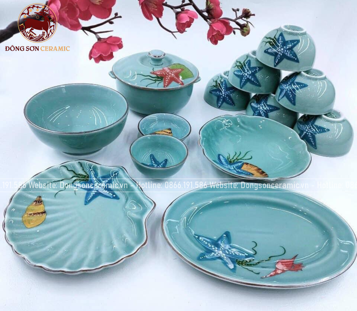 Bộ bát ăn gốm sứ Bát Tràng men xanh biển họa tiết sao biển 23 vật phẩm