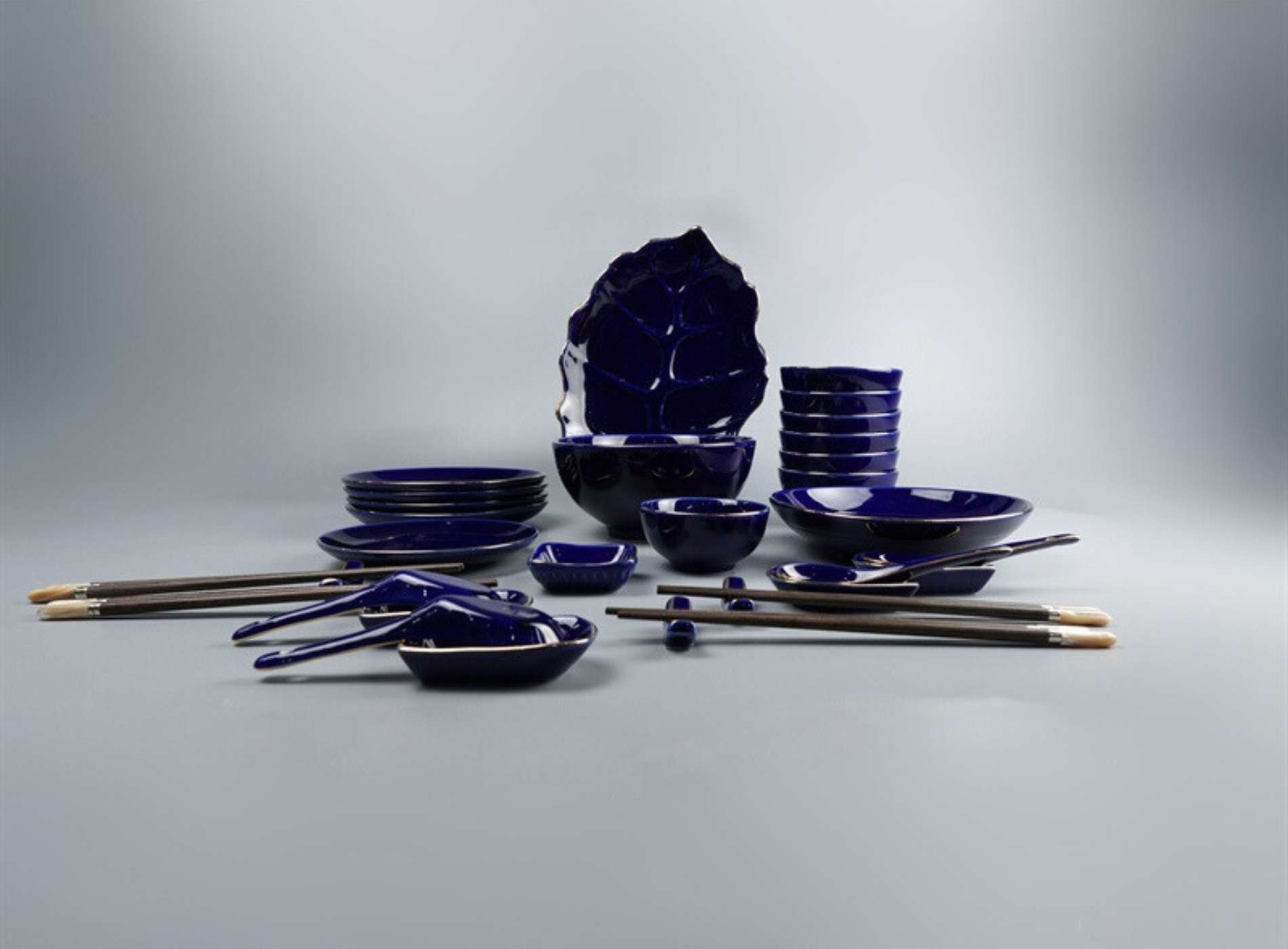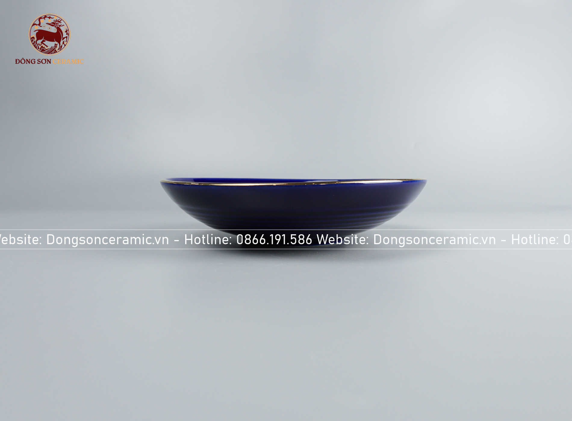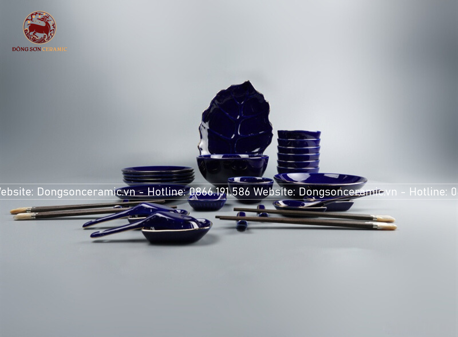 Bộ bát ăn gốm sứ Bát Tràng men xanh coban viền vàng 28 vật phẩm