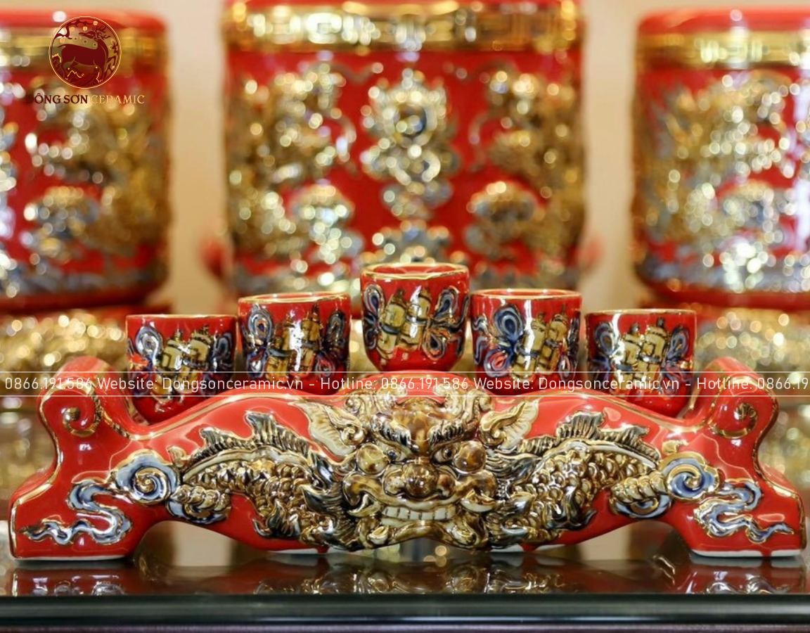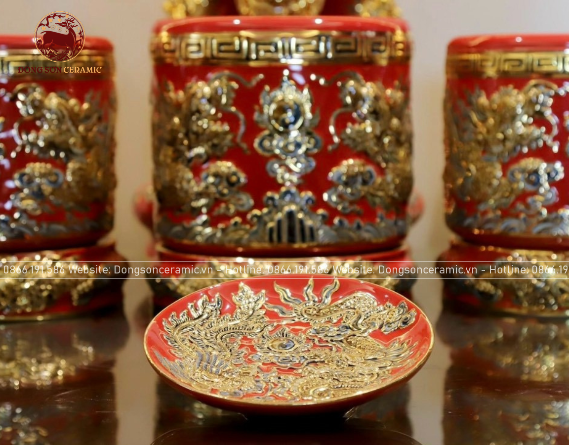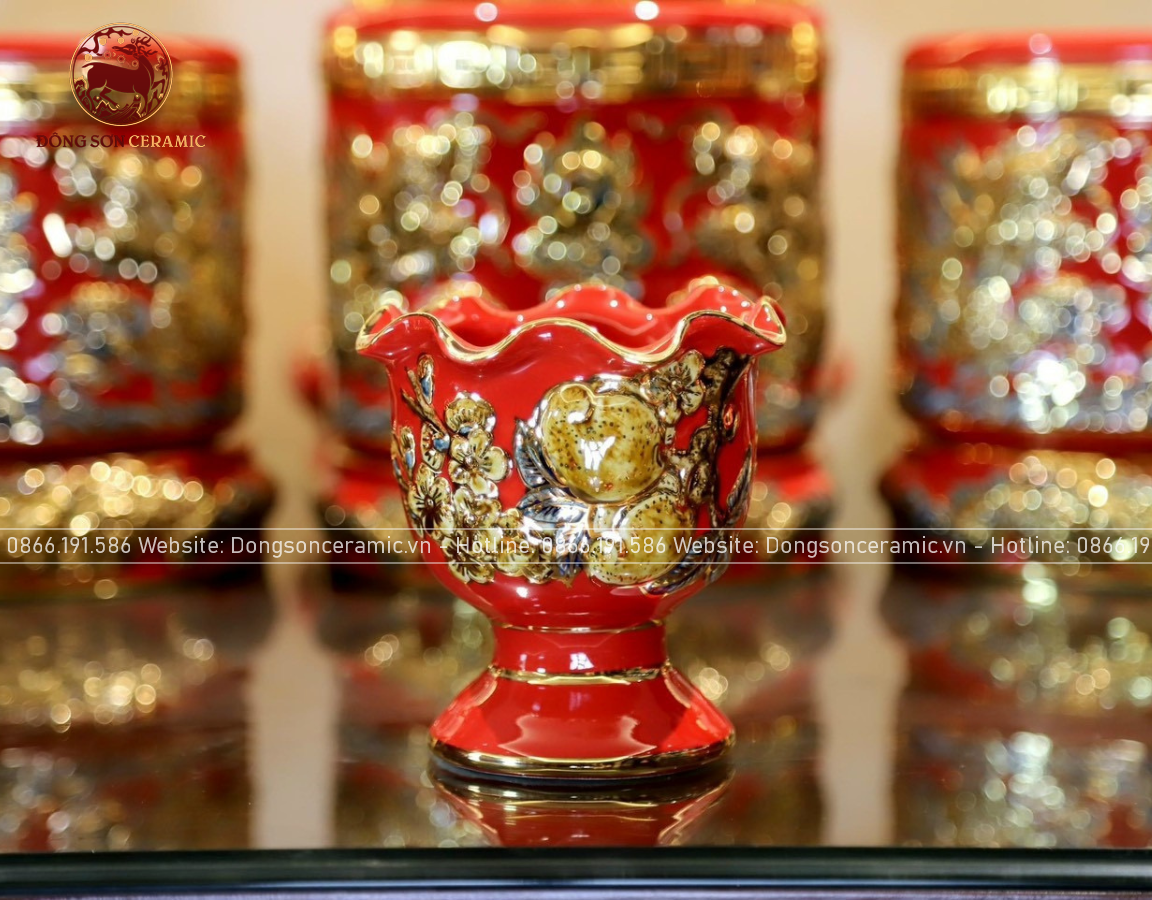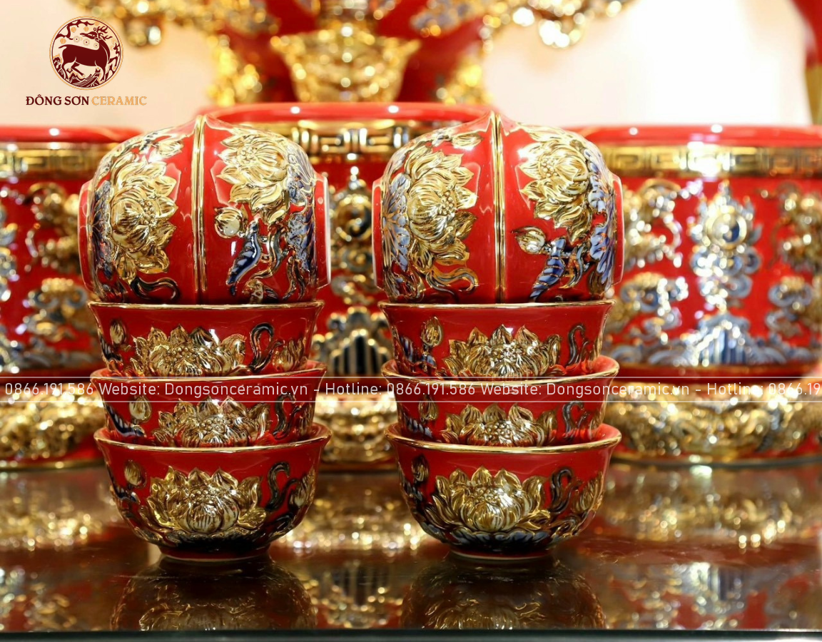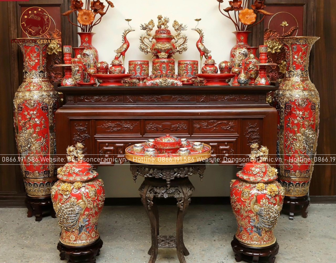 Bộ Đồ Thờ Bát Tràng đầy đủ dâng ban gia tiên men sứ đỏ đắp nổi vẽ vàng 42 vật phẩm | Bộ Thờ Cúng Gia Tiên Bát Tràng