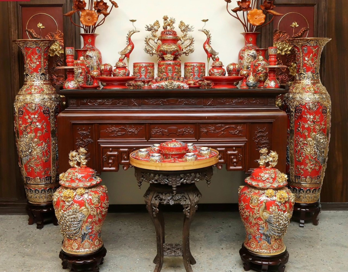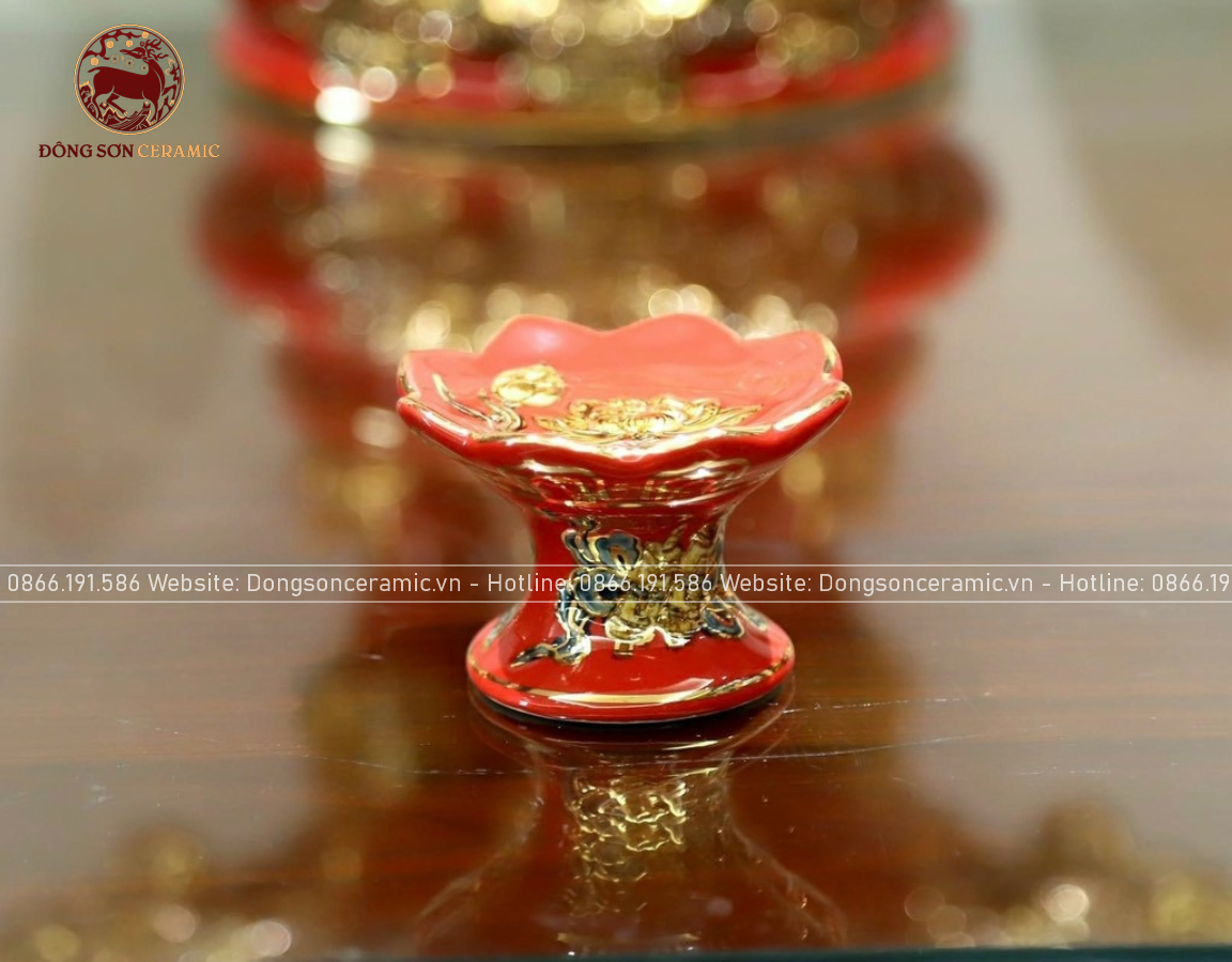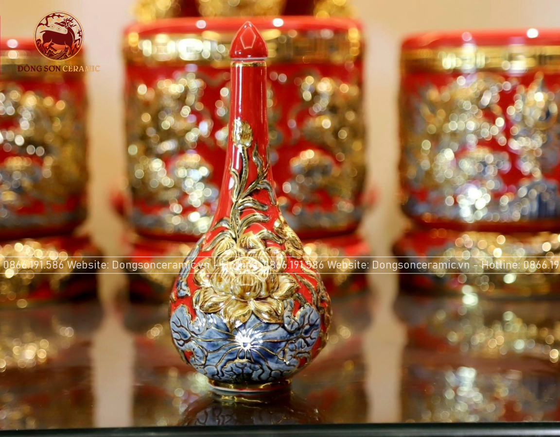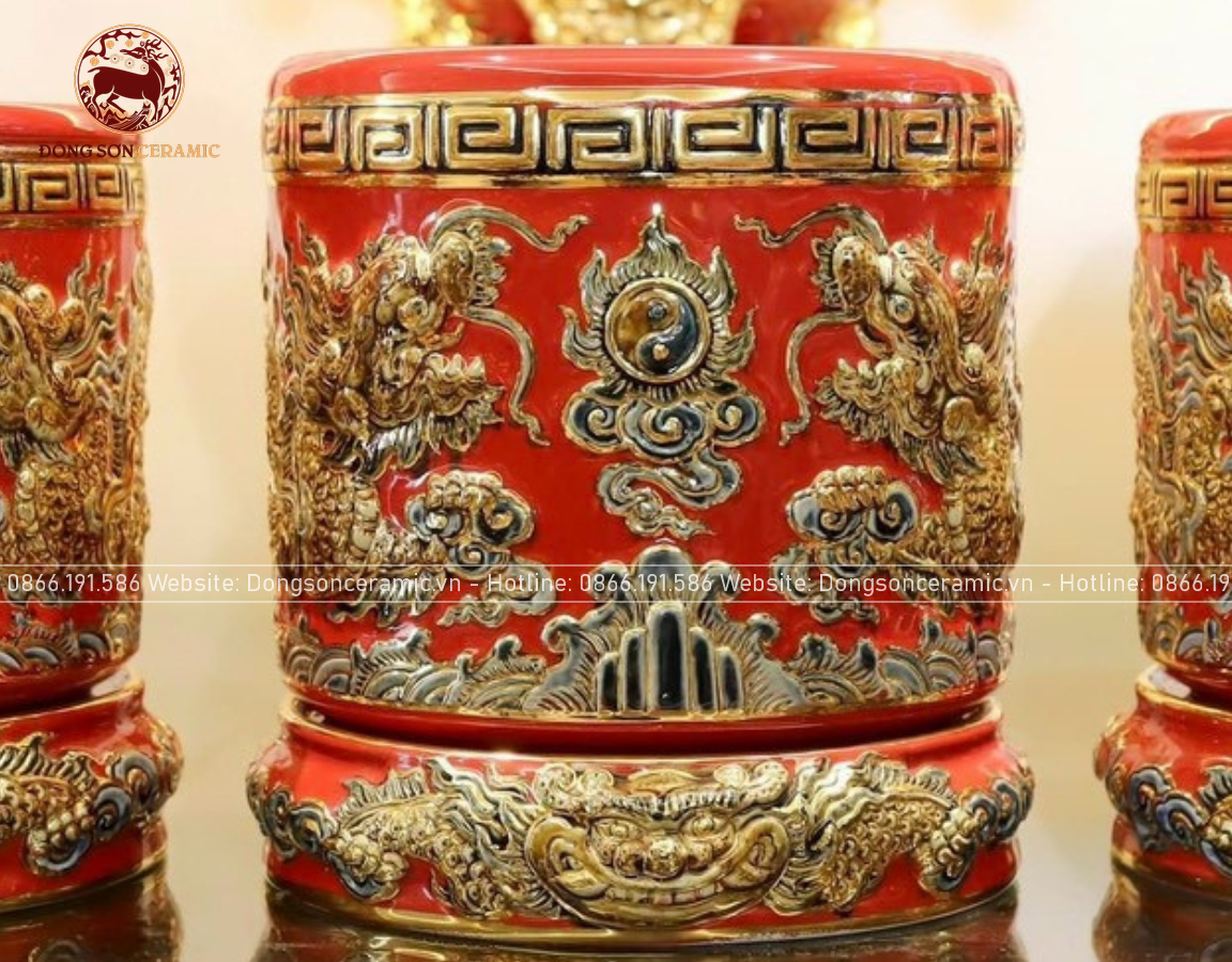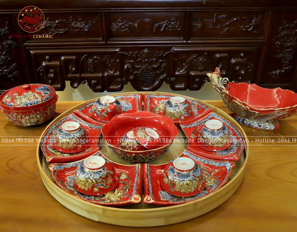 Bộ Đồ Thờ Bát Tràng đầy đủ dâng ban gia tiên men sứ đỏ đắp nổi vẽ vàng 42 vật phẩm | Bộ Thờ Cúng Gia Tiên Bát Tràng