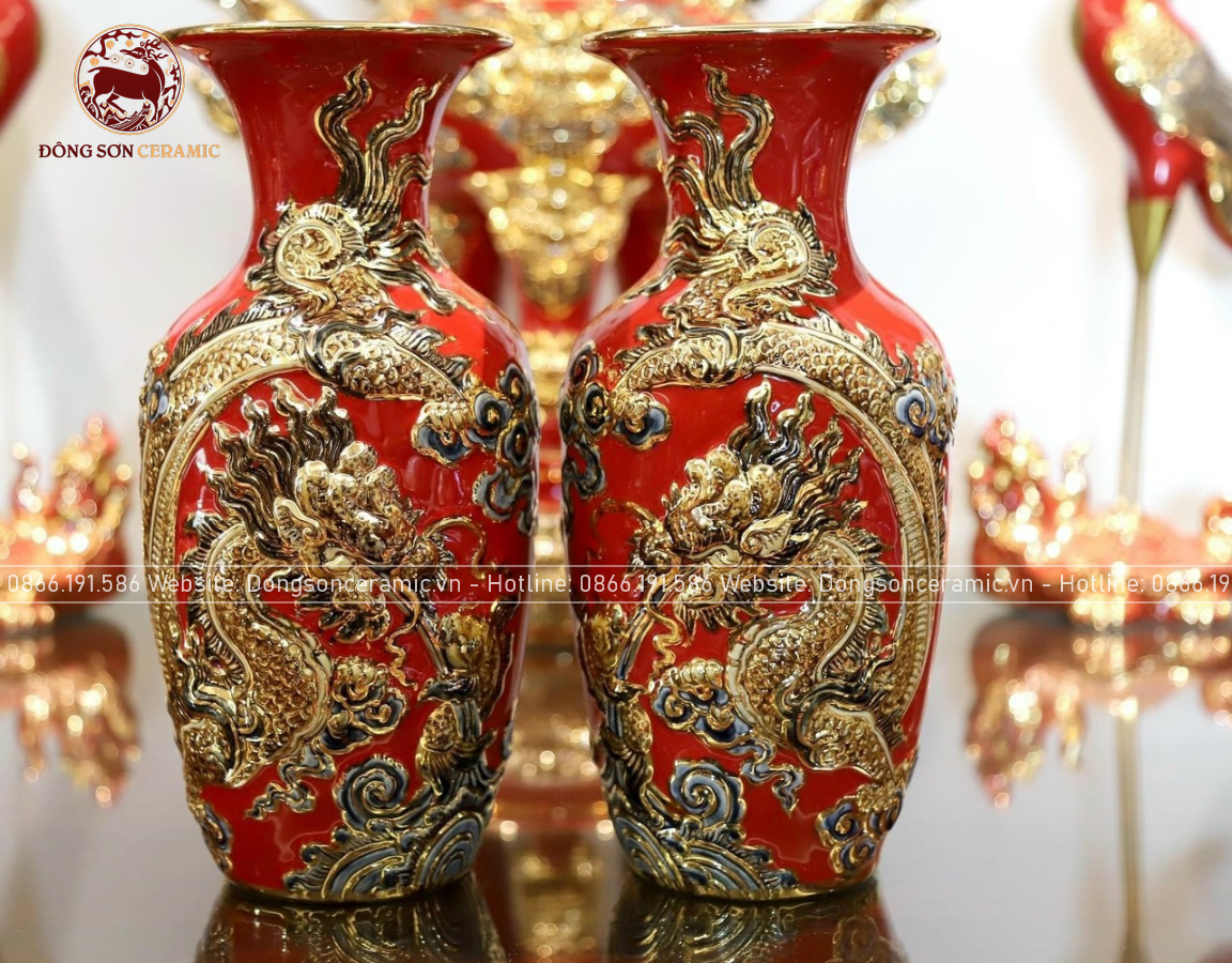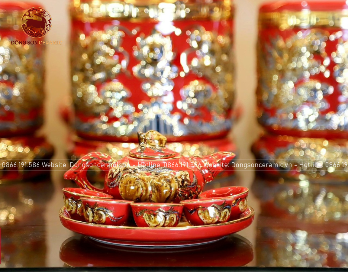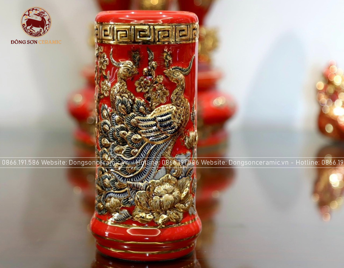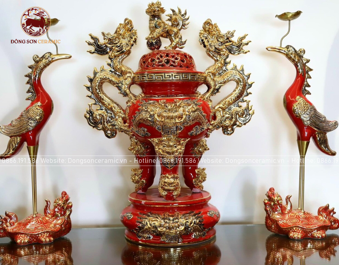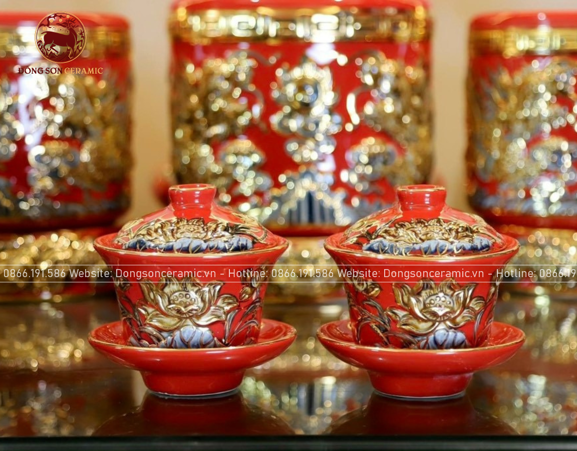 Bộ Đồ Thờ Bát Tràng đầy đủ dâng ban gia tiên men sứ đỏ đắp nổi vẽ vàng 42 vật phẩm | Bộ Thờ Cúng Gia Tiên Bát Tràng