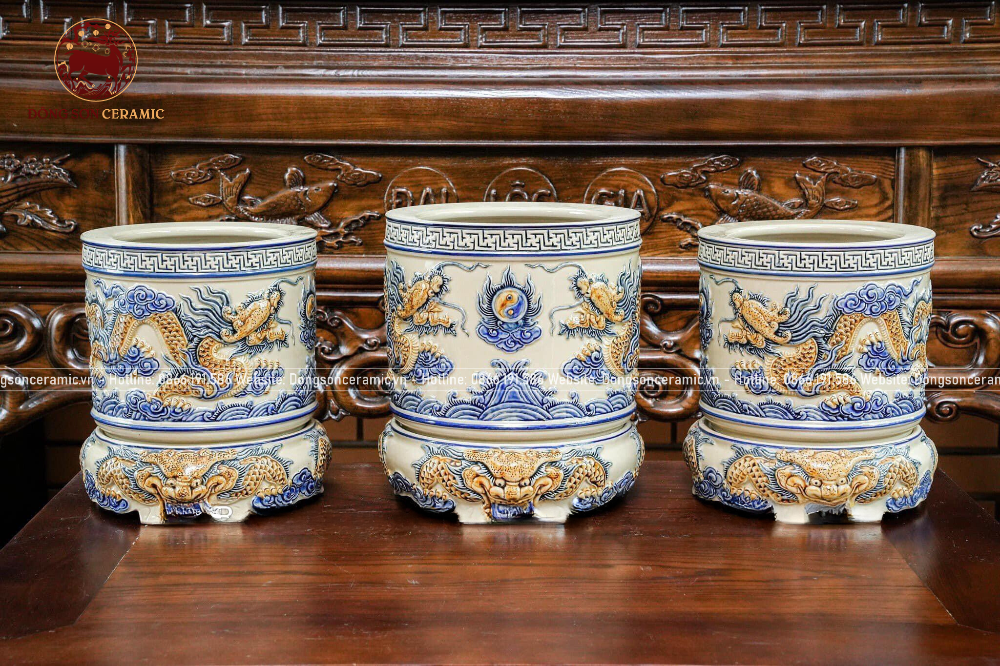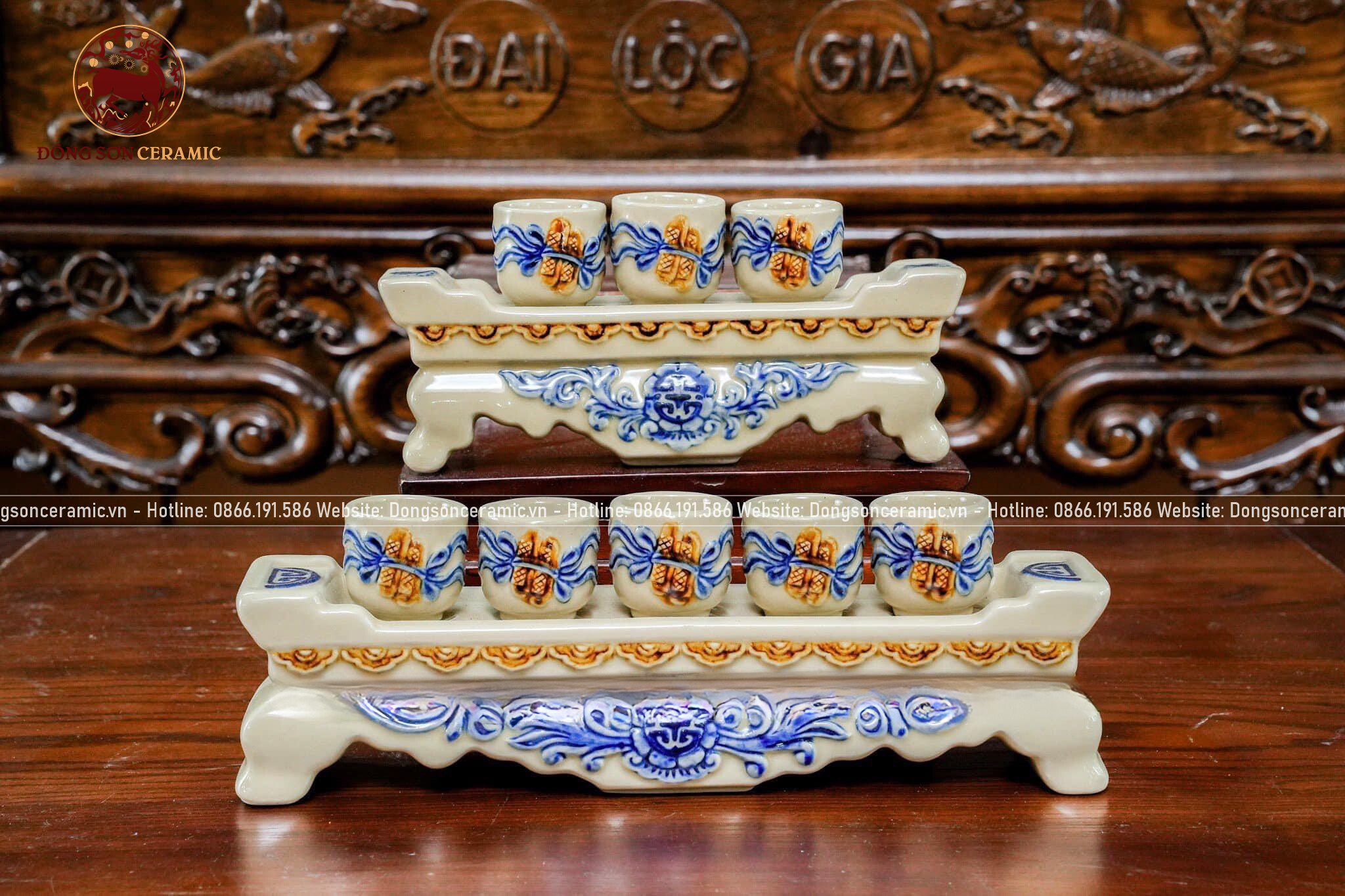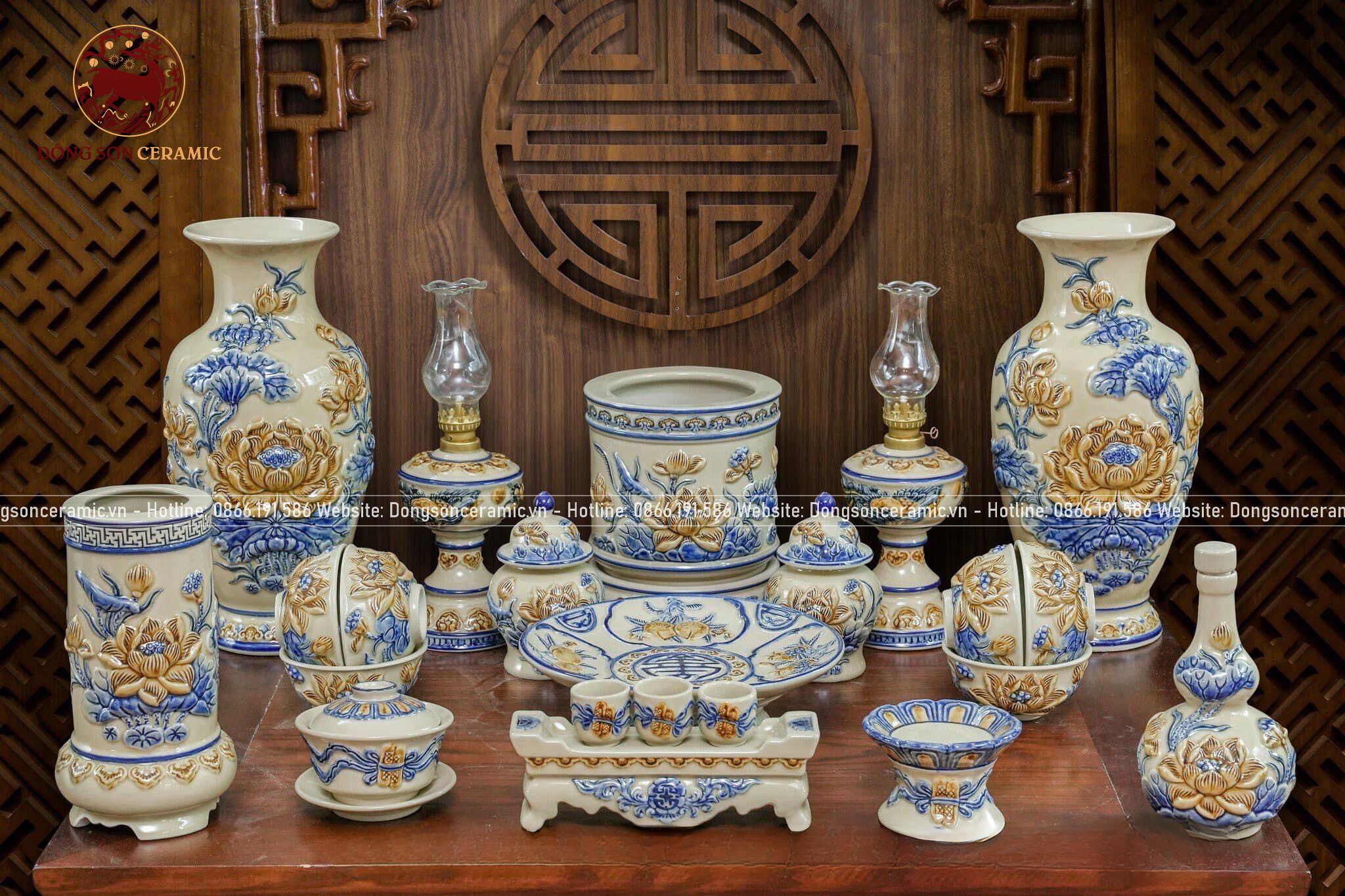 Bộ Đồ Thờ Bát Tràng họa tiết đắp nổi men hoàng thổ 19 vật phẩm | Bộ Thờ Cúng Gia Tiên đầy đủ