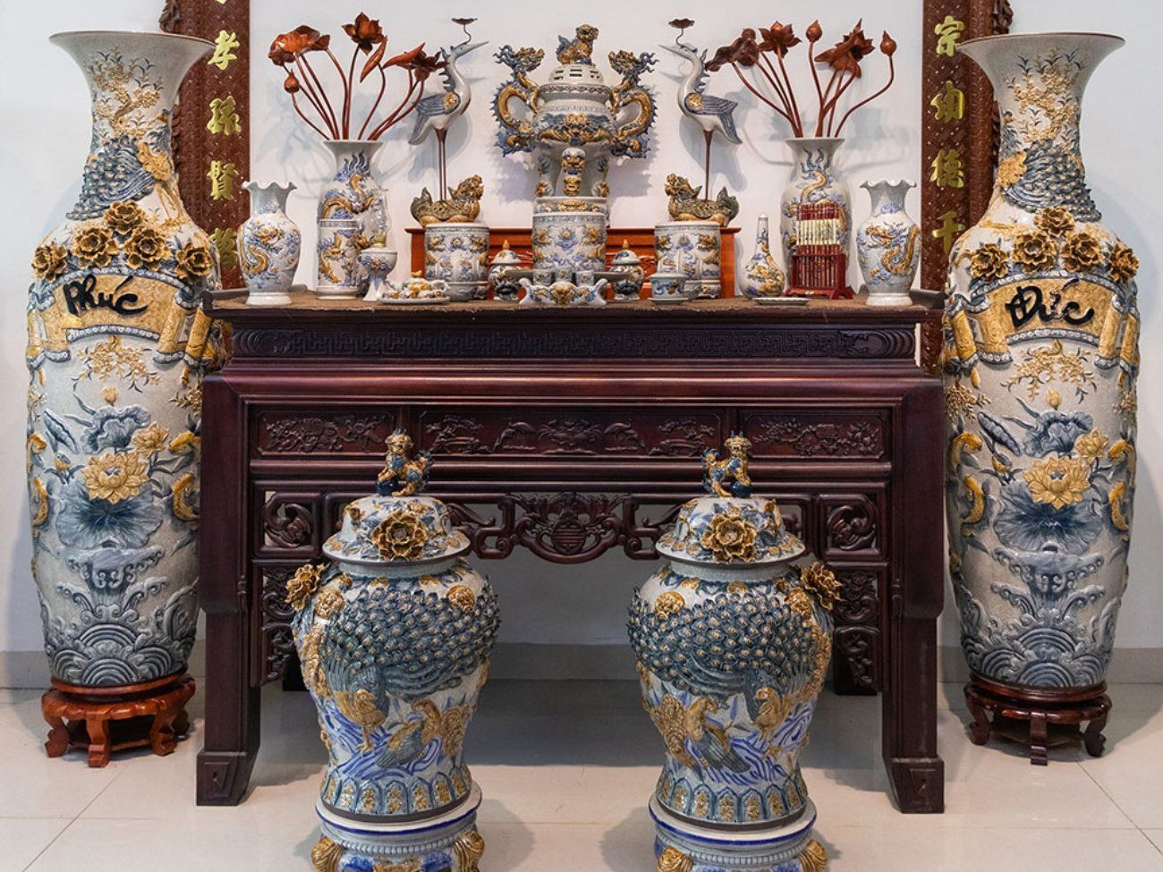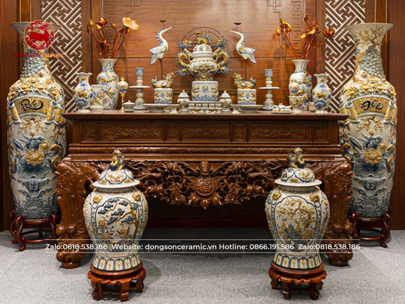Bộ Đồ Thờ Bát Tràng đầy đủ cung tiến từ đường men rạn đắp nổi Bát Tràng 29 vật phẩm | Bộ Thờ Cúng Gia Tiên Bát Tràng