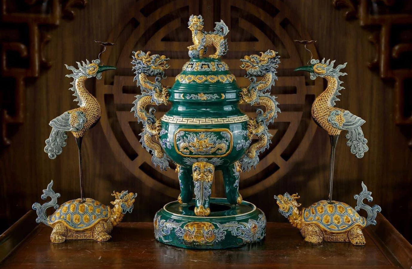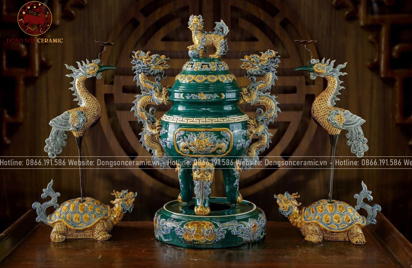 Bộ tam sự đỉnh hạc men xanh ngọc lục bảo kích thước cao 65cm đắp nổi