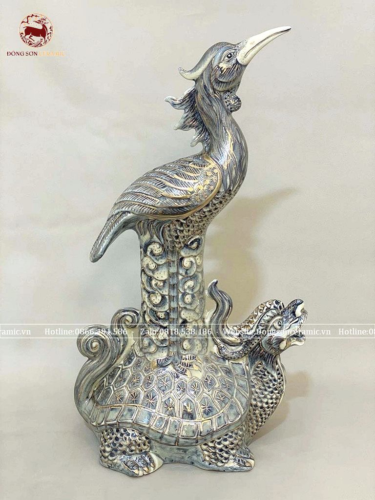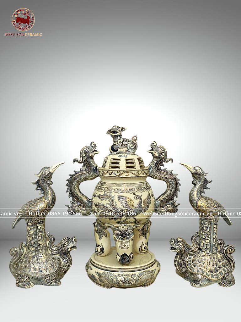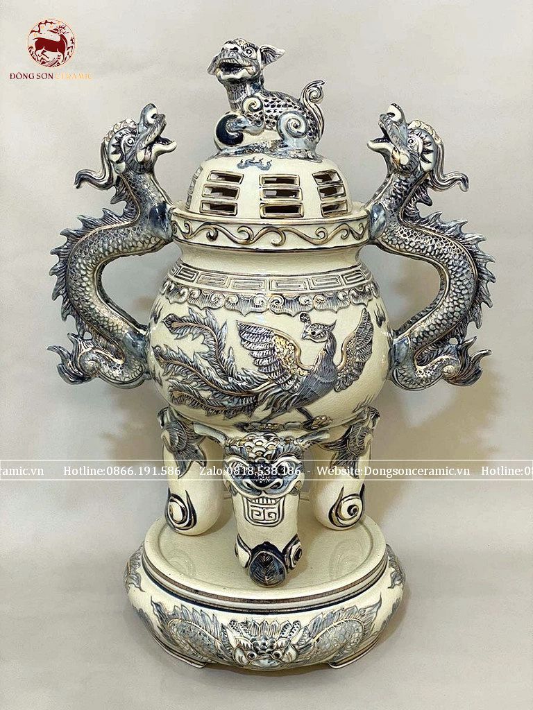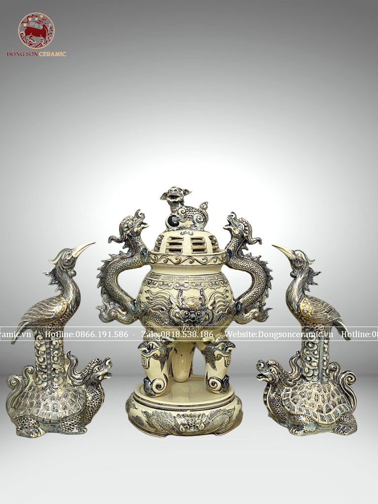 Bộ tam sự đỉnh hạc rồng như ý men lam cổ kích thước cao 52cm vẽ vàng kim