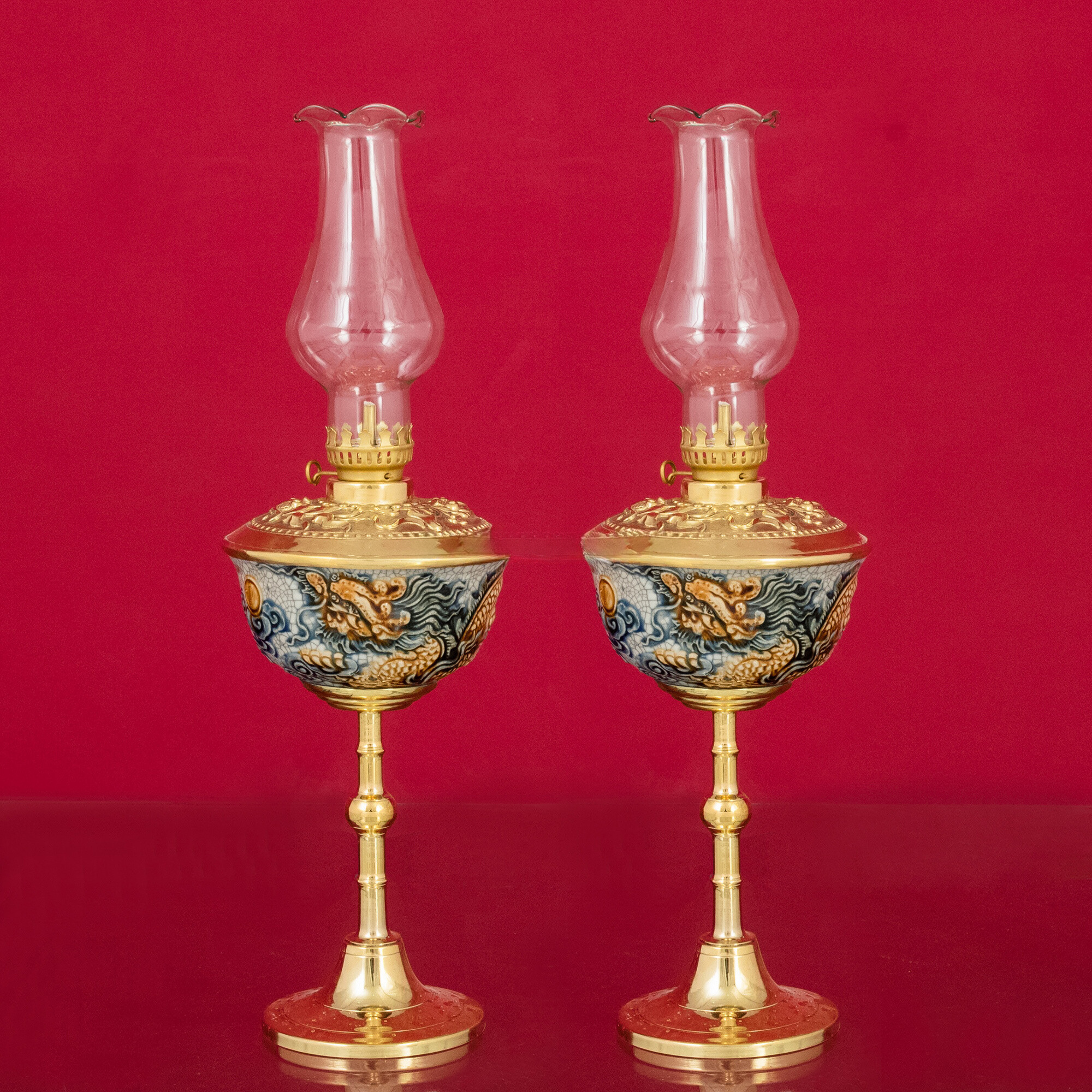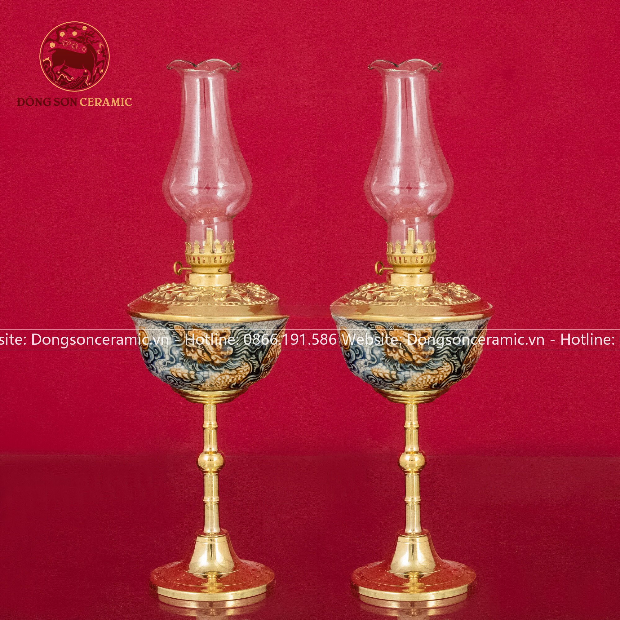 Đèn thờ gốm sứ Bát Tràng bát long chầu nguyệt chân đồng men rạn đắp nổi vẽ vàng