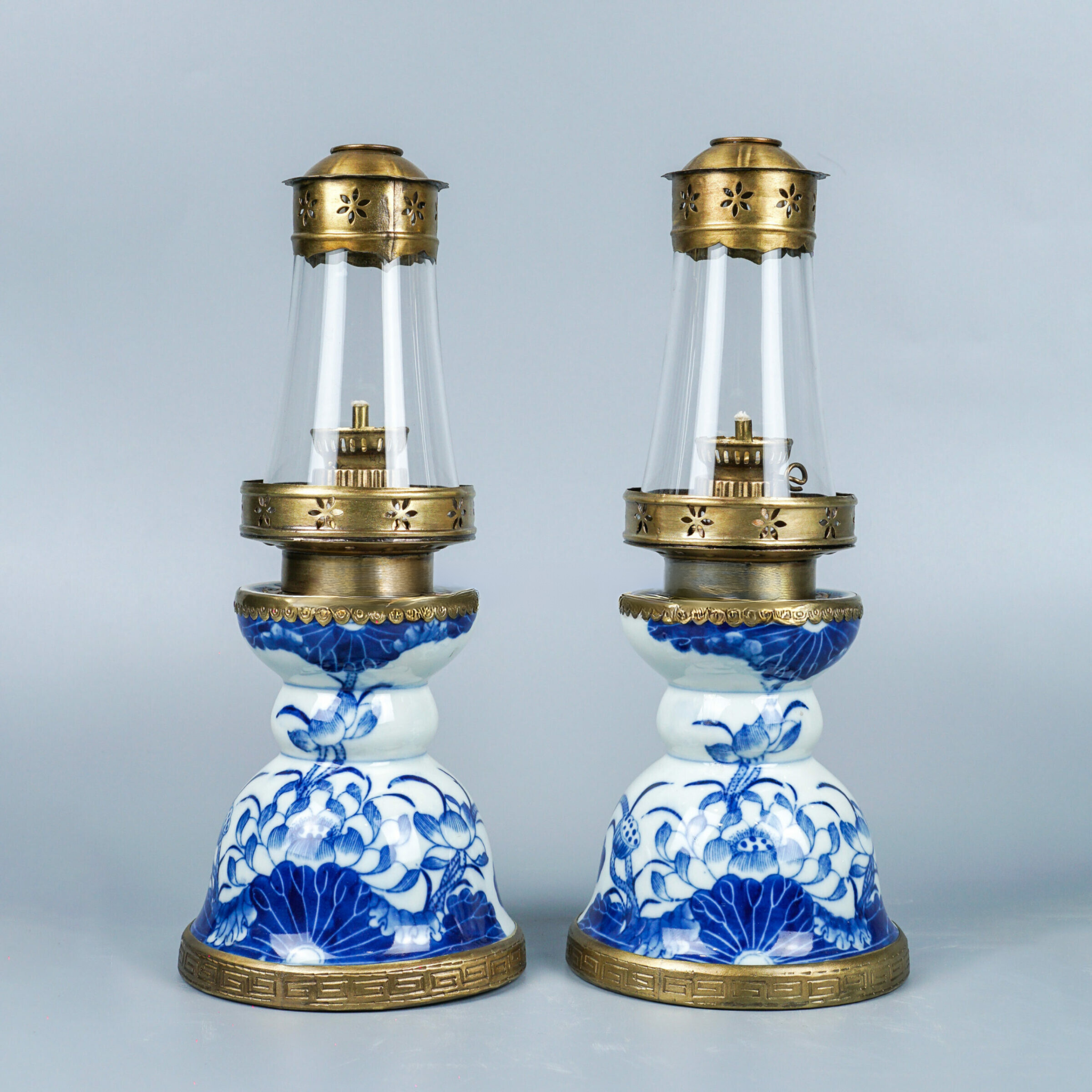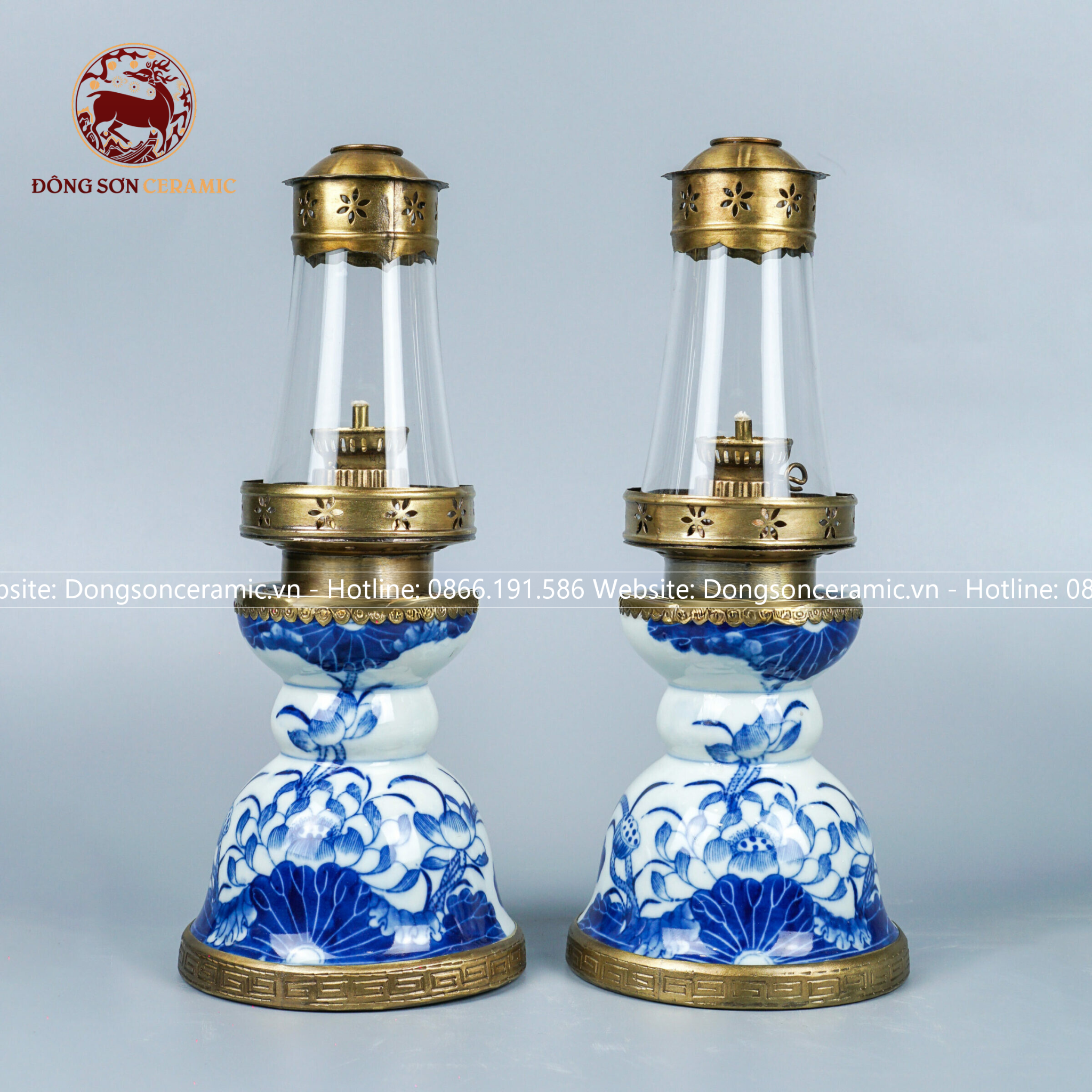 Đèn thờ gốm sứ Bát Tràng dáng tháp men chàm họa tiết hoa sen vẽ kĩ