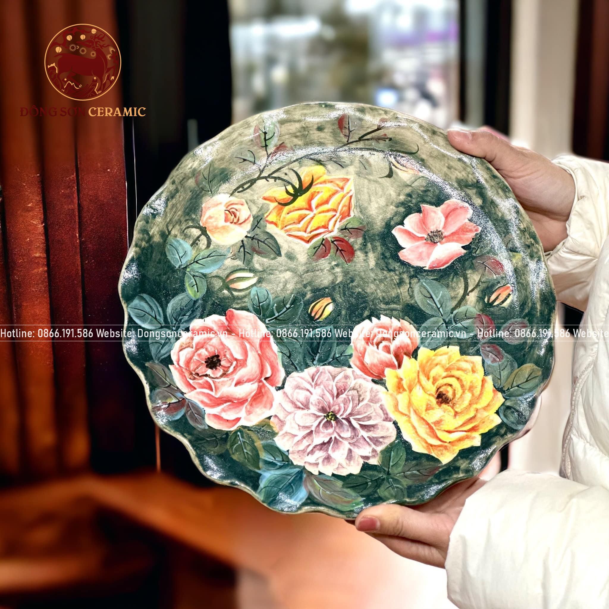 Đĩa cảnh Bát Tràng họa tiết hoa nở vẽ tay thủ công đường kính 35cm hàng vuốt tay | quà tặng cao cấp