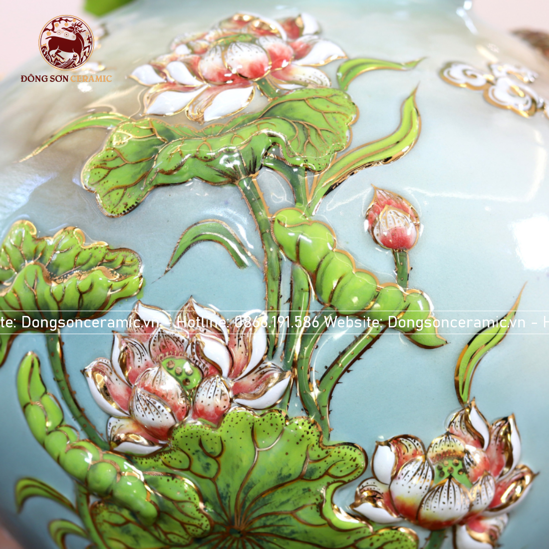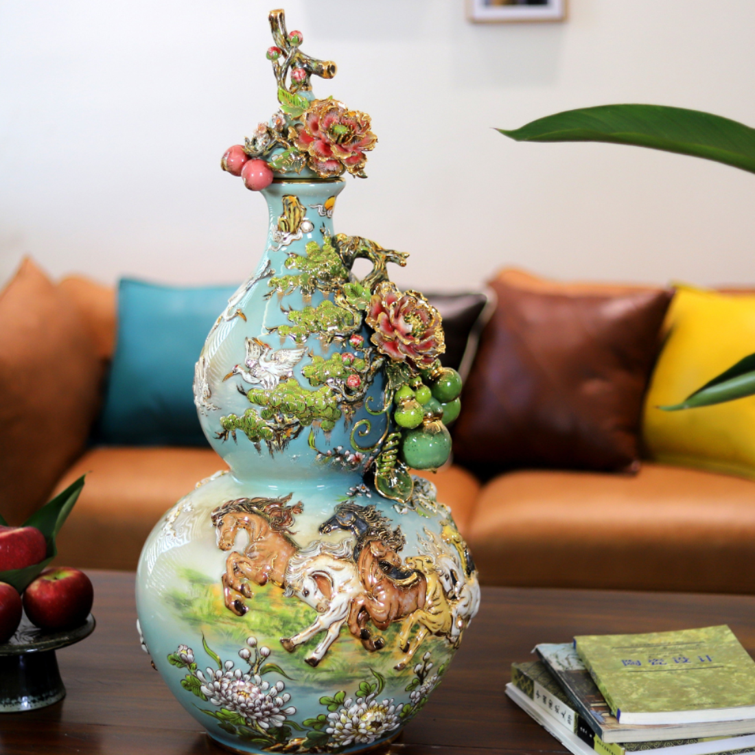 Hồ Lô Phong Thủy mã đáo thành công men sứ xanh đắp nổi chuẩn Bát Tràng kích thước 75cm | Quà Tặng Phong Thủy hồ lô gốm sứ