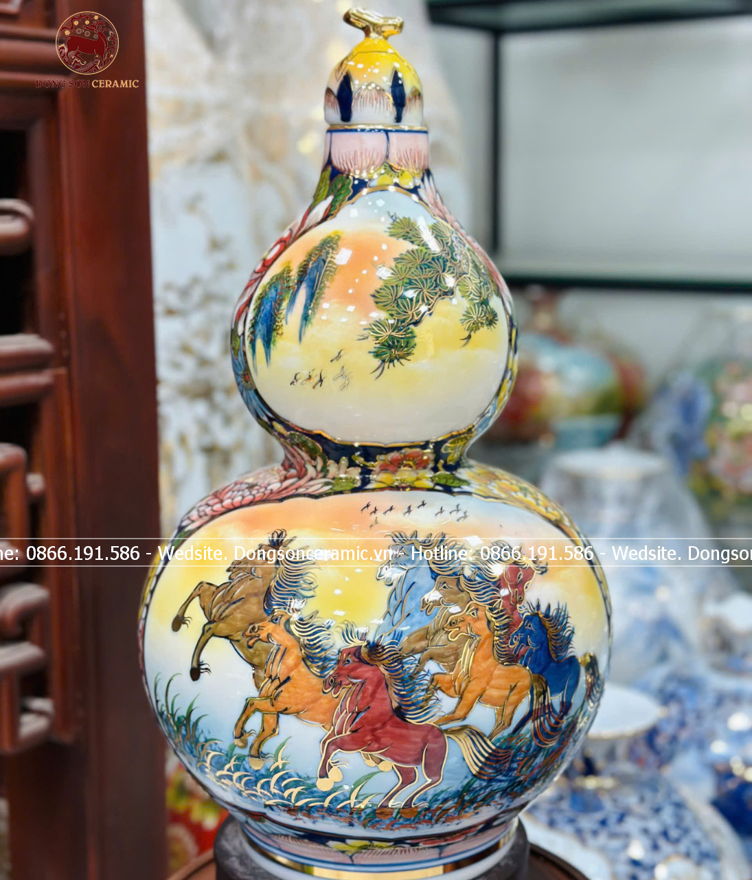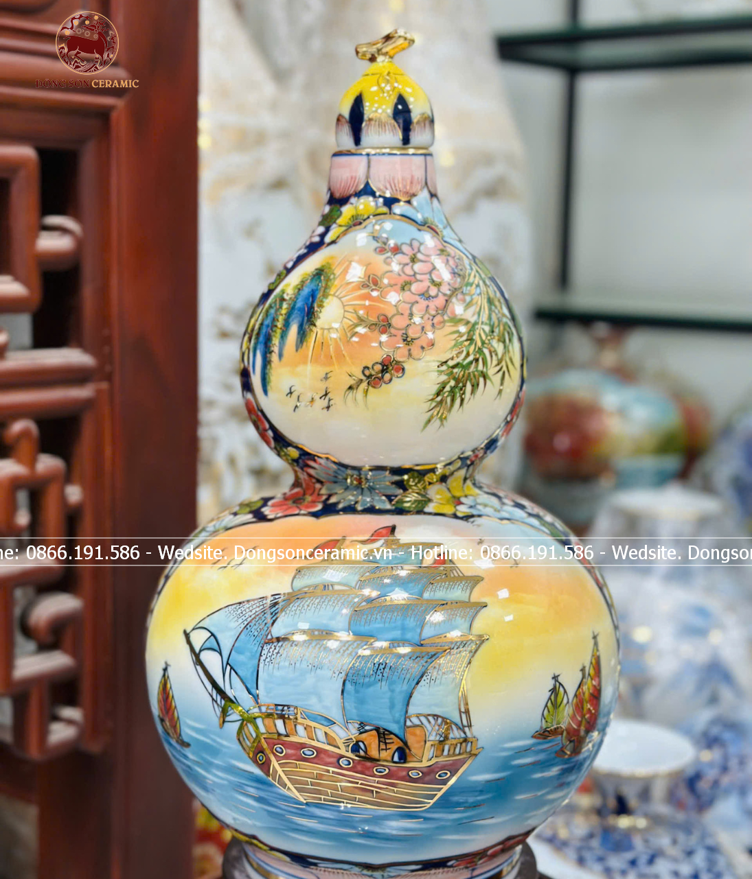 Hồ Lô Phong Thủy nhị cảnh thuận buồm mã đáo vẽ vàng 24k men màu chuẩn Bát Tràng kích thước 65cm | Quà Tặng Phong Thủy hồ lô gốm sứ
