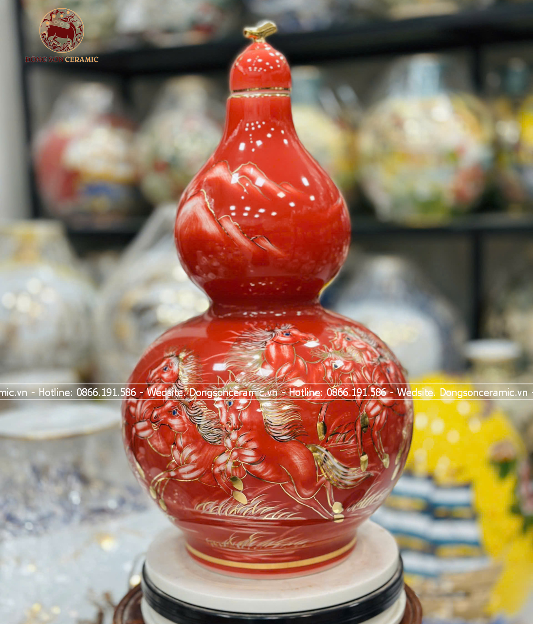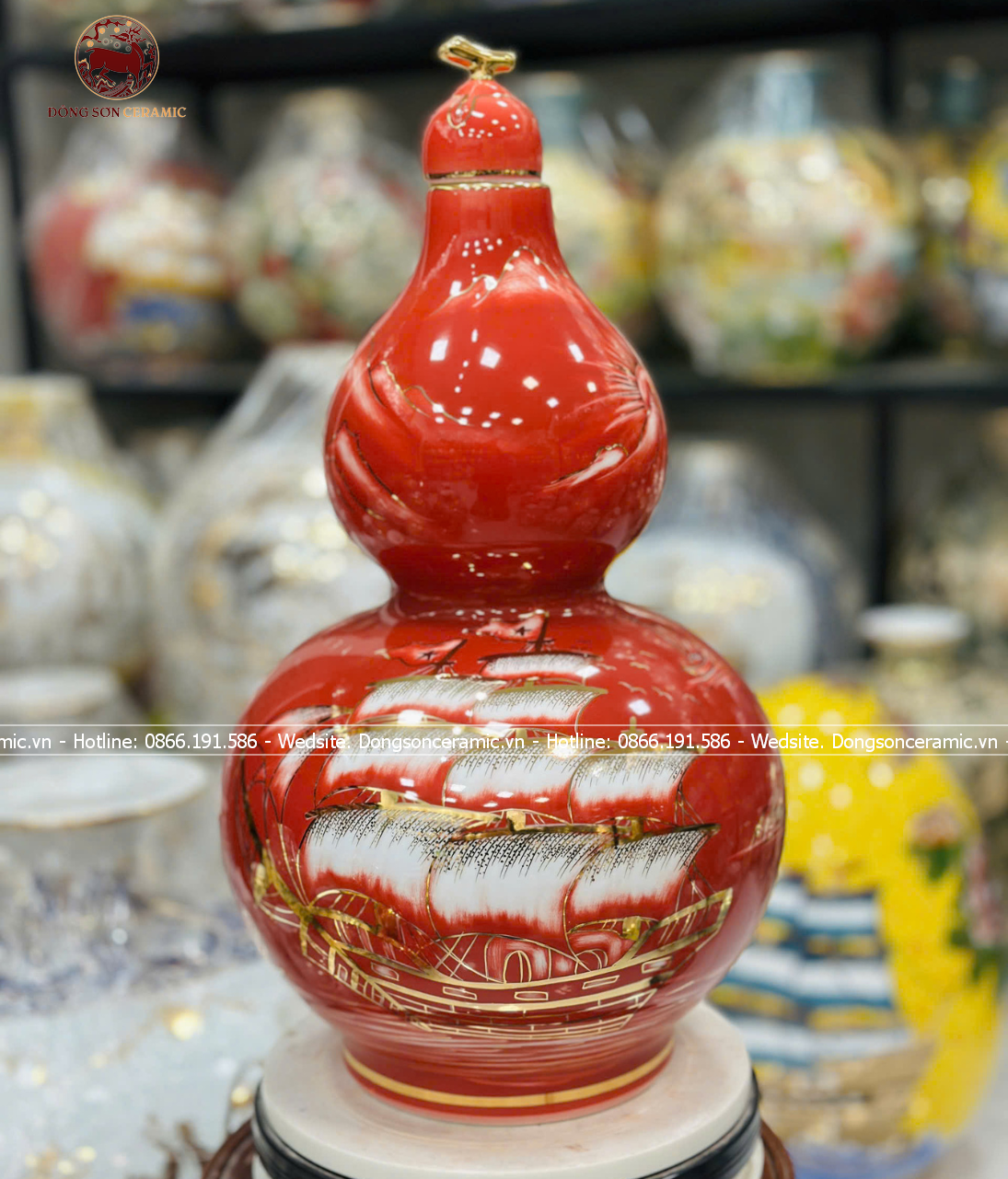 Hồ Lô Phong Thủy thuận buồm xuôi gió vẽ vàng 24k men đỏ chuẩn Bát Tràng kích thước 65cm | Quà Tặng Phong Thủy hồ lô gốm sứ