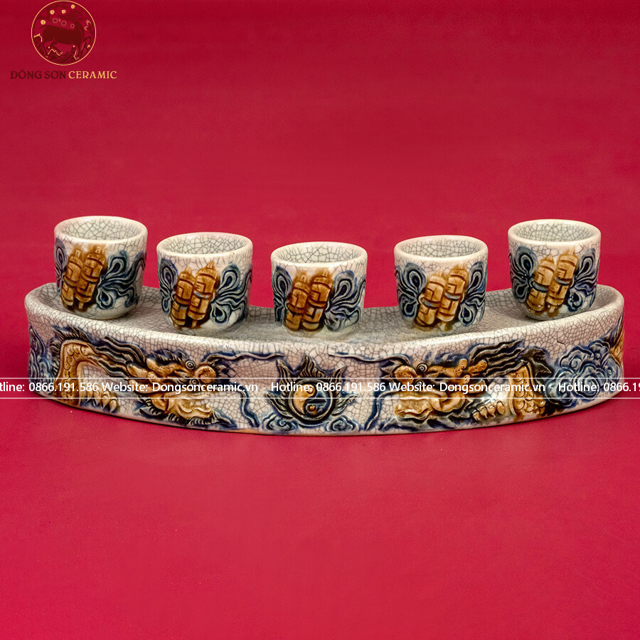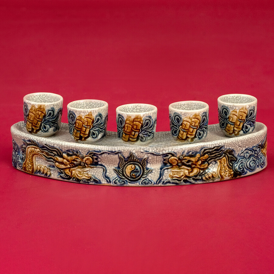 Kỷ ngai thờ bộ 5 cong gốm sứ Bát Tràng men rạn họa tiết song long đắp nổi