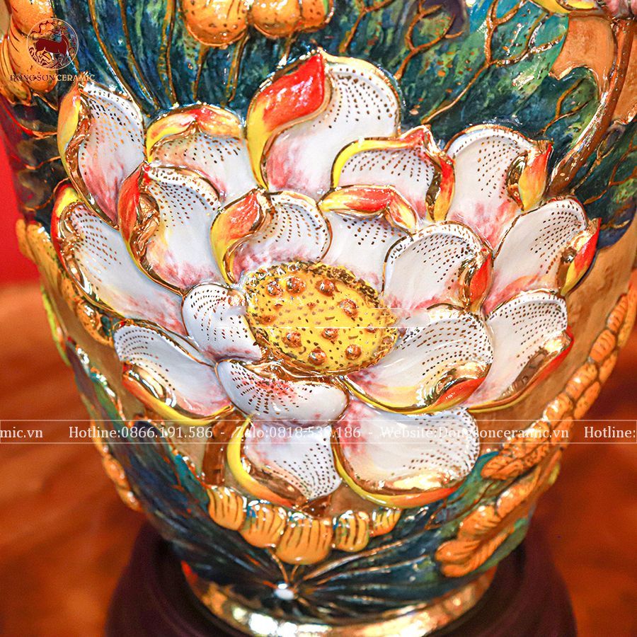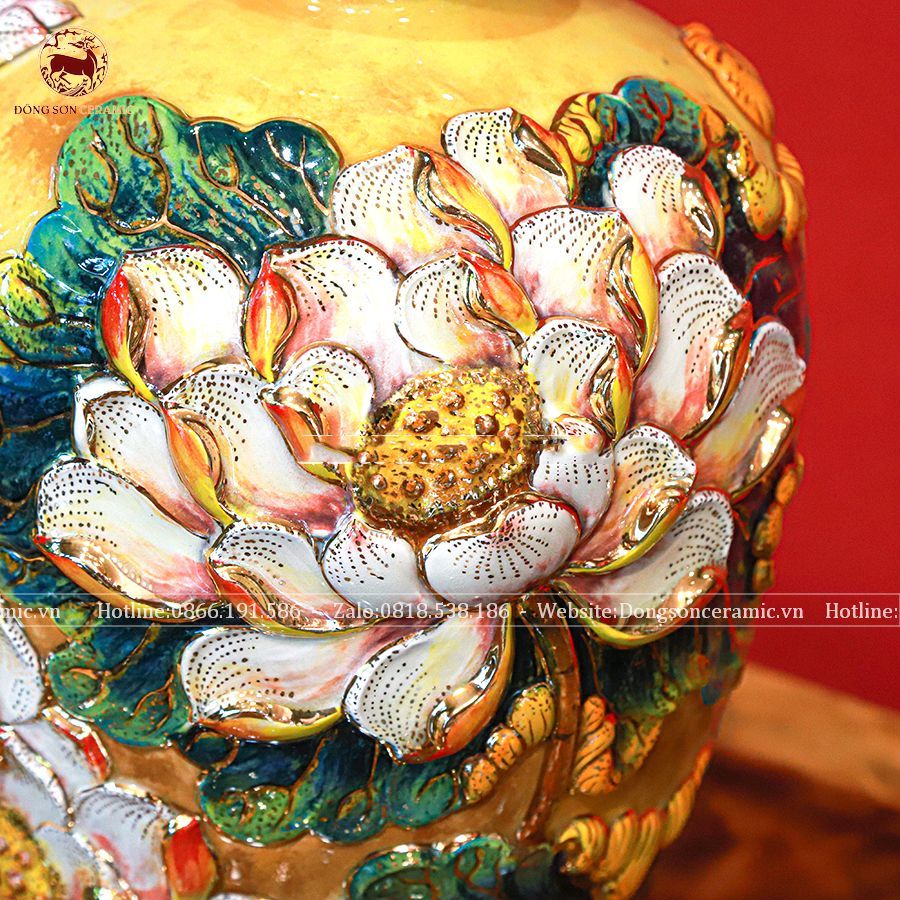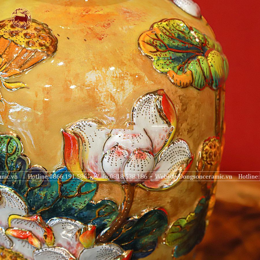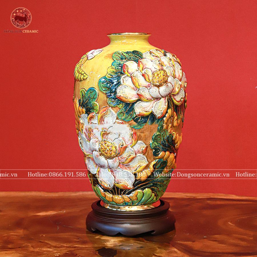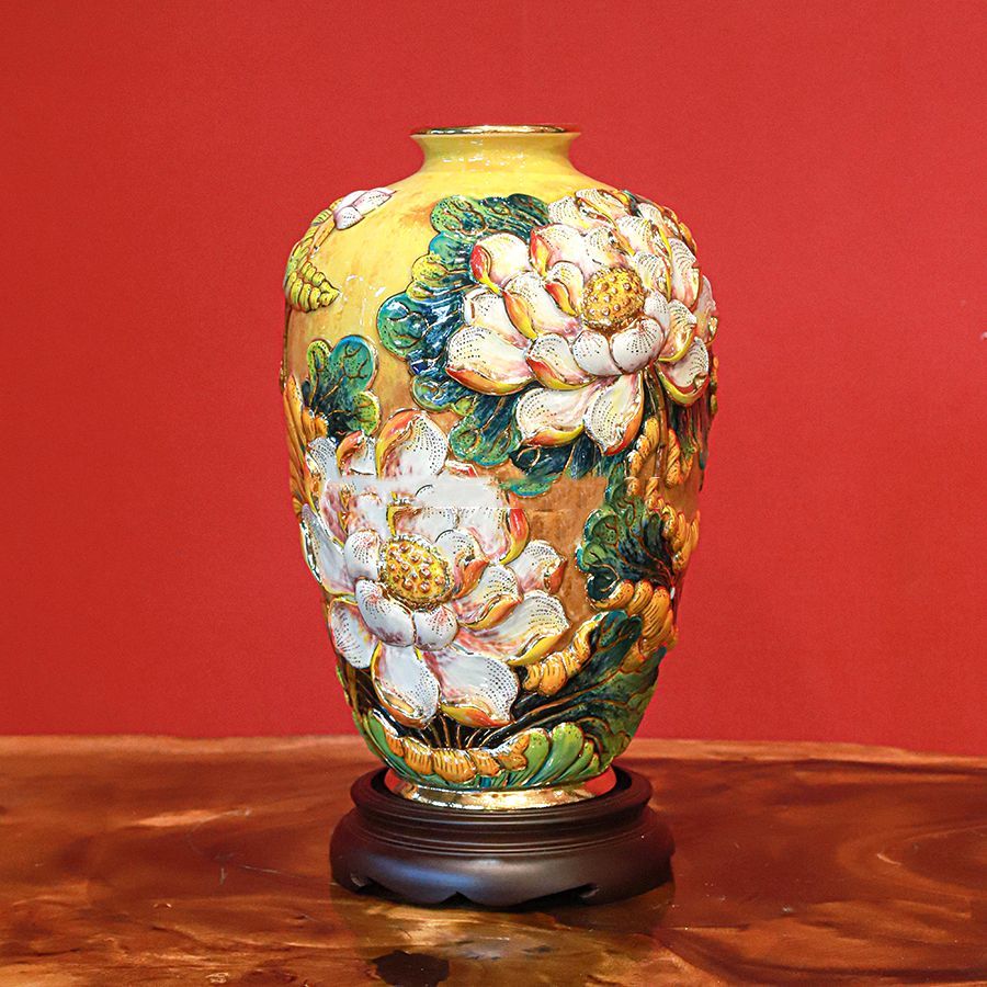 Lọ hoa cát tường bằng sứ men vàng kích thước cao 35cm đắp nổi vẽ vàng