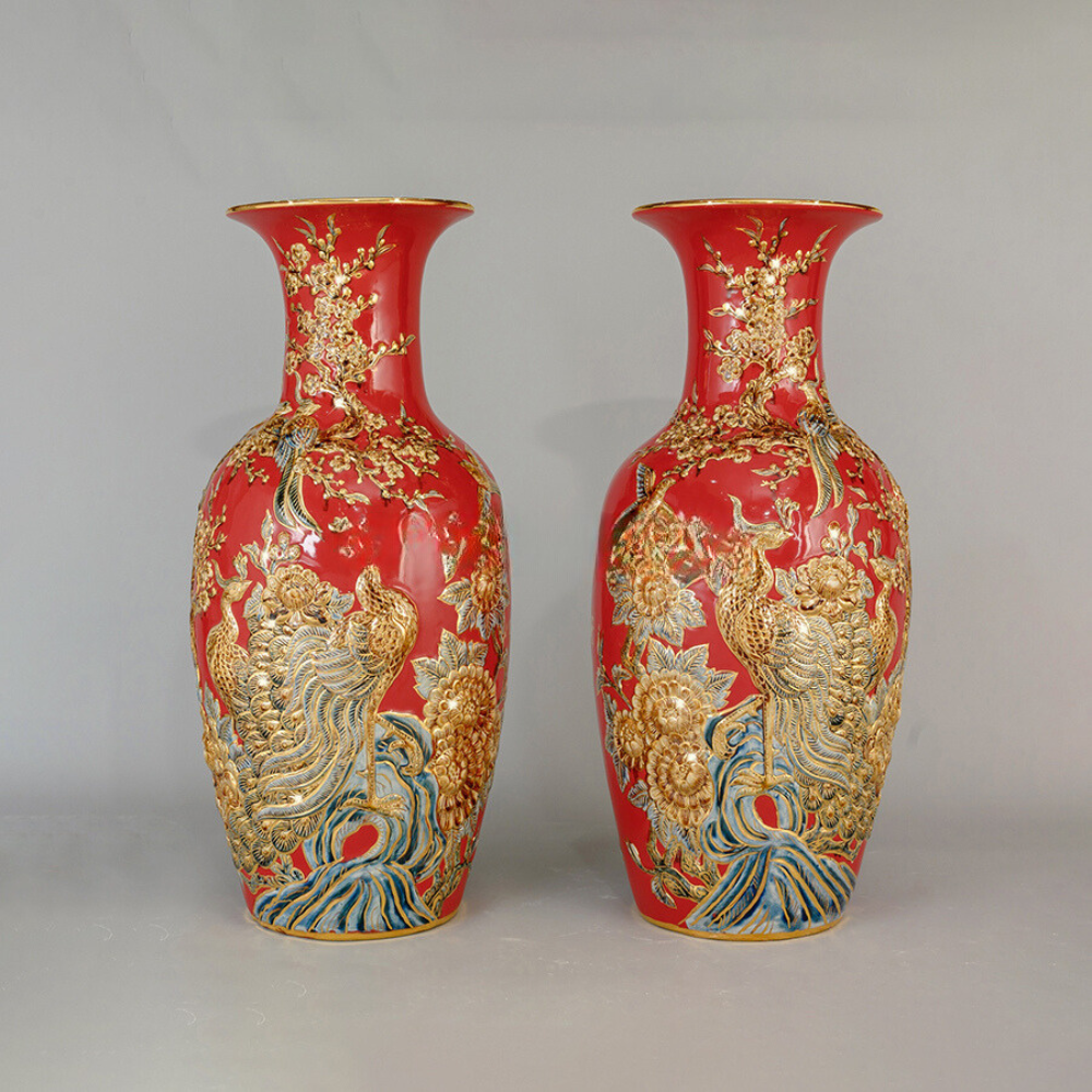 Lọ hoa công danh phú quý men sứ đỏ kích thước cao 50cm đắp nổi vẽ vàng