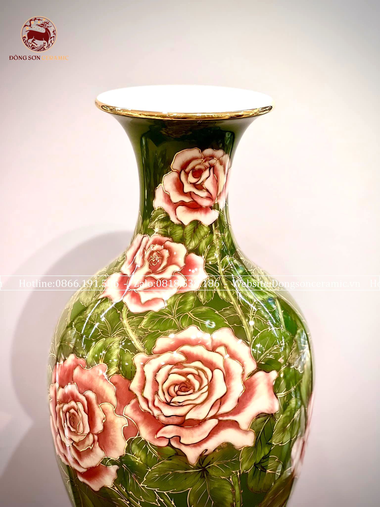 Lọ hoa hồng bằng sứ kích thước cao 50cm vẽ họa tiết 3D phủ men xanh lá
