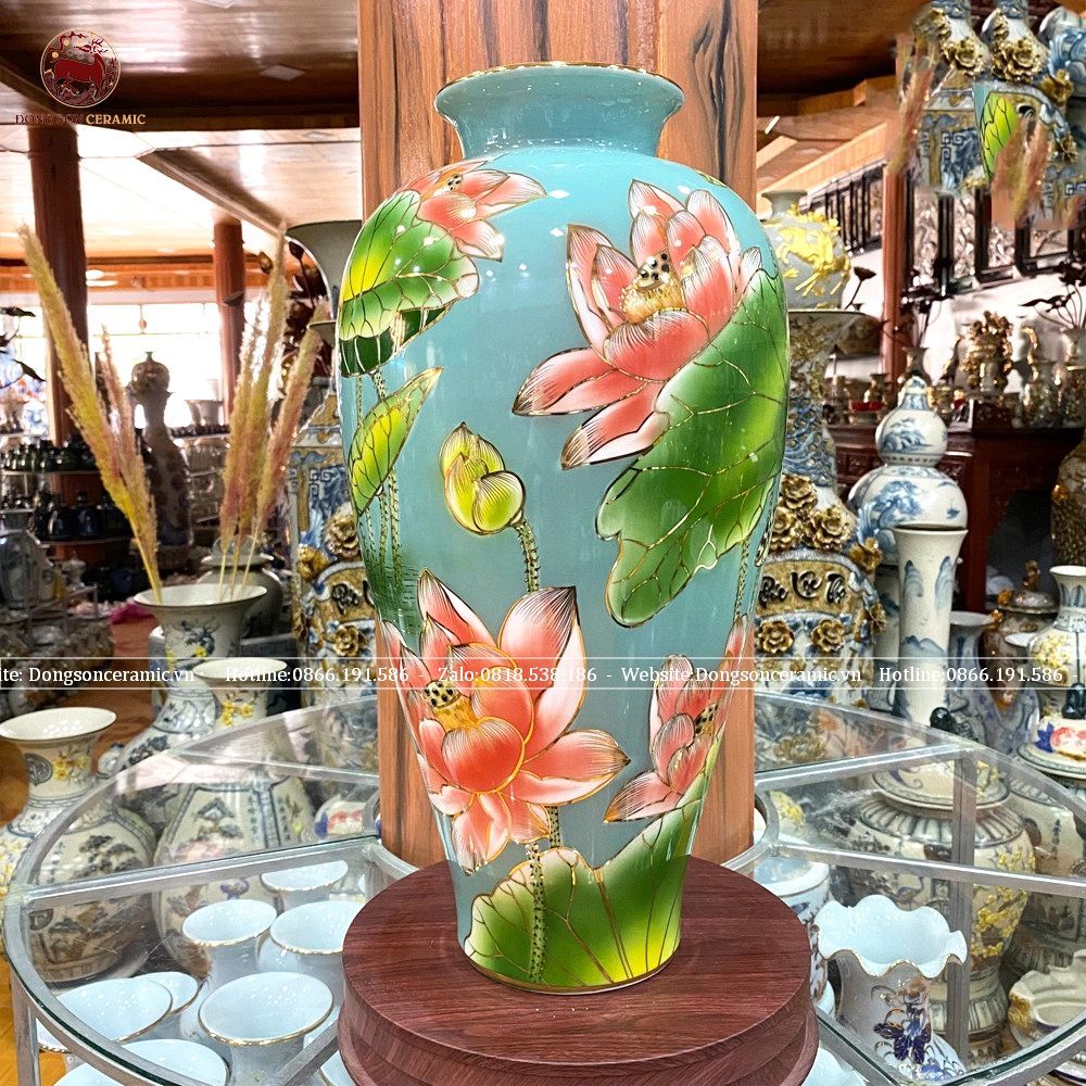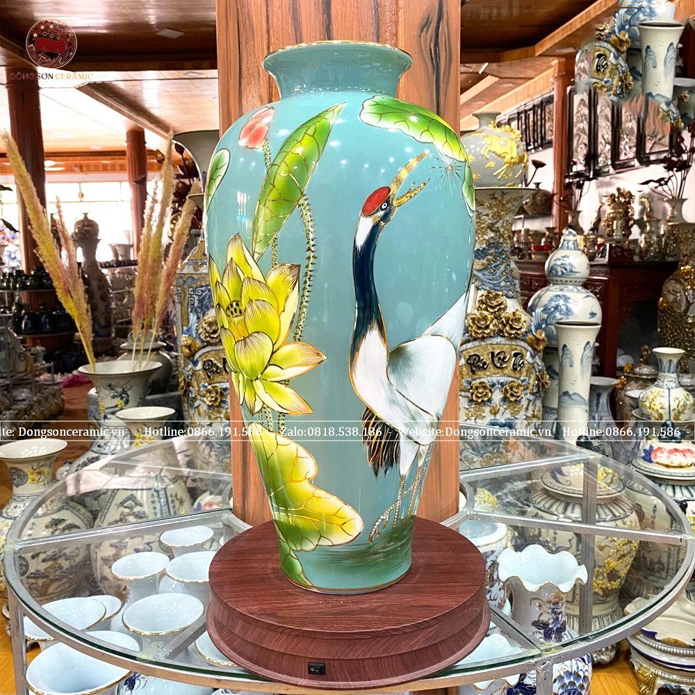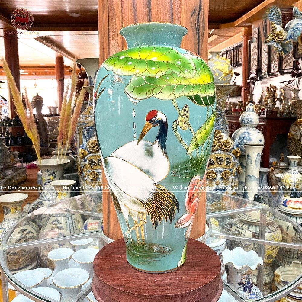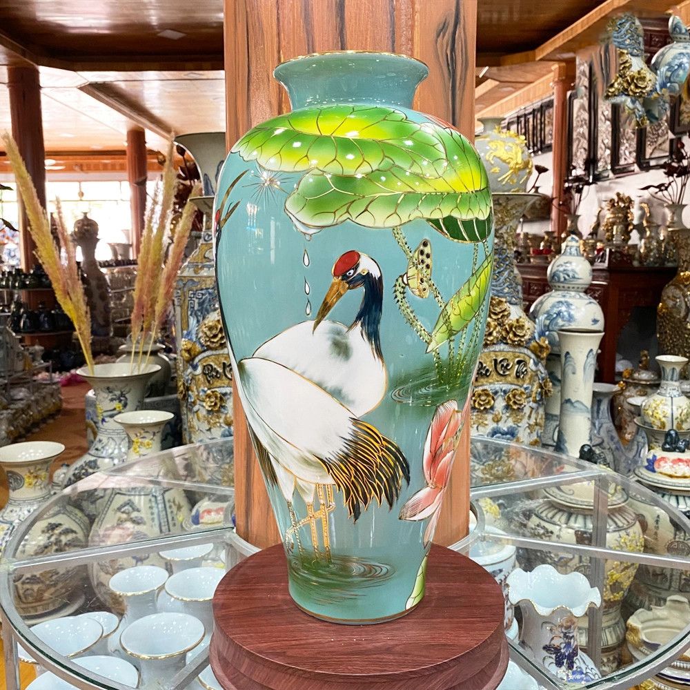 Lọ hoa sen hạc dáng trụ bằng sứ kích thước cao 50cm họa tiết vẽ 3D phủ men xanh ngọc vẽ vàng kim
