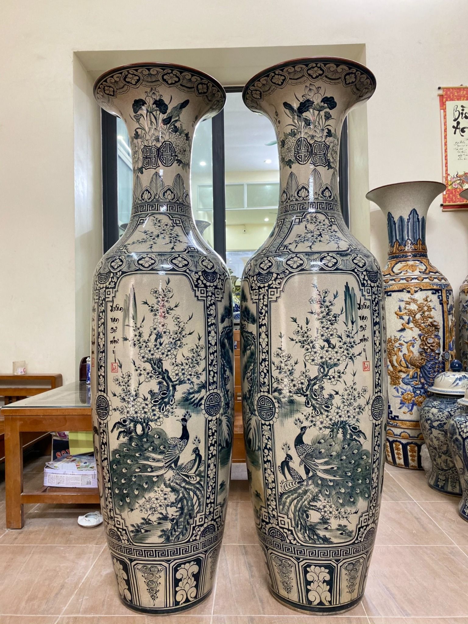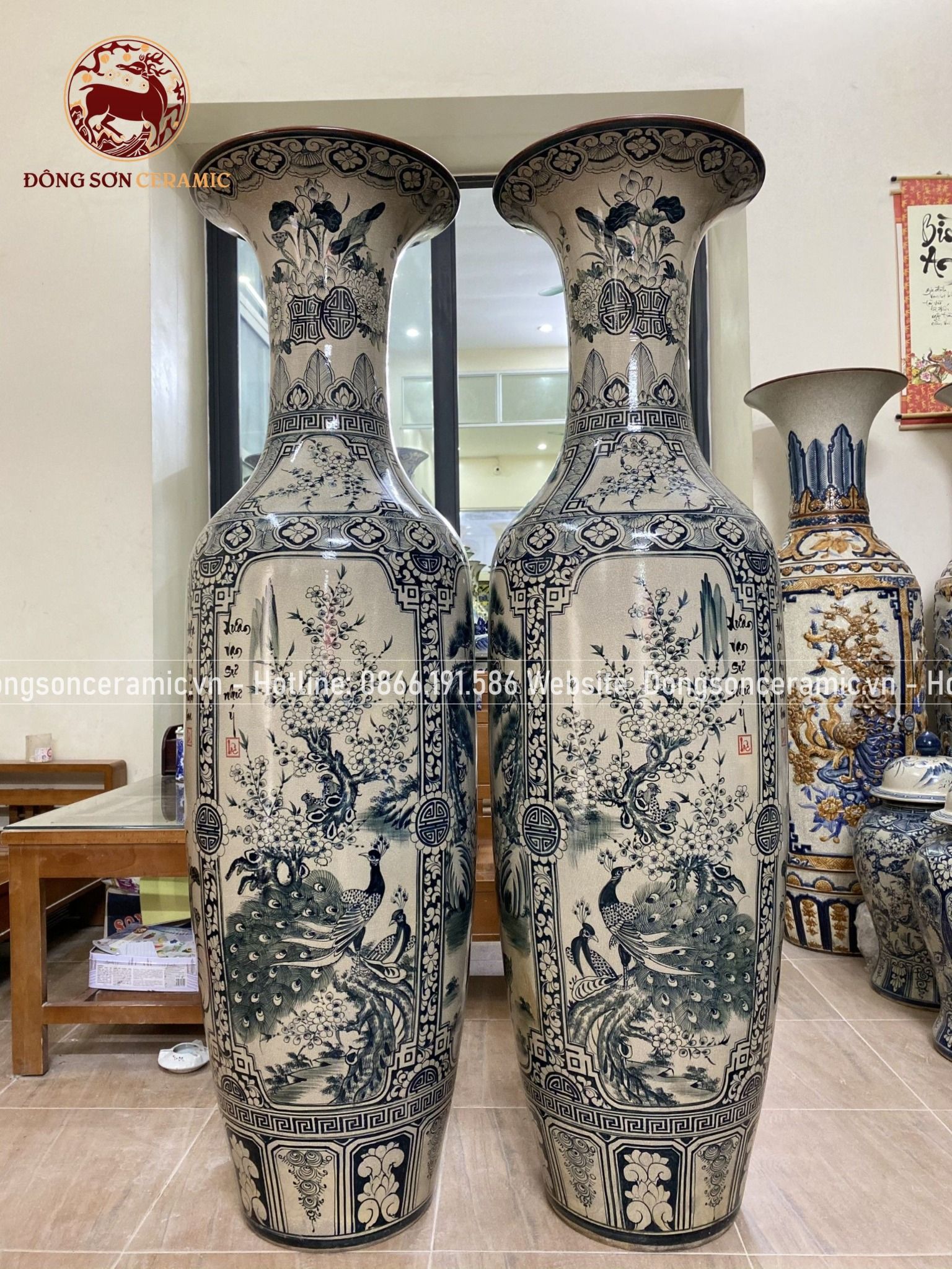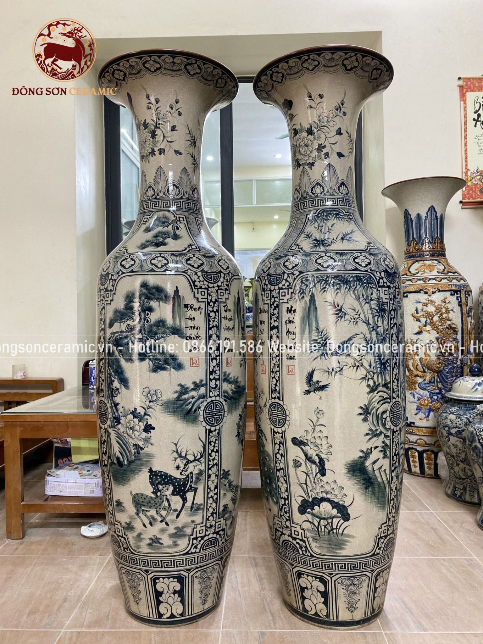 Lục Bình Bát Tràng họa tiết tứ cảnh men rạn vẽ chàm kích thước 1m6 vẽ kĩ | Quà Tặng Cao Cấp lục bình gốm