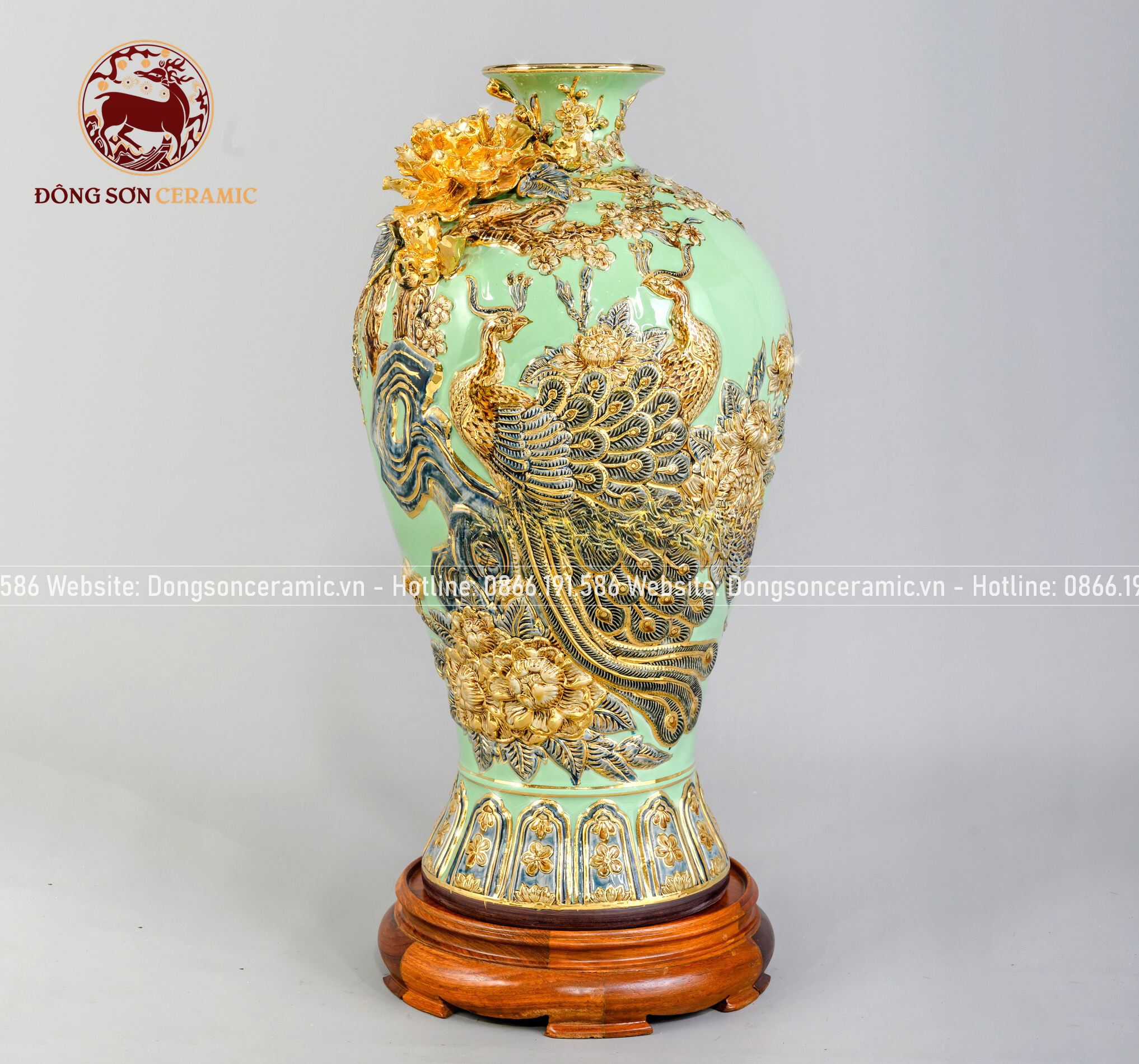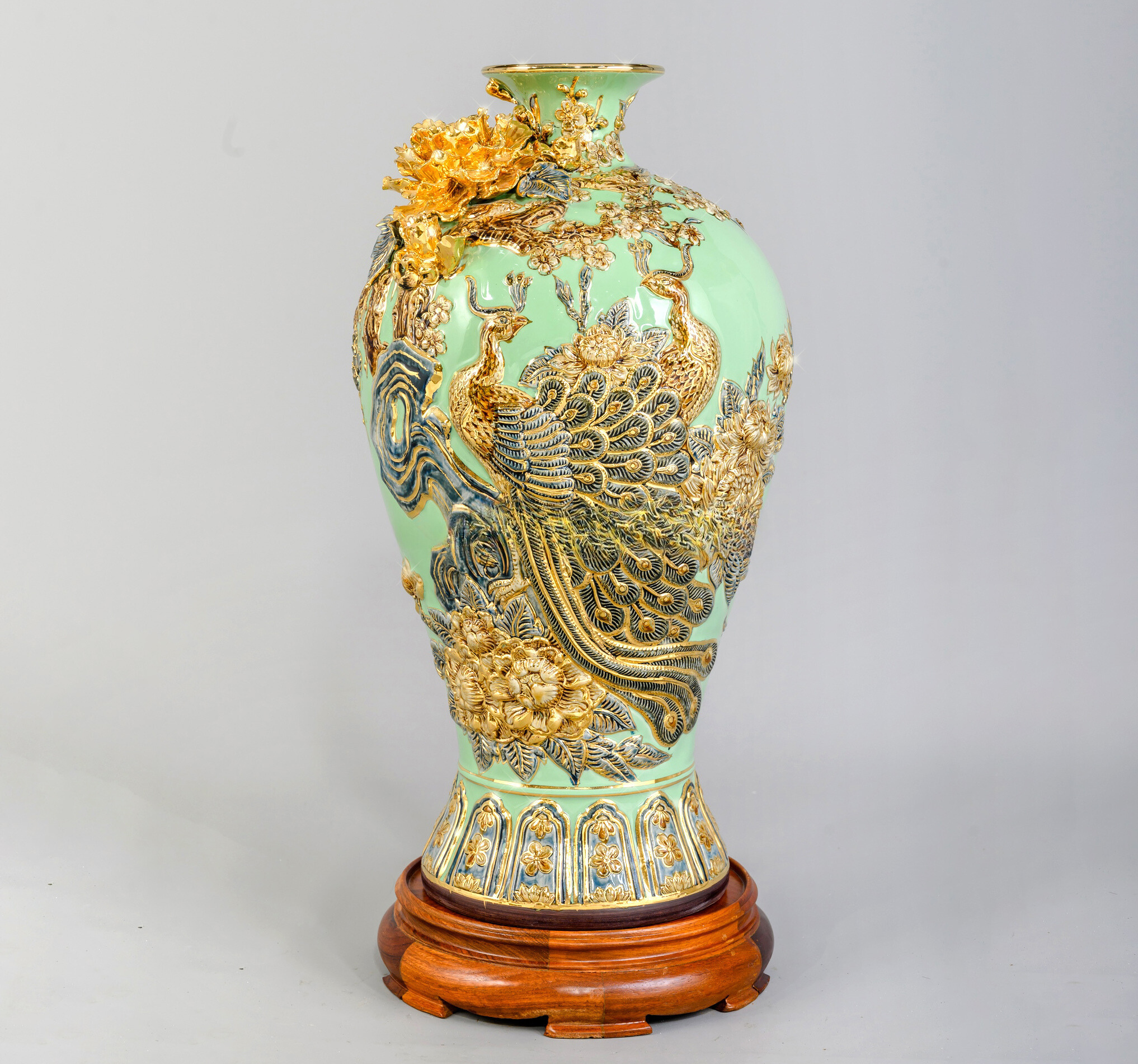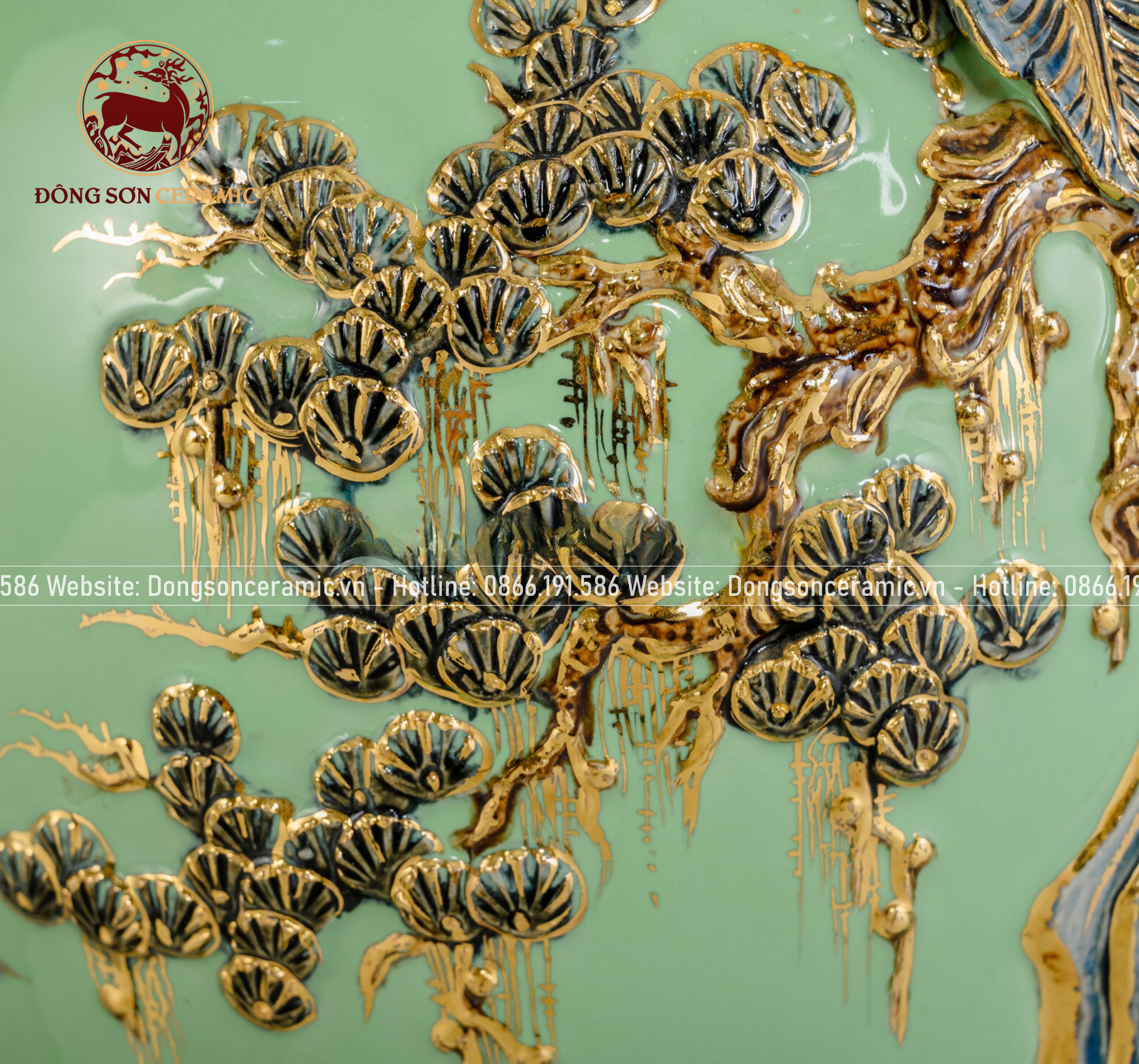 Mai bình công danh phú quý men sứ xanh ngọc kích thước cao 48cm đắp nổi vẽ vàng 24k