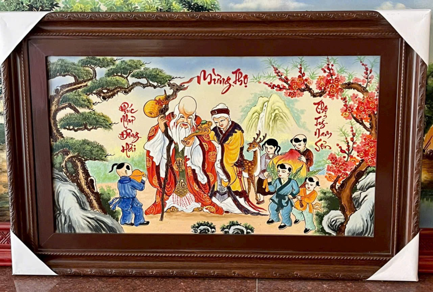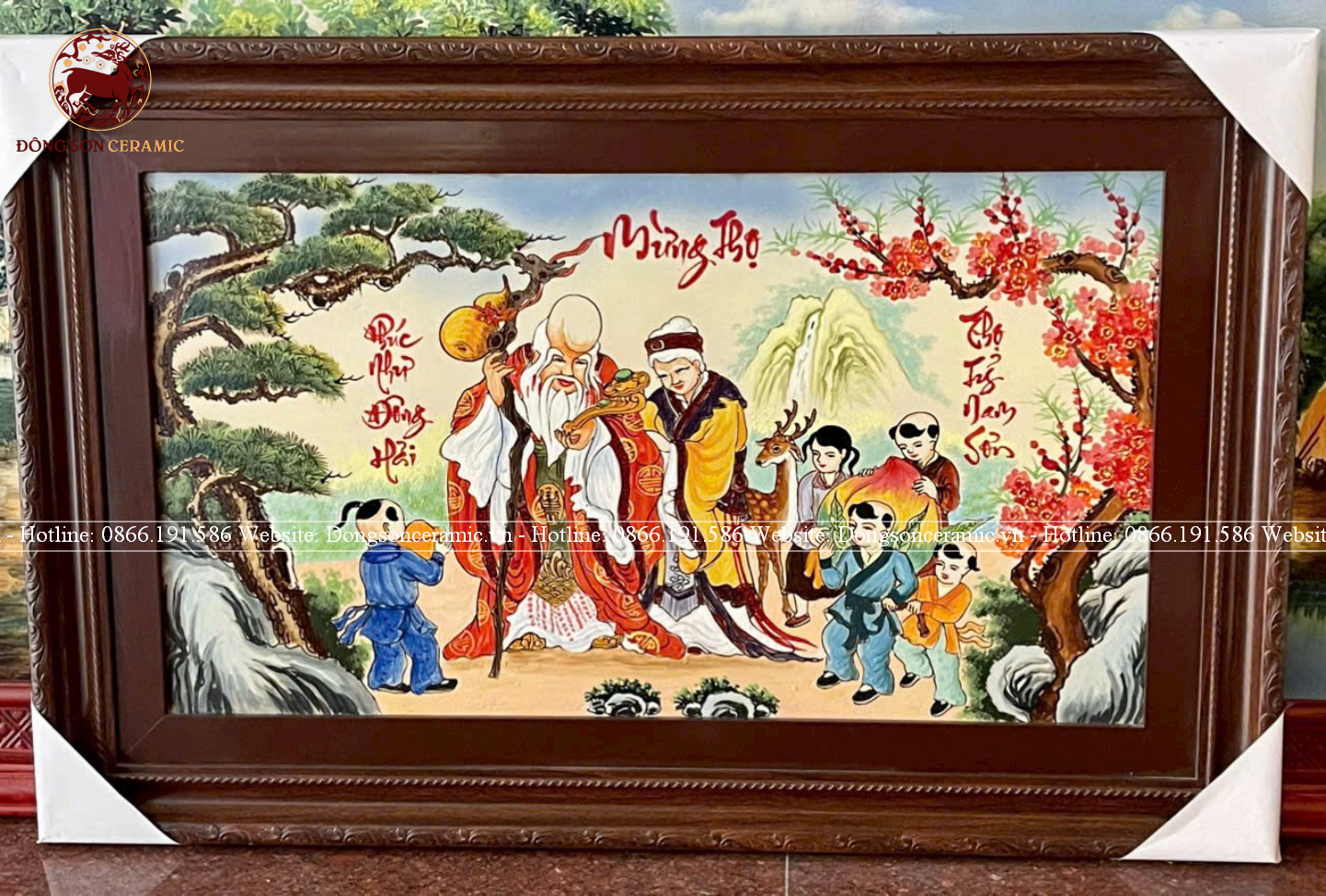 Tranh gốm sứ Bát Tràng vẽ mừng thọ ông bà kích thước 90 cm x 60cm