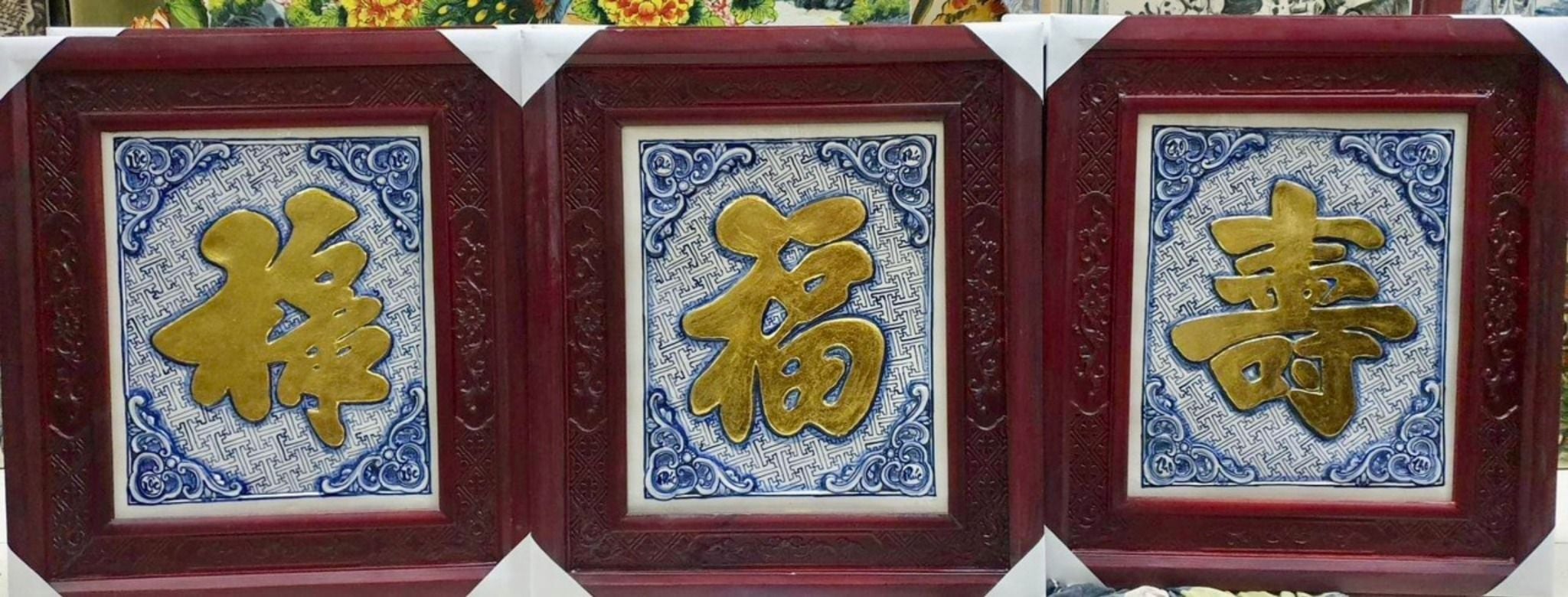 Tranh gốm sứ đắp nổi chữ hán Phúc Lộc Thọ dát vàng khung gỗ kích thước 55cm x 48cm