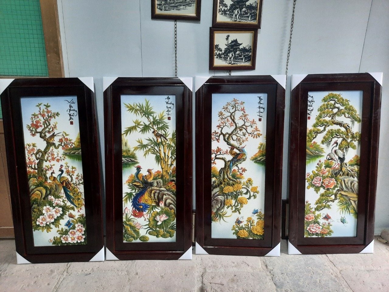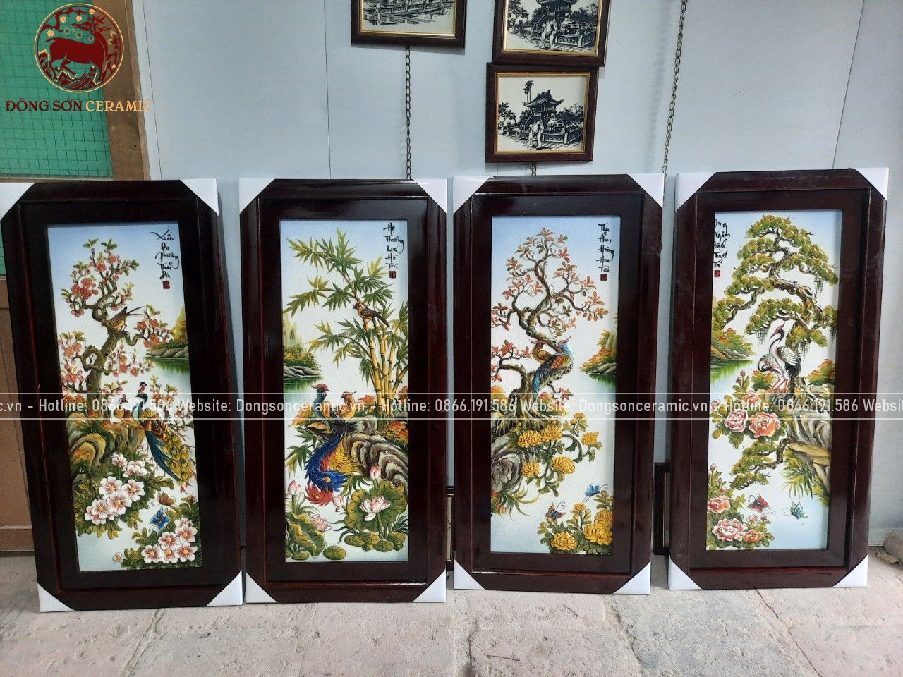 Tranh tứ quý gốm Bát Tràng đắp nổi bốn mùa xuân hạ thu đông kích thước 93cm x 43cm | Quà Tặng Bố tranh gốm tứ quý