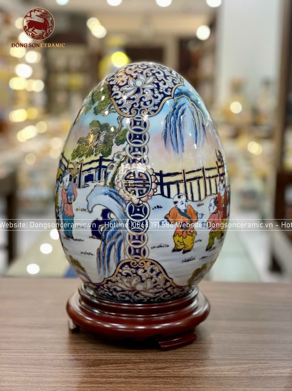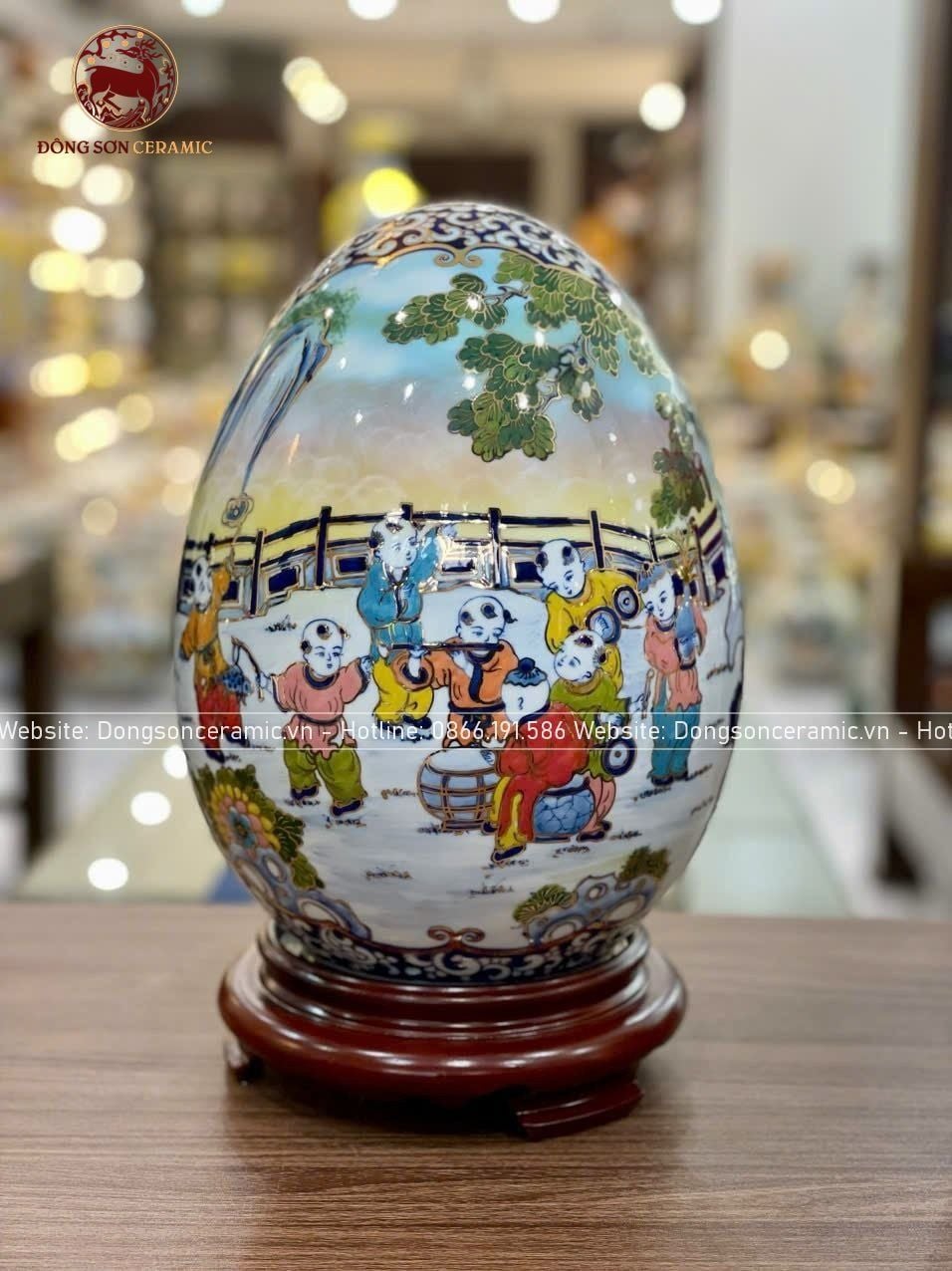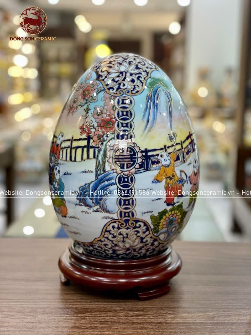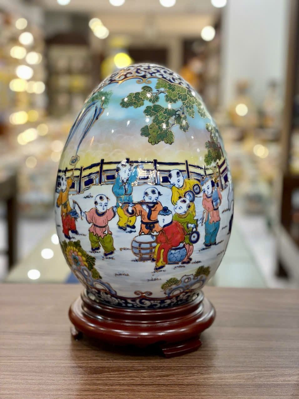 Trứng phong thủy gốm Bát Tràng bách nhi đồ men màu vẽ vàng kích thước 45cm