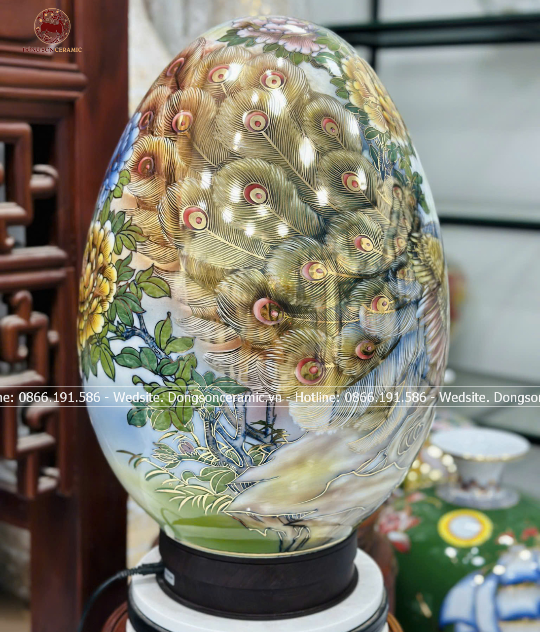 Trứng phong thủy gốm Bát Tràng công danh phú quý nền trắng vẽ vàng 24k kích thước 60cm