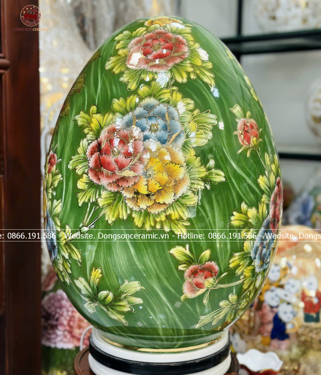 Trứng phong thủy gốm Bát Tràng công danh phú quý nền xanh ngọc vẽ vàng 24k kích thước 60cm