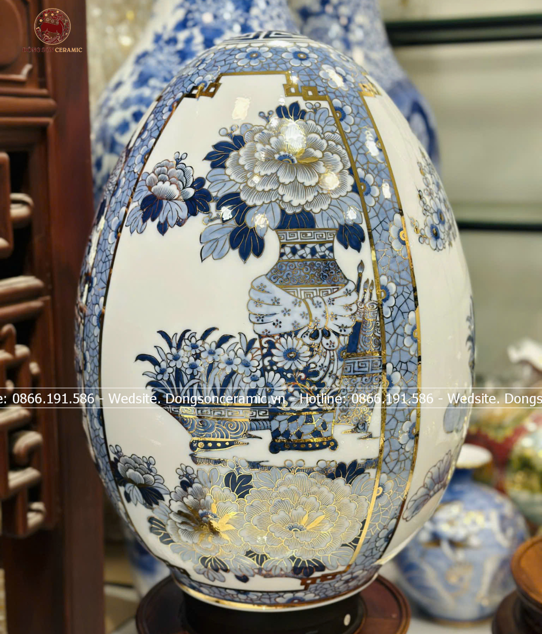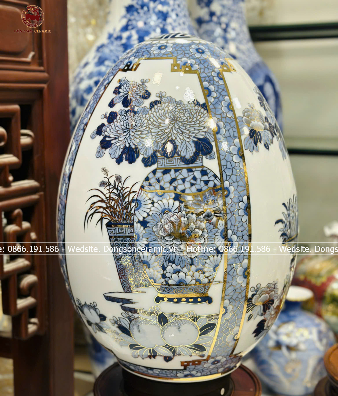 Trứng phong thủy gốm Bát Tràng tứ quý cổ đồ nền trắng vẽ lam vẽ vàng 24k kích thước 60cm
